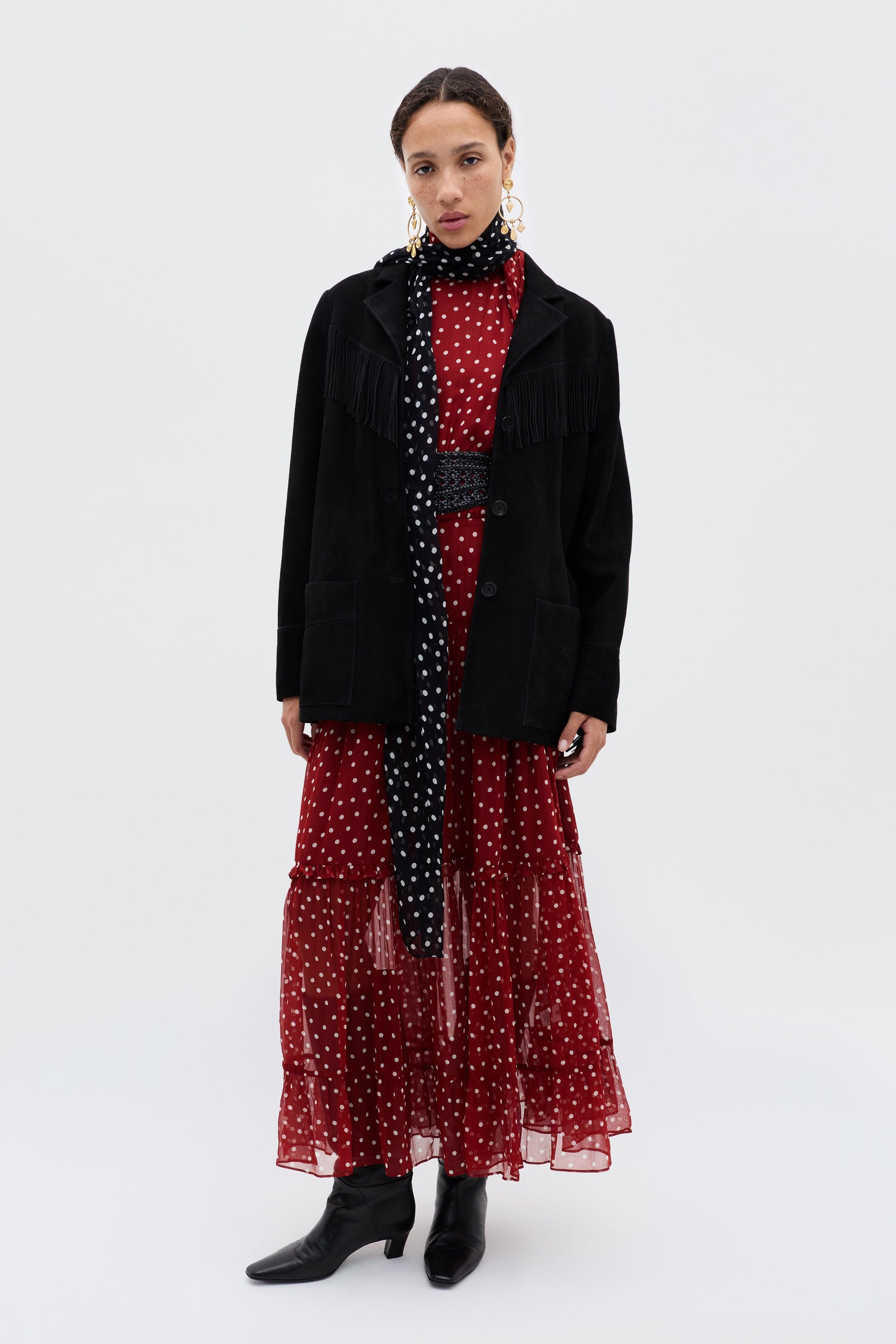 Crafted from a delicate crinkled chiffon, the Abi Midi Dress is a timeless style made for some of life’s most special moments. The tiered midi skirt and elegant scarf-style neckline evokes romanticism and whimsy. The Layla Dot Red print evokes a bombshell energy and pairs like a dream with statement gold jewellery.
