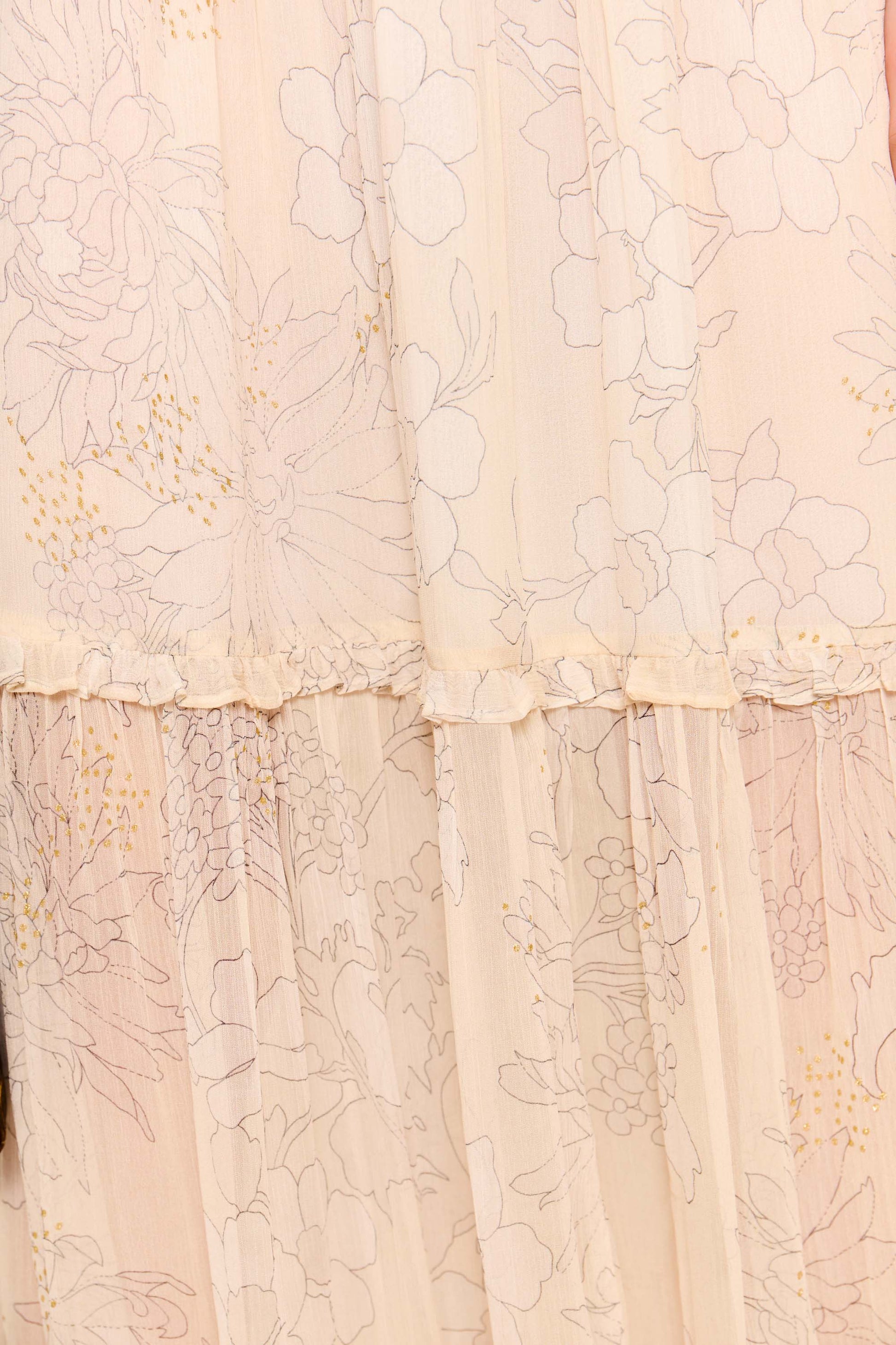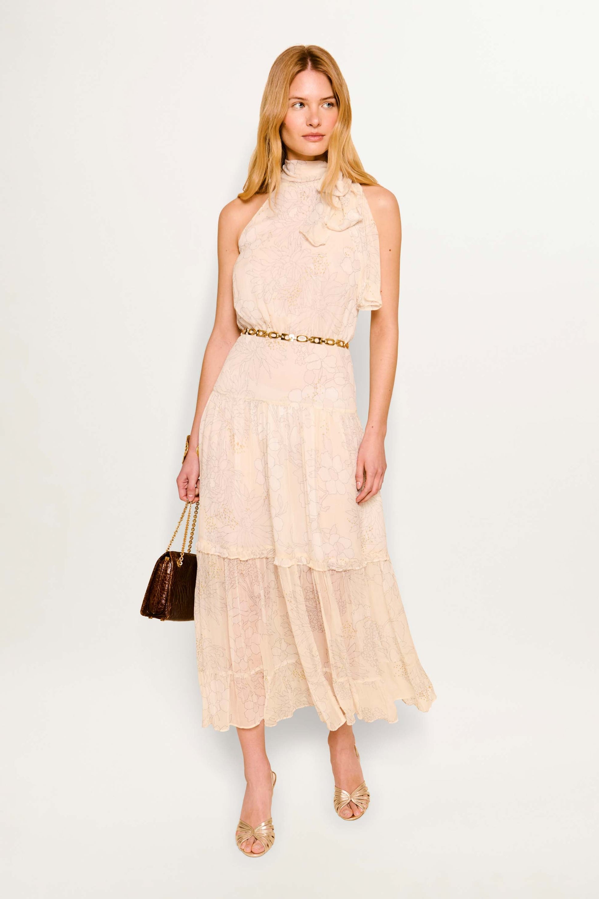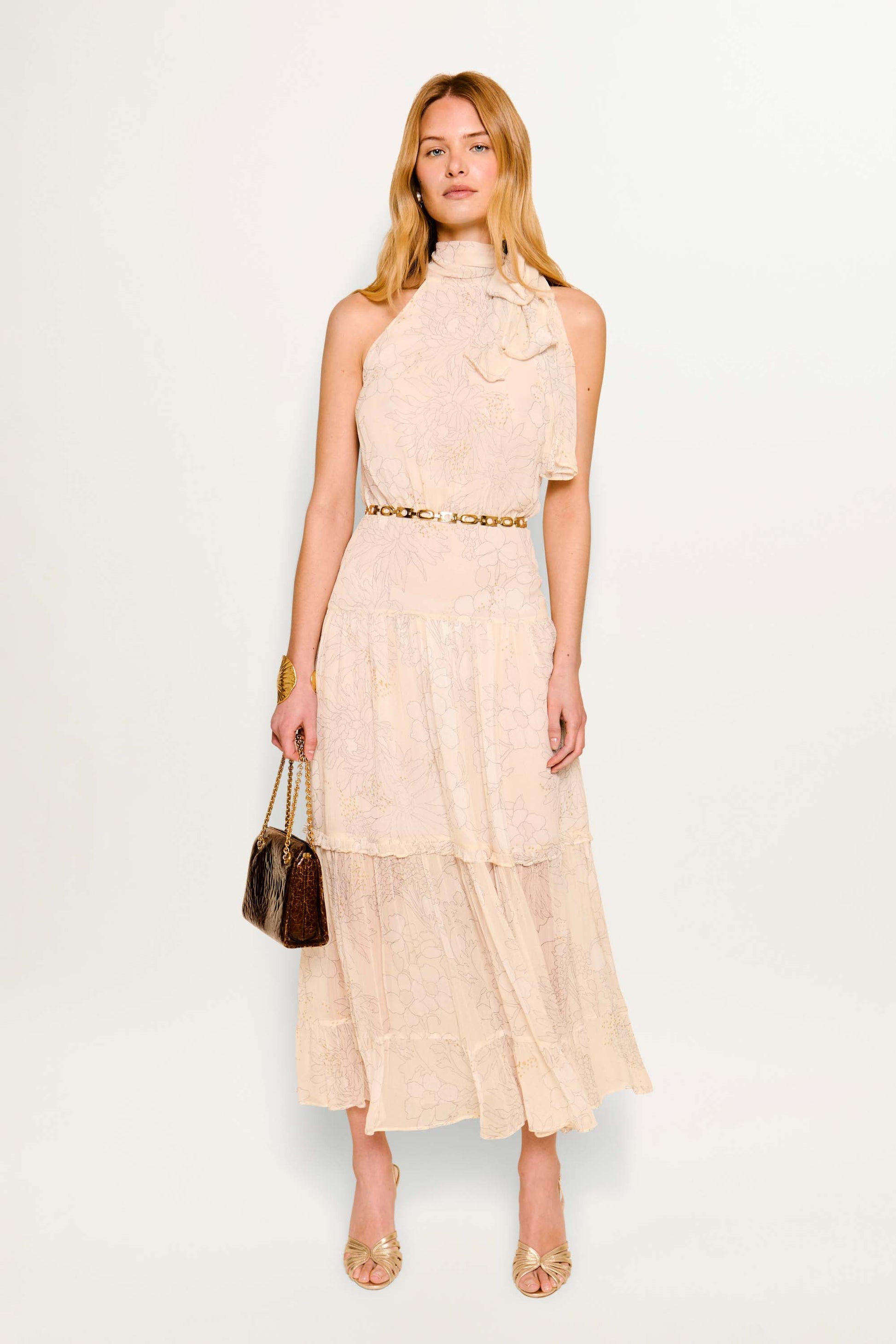 This crinkled-chiffon Abi dress has a scarf-style neckline, blousy bodice and a tiered midi skirt, perfect for bridesmaids or occasionwear. The vintage-inspired floral print is flecked with gold.