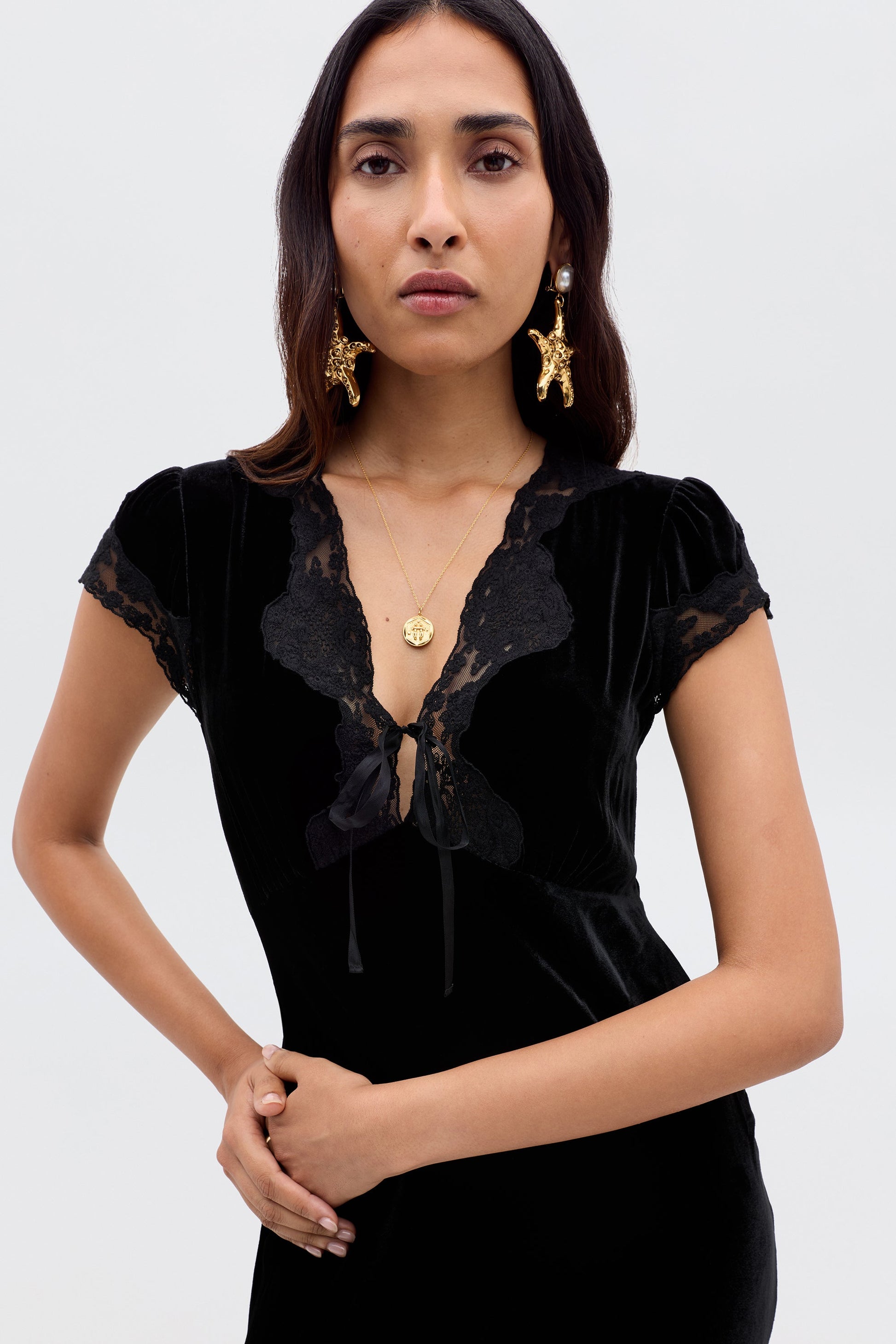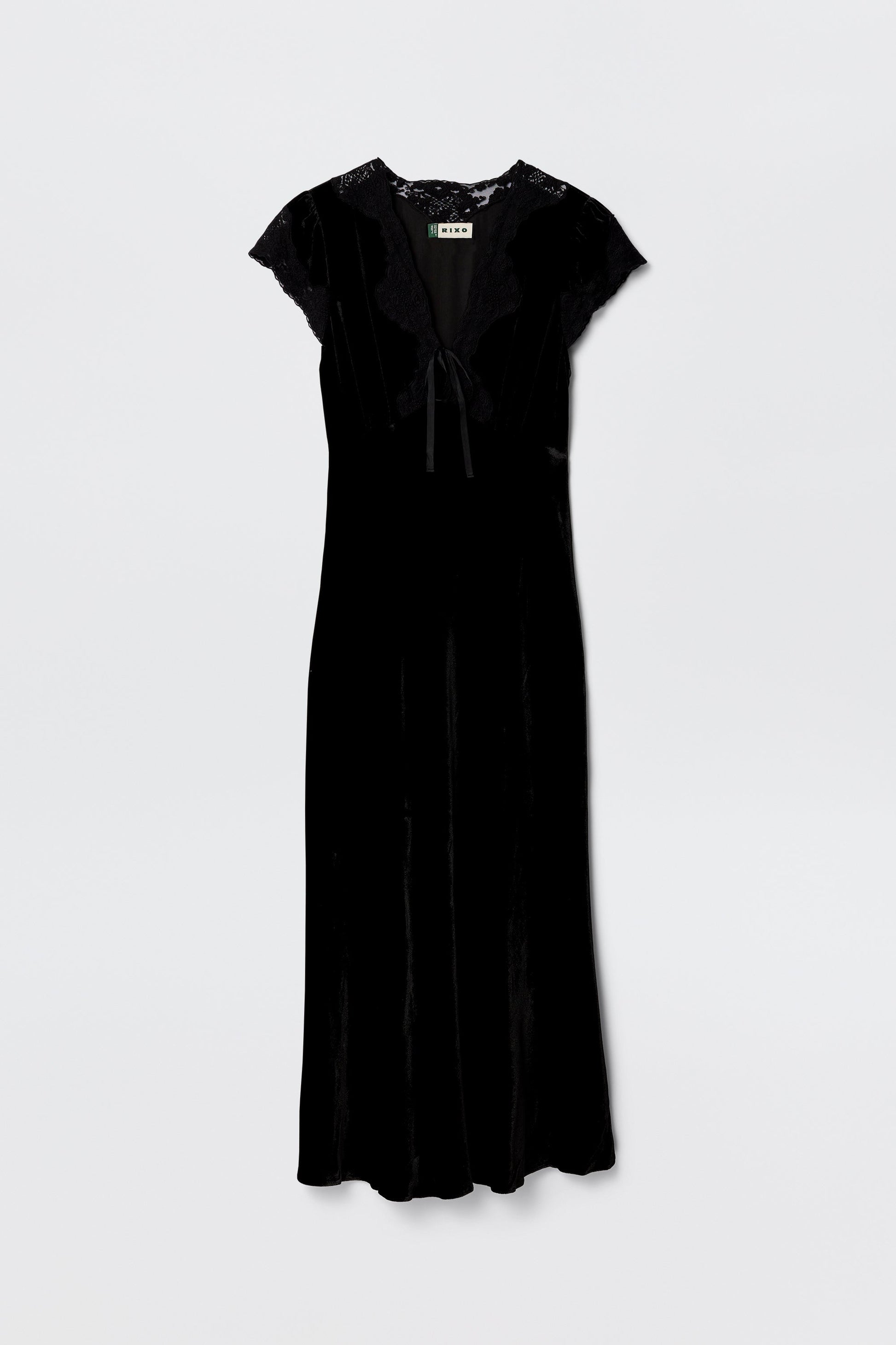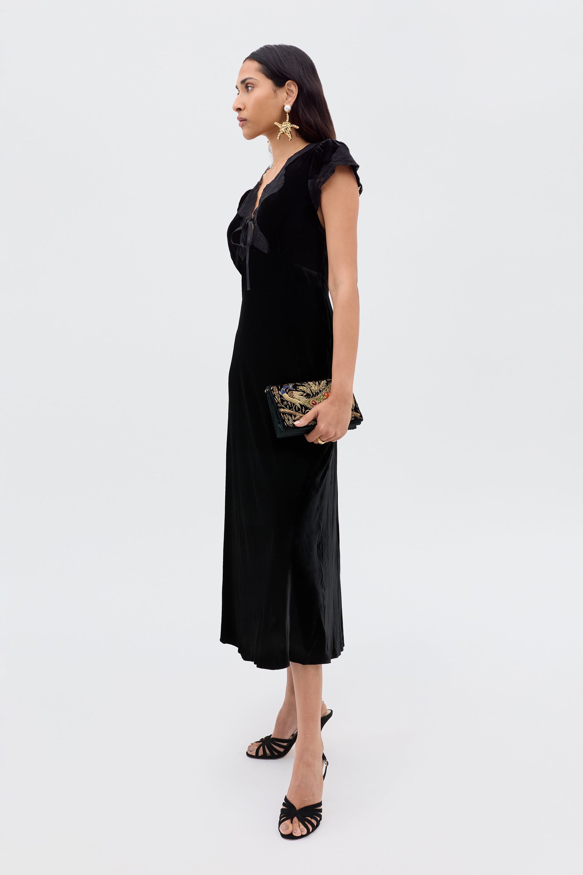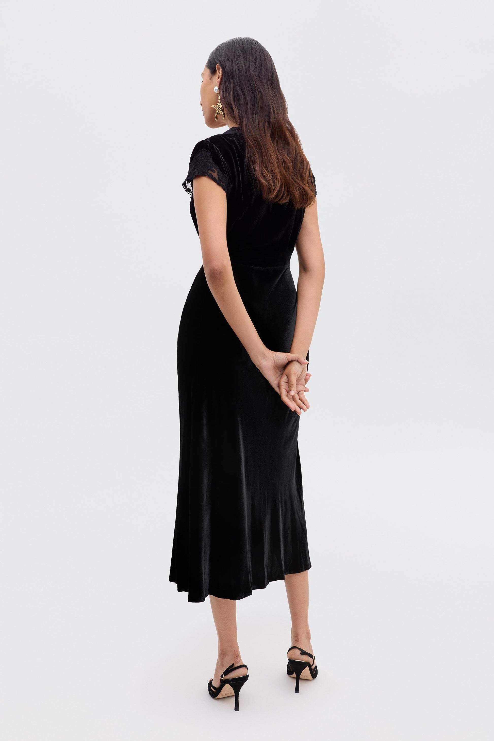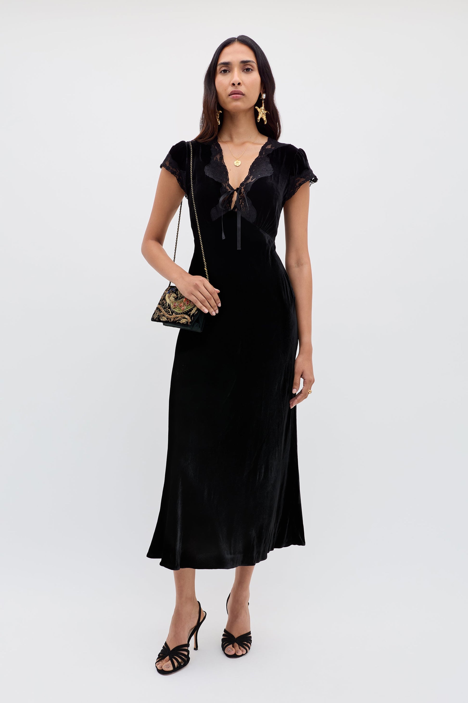 Available in regular and petite. Amari is based on our bestselling Clarice dress, but the black velvet gives an elevated feel, perfect for occasions or evenings. It's cut in our signature bias shape, with underbust seams and a tie front so you can adjust the V-neck. You may also like Ursula.