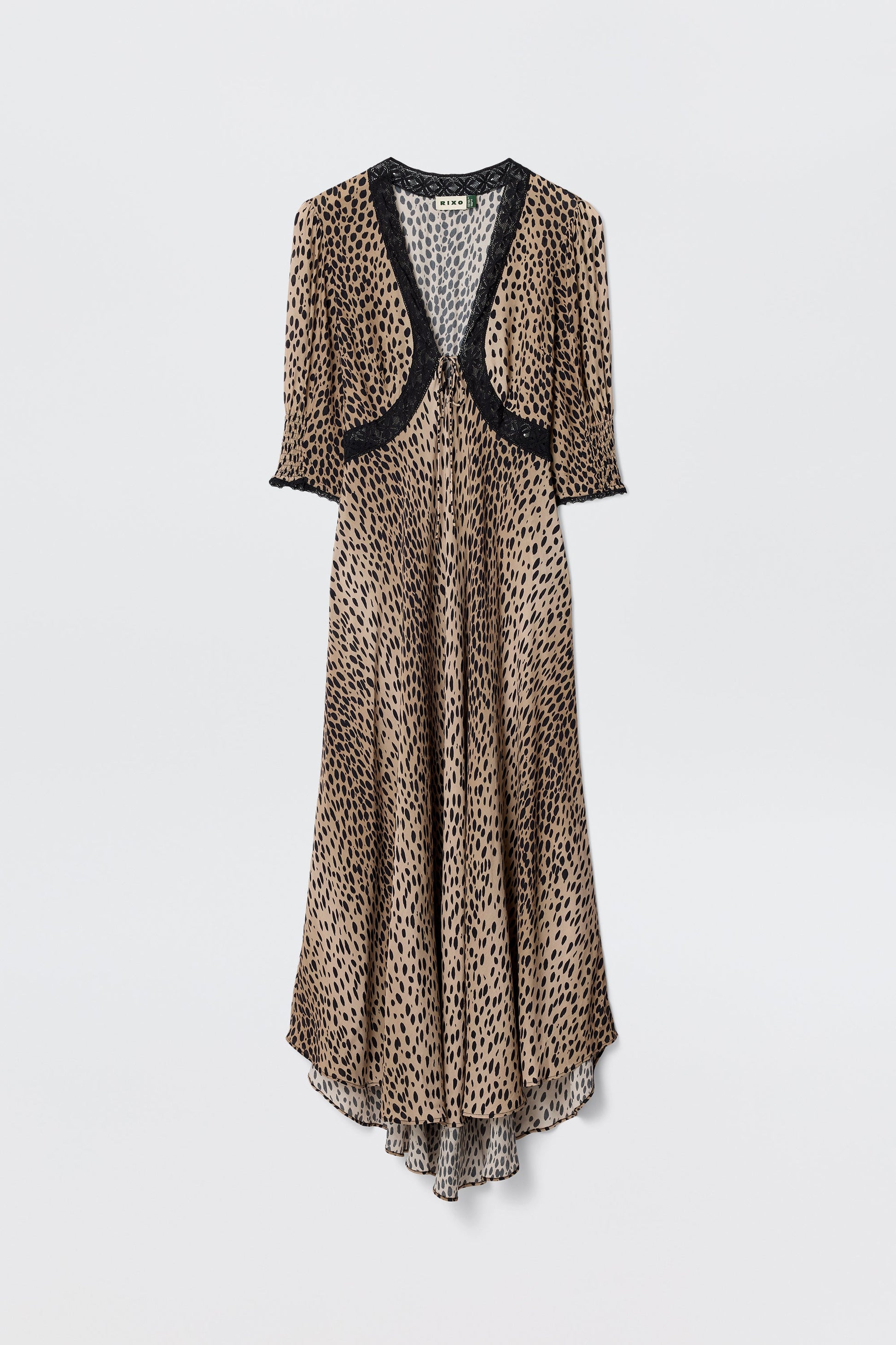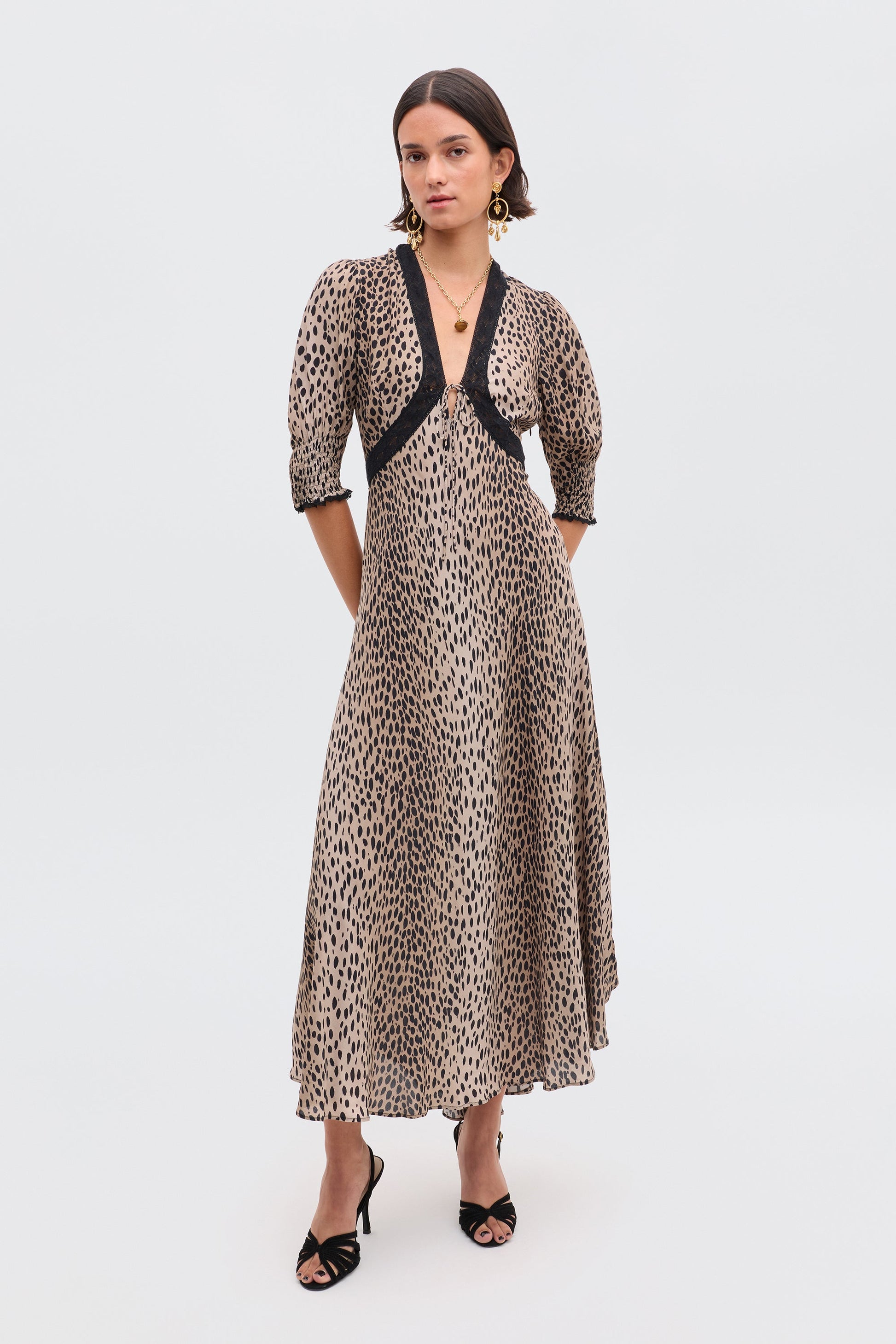 We've updated our popular Amina dress in Antelope Spot - a favourite print year-round. It's traced with flattering lace trims and has shirred cuffs so you can play with the shape of the sleeves.