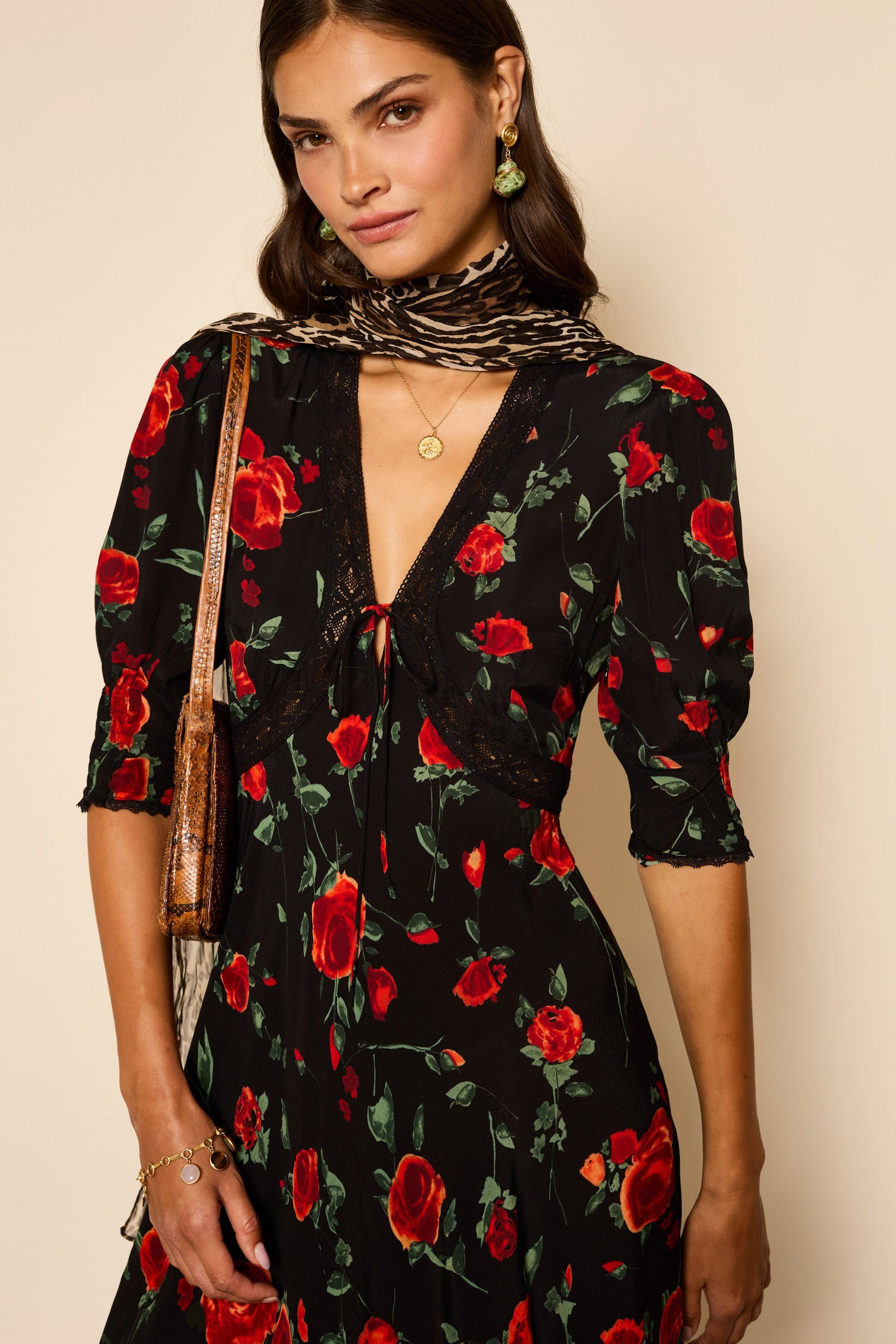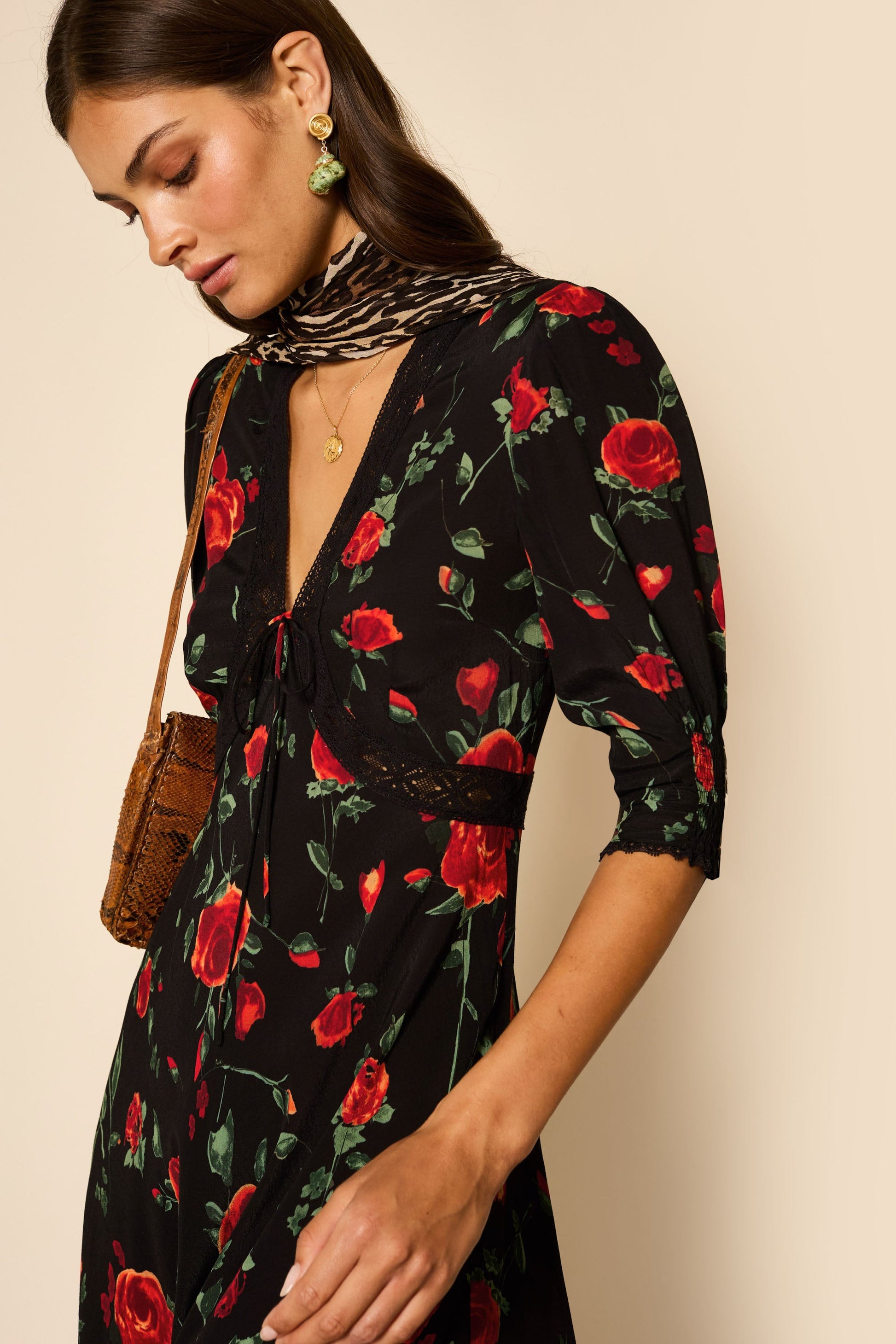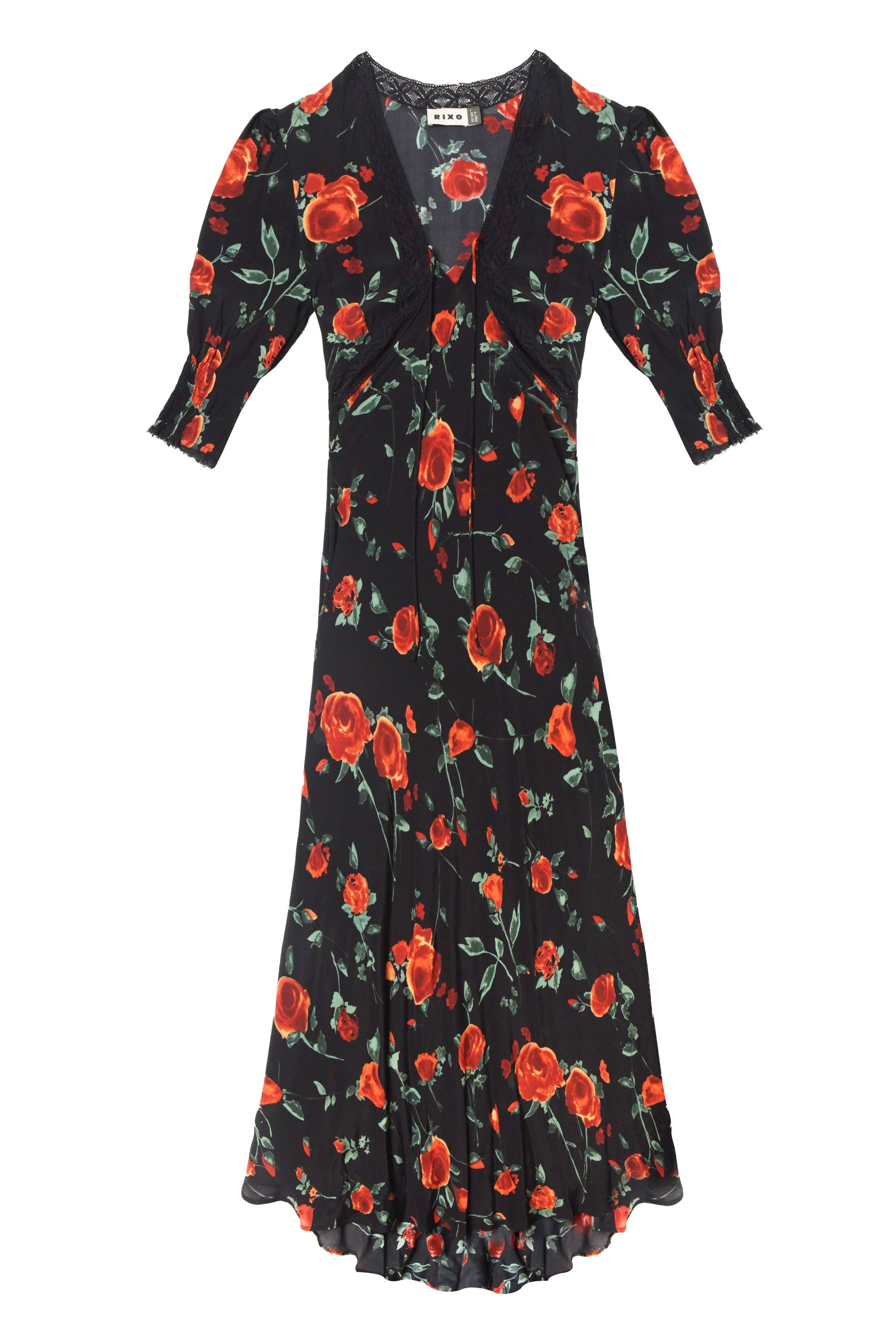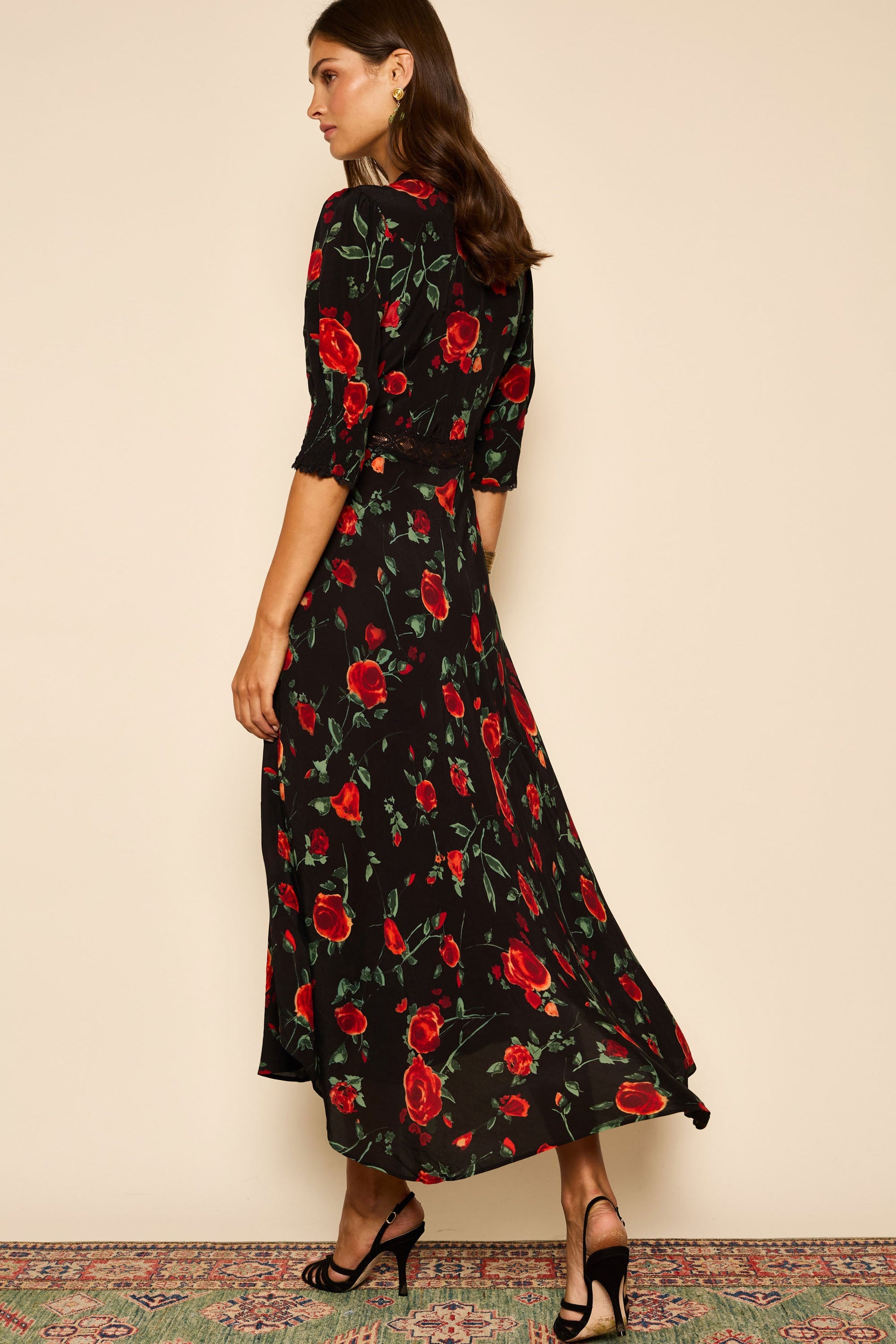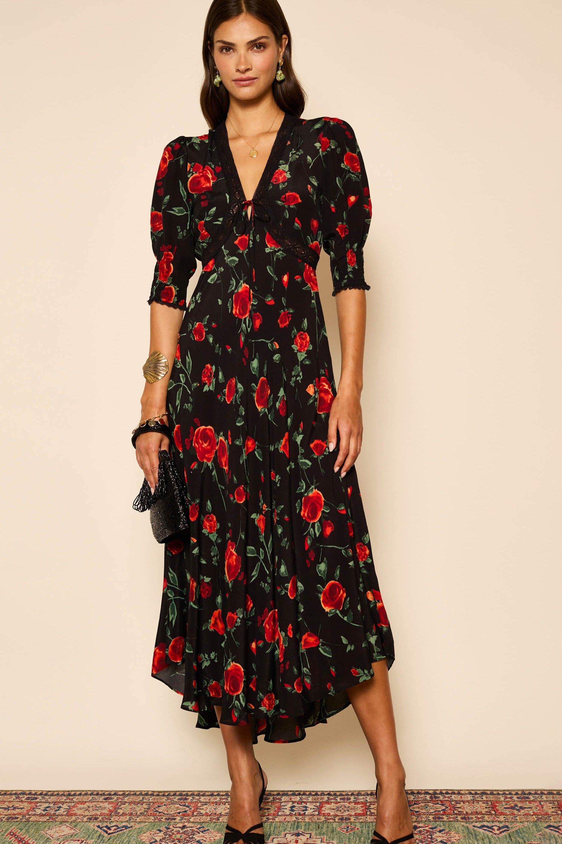 We've updated our popular Amina dress in a romantic new red rose print - the black base works year round. It's traced with flattering lace trims and has shirred cuffs so you can play with the shape of the sleeves.