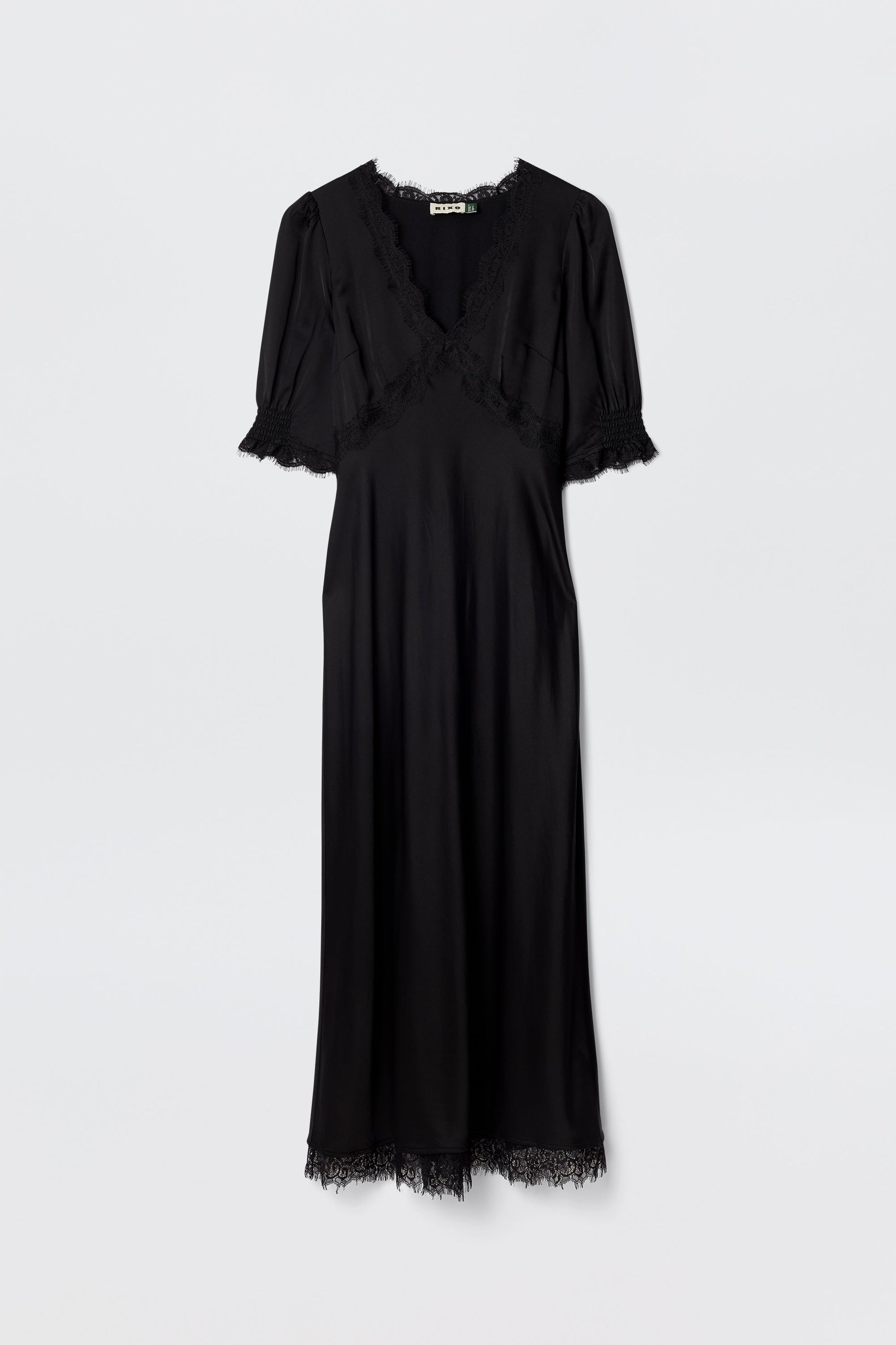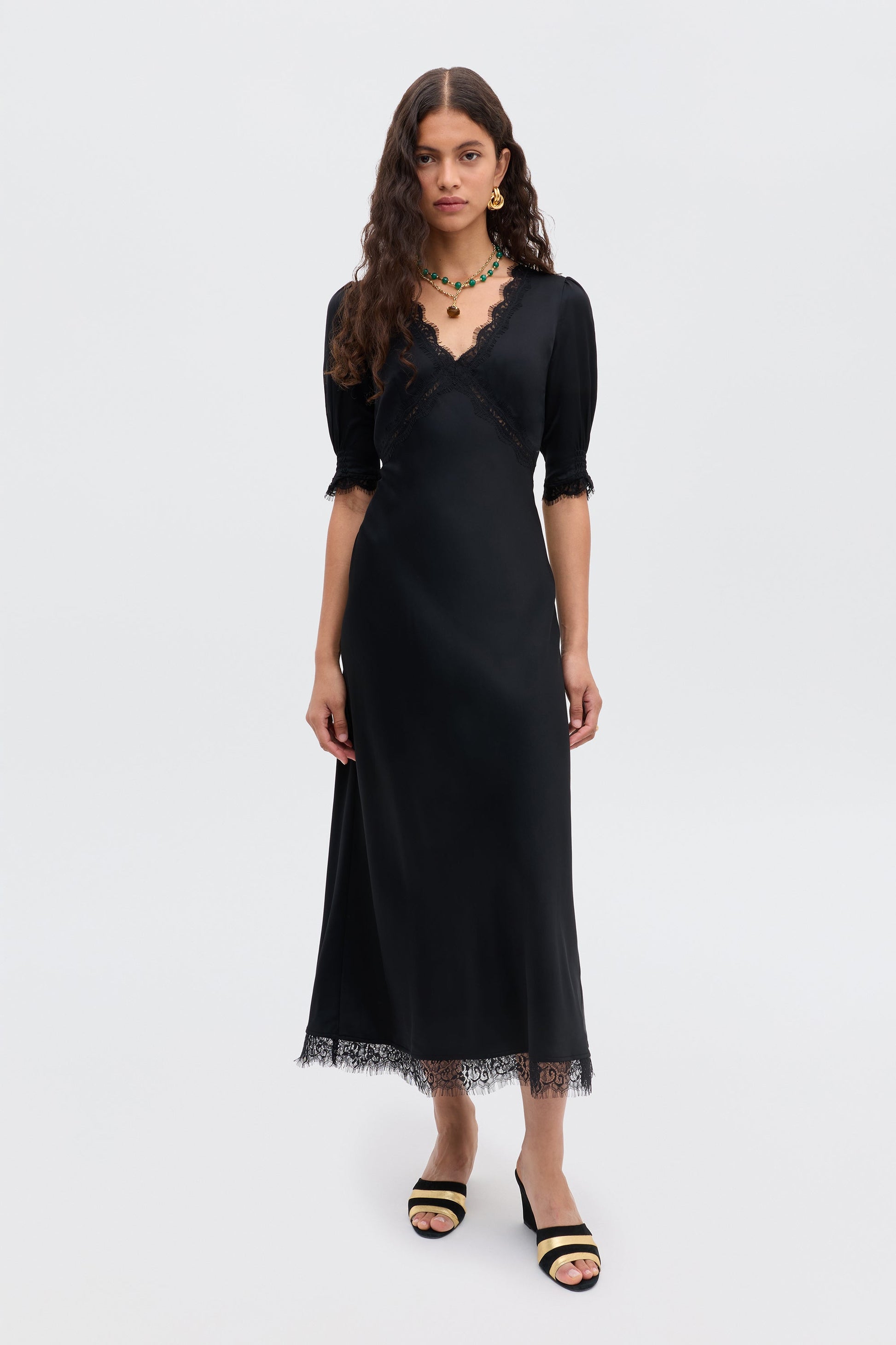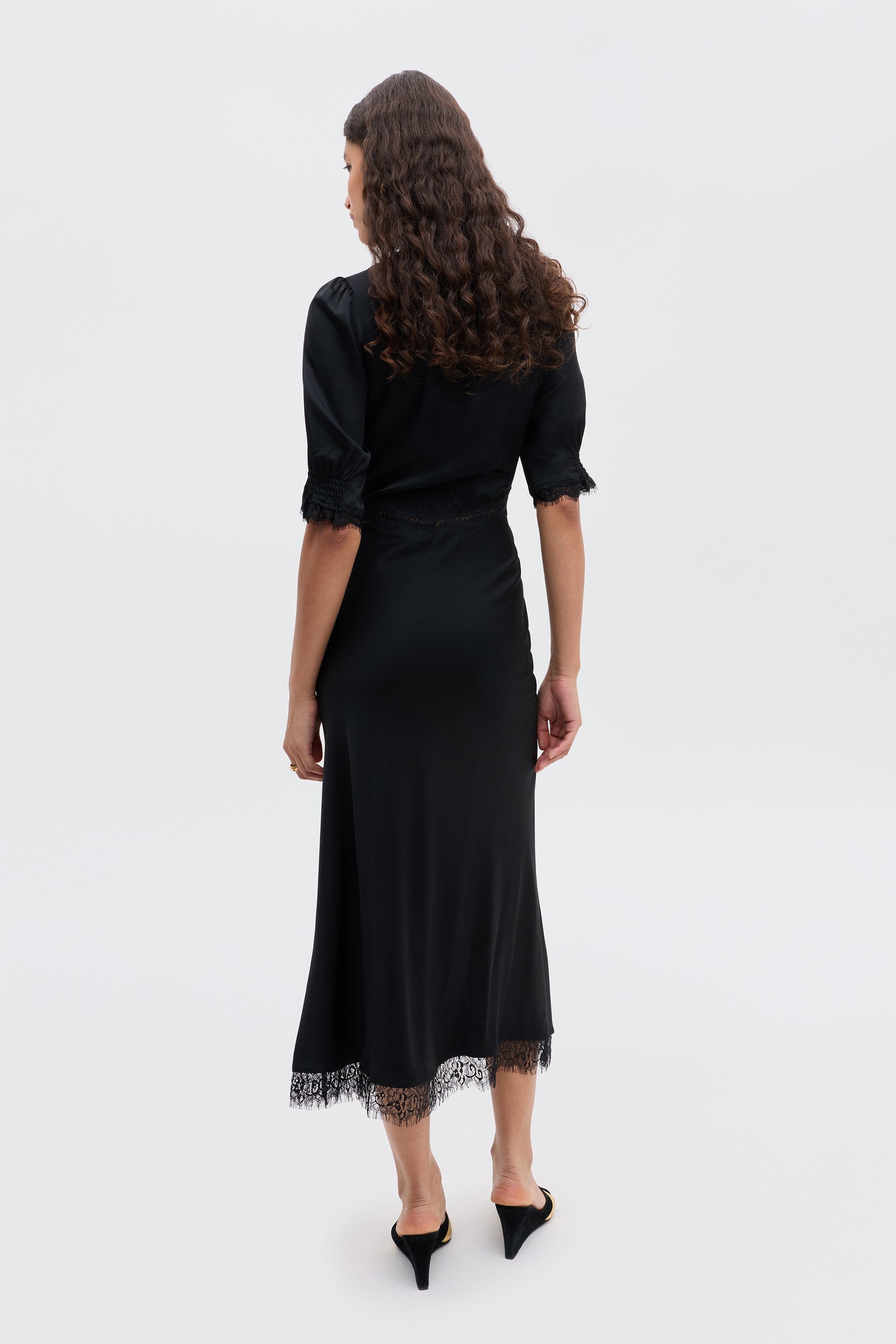 The Annina is an elegant black midi dress with lace trims. This style has a flattering bias cut and delicate, vintage-inspired sleeve shape.