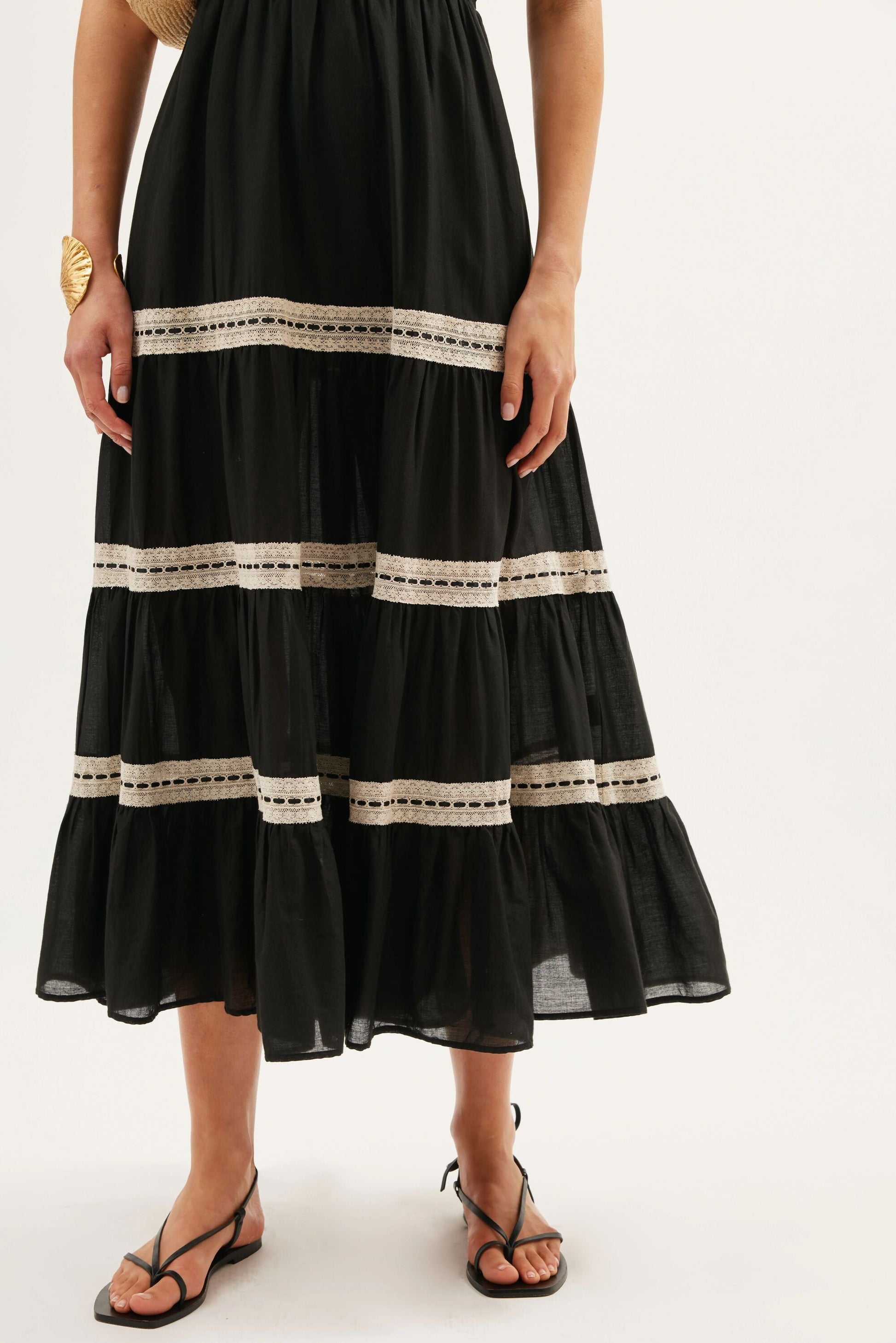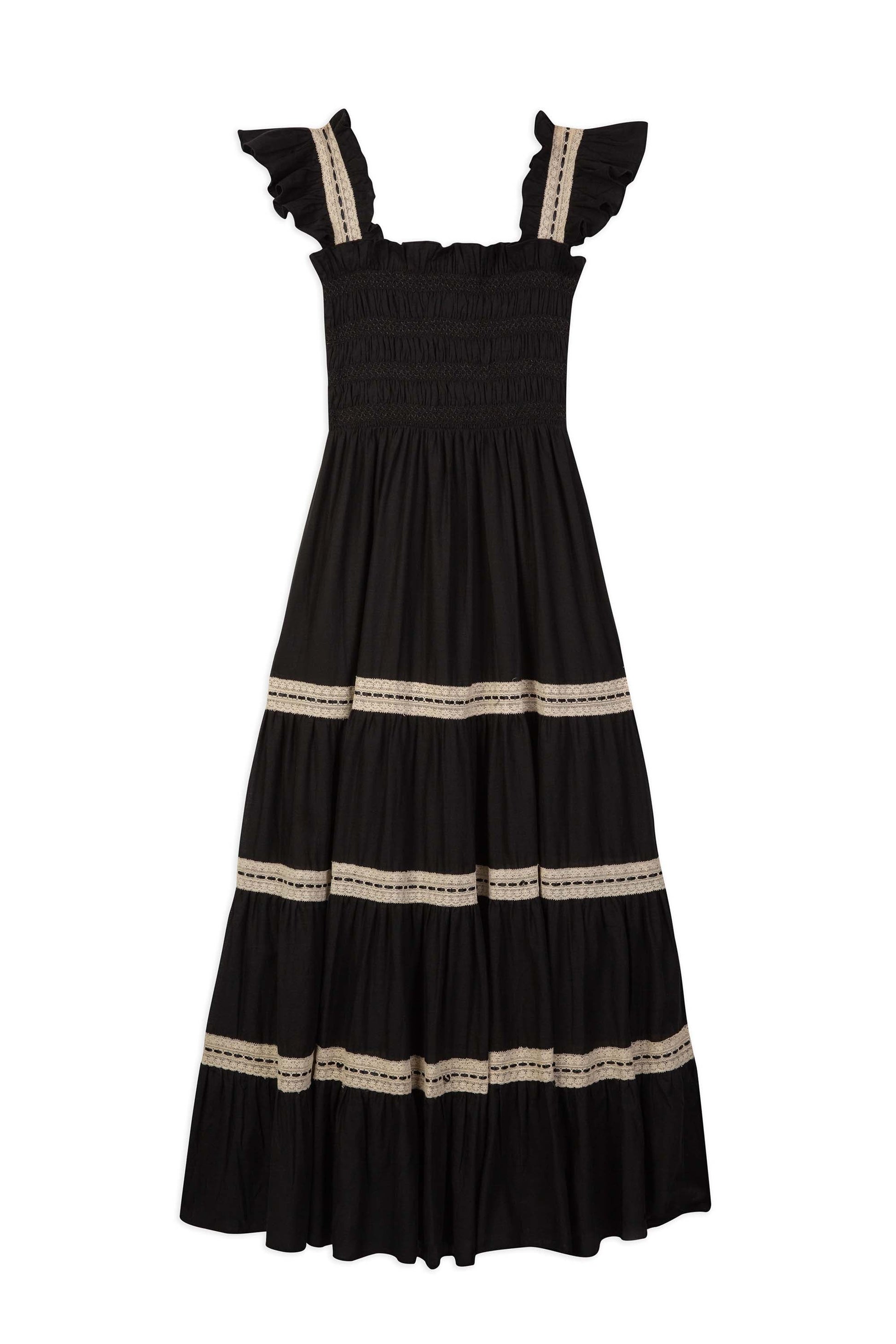 The Aubrie is a seventies-inspired nightdress made for teaming with loose waves and high heels in daytime. Cut from organic cotton and decorated with crochet lace, ruffles, and shirring, she's far too pretty to restrict to bedtime. She is styled here with our Alexa scarf.