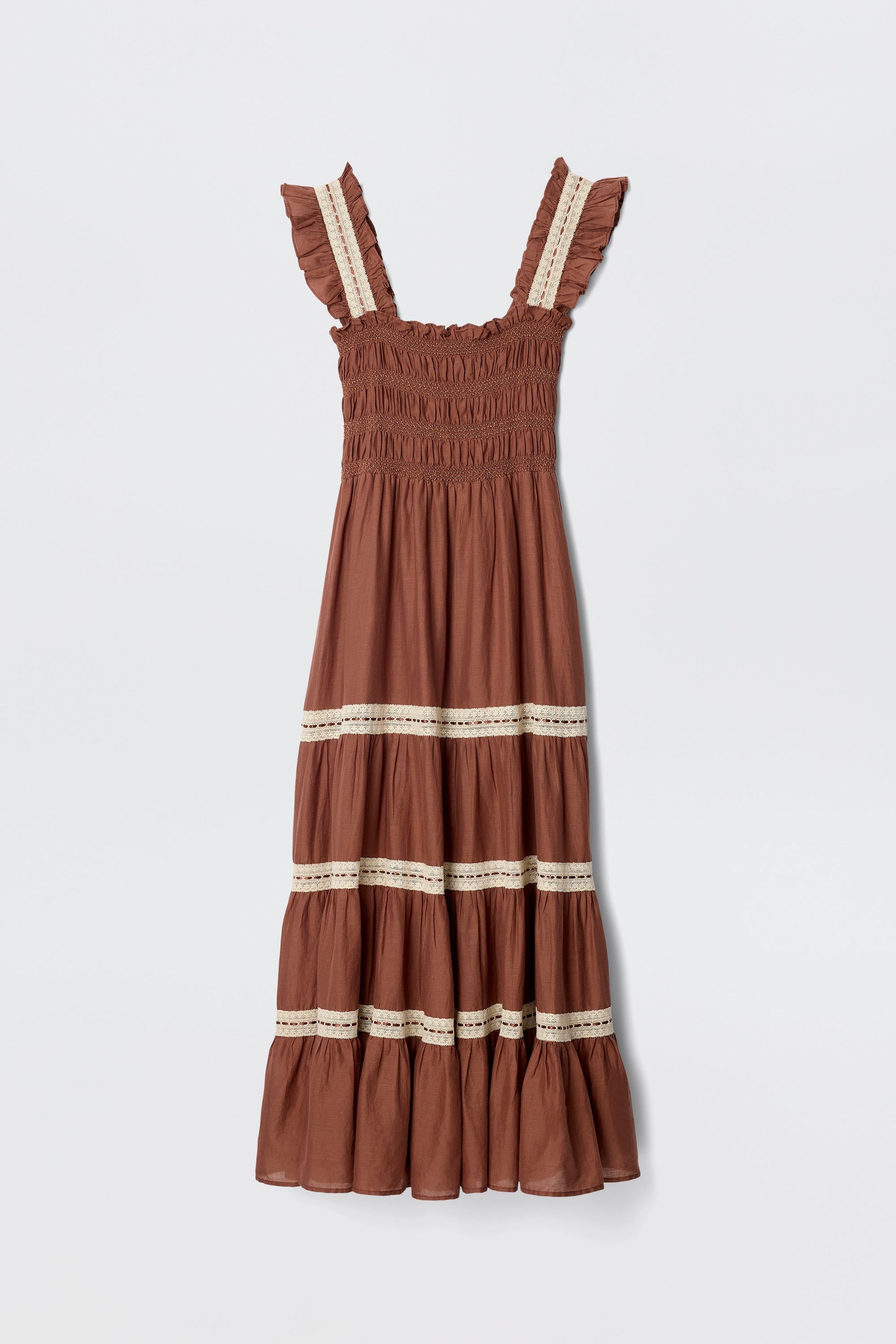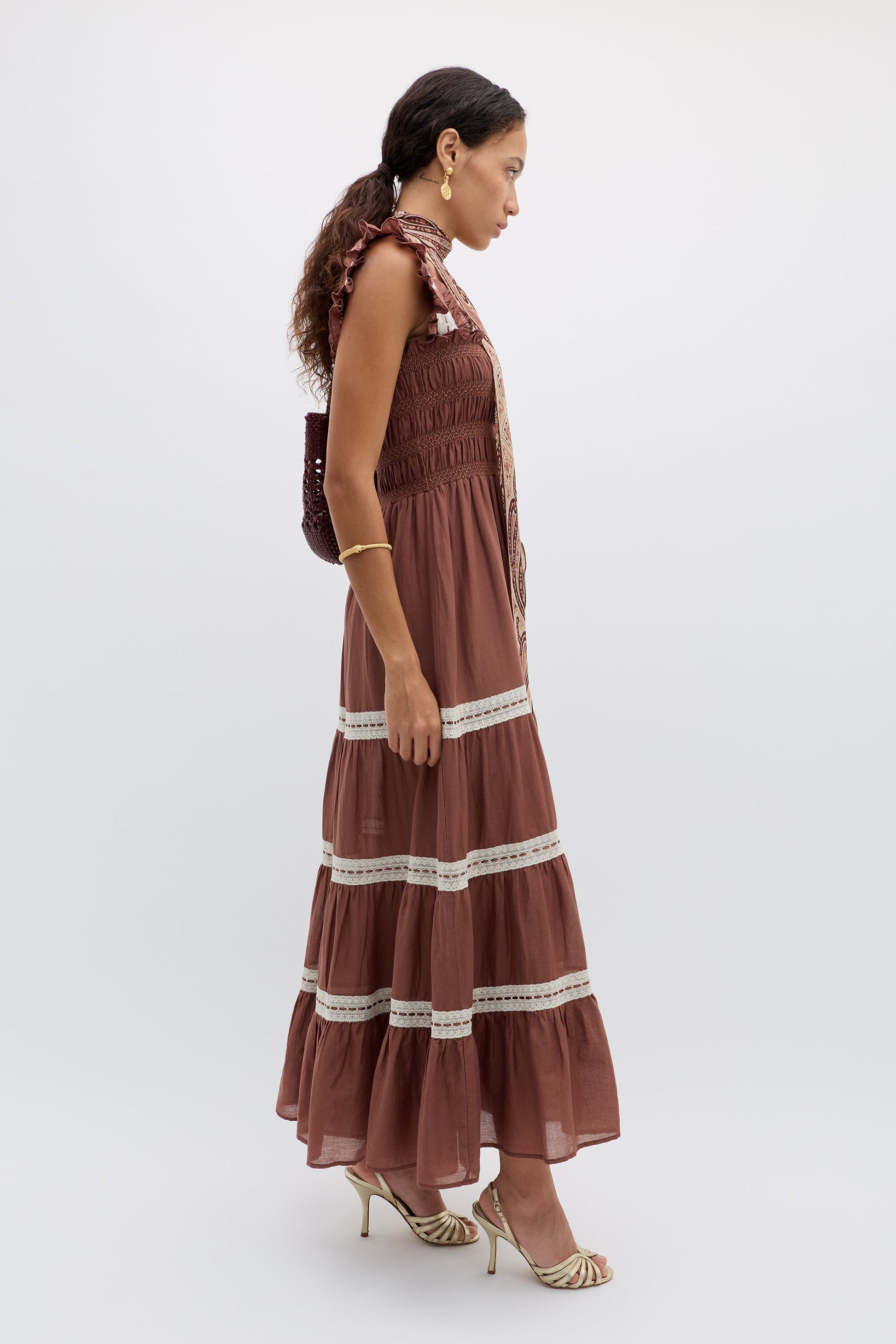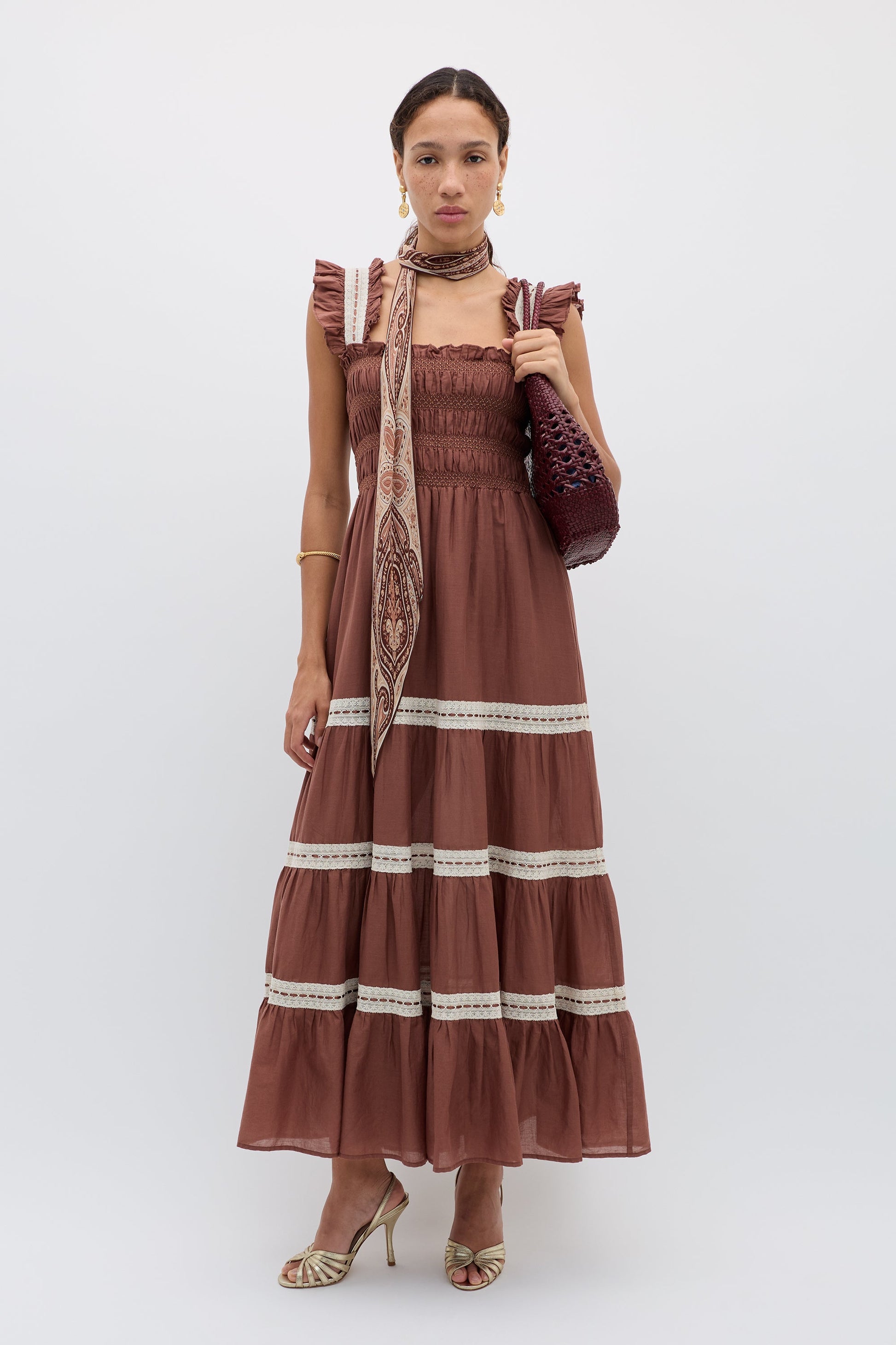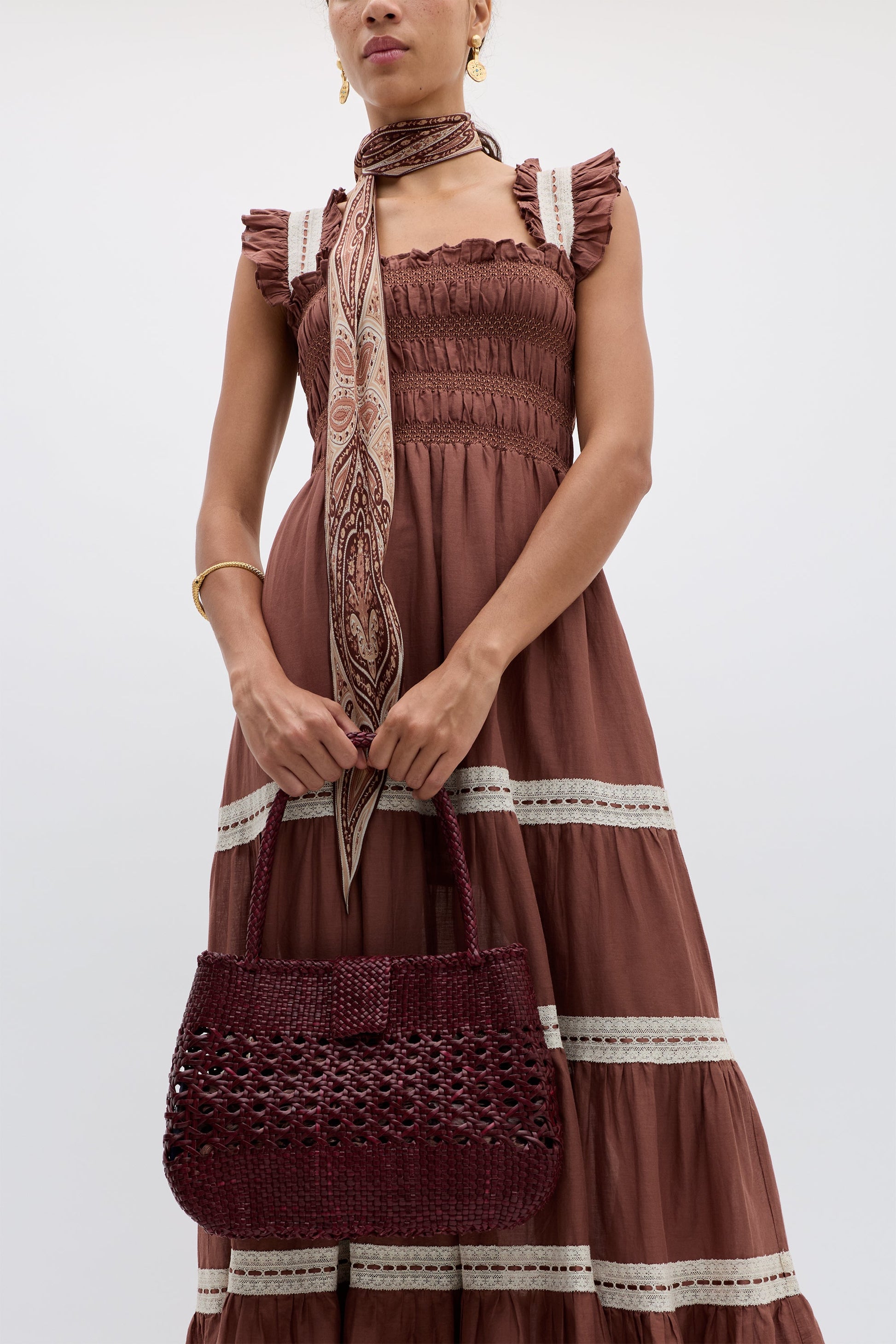 Our beloved Aubrie dress — now available in vintage-inspired brown. Our take on a 1970s nightdress, this breezy, lace crochet-detailed midi can be styled for evening sojourns or worn effortlessly in the day. Wear yours with our Milani Raffia Bag.