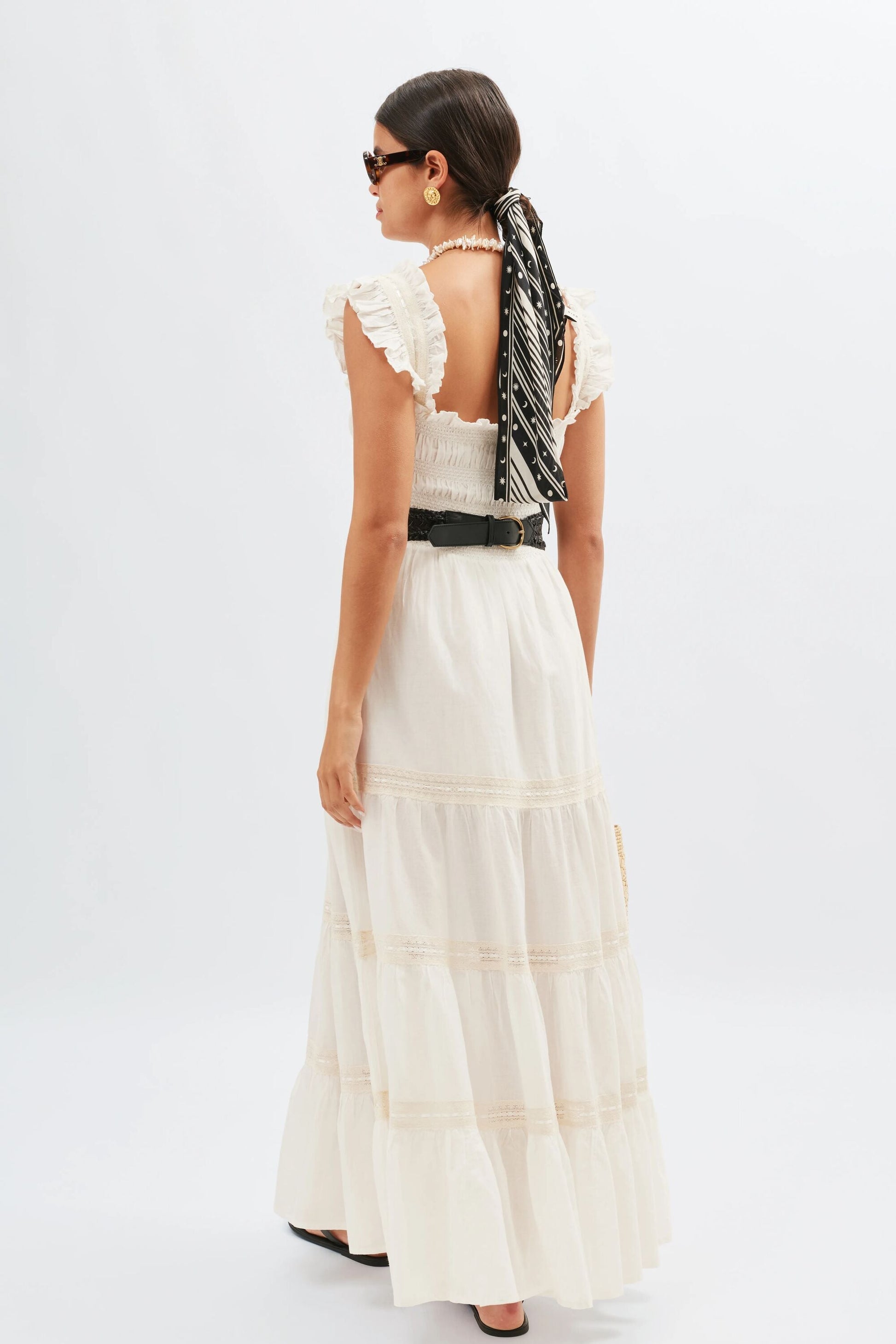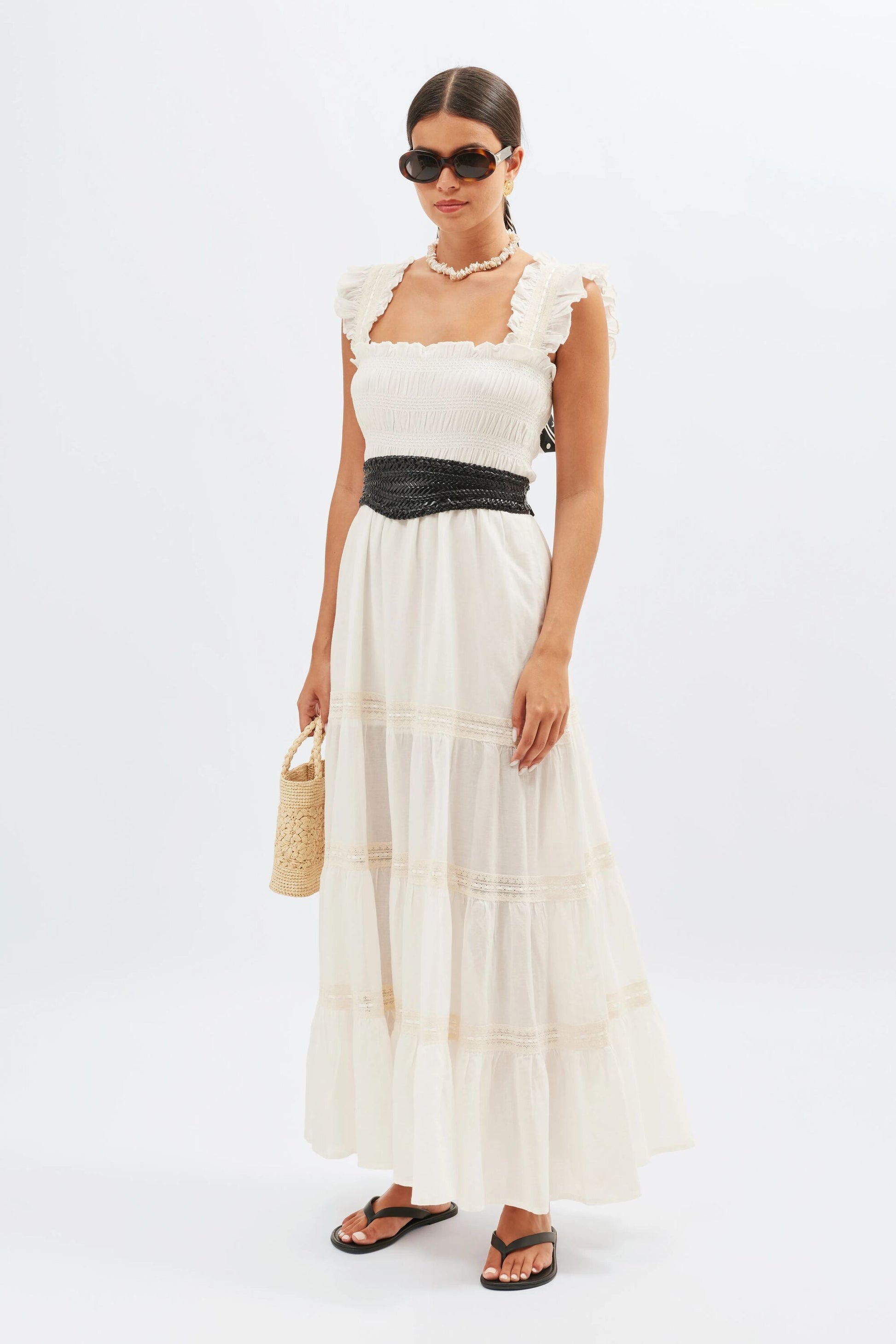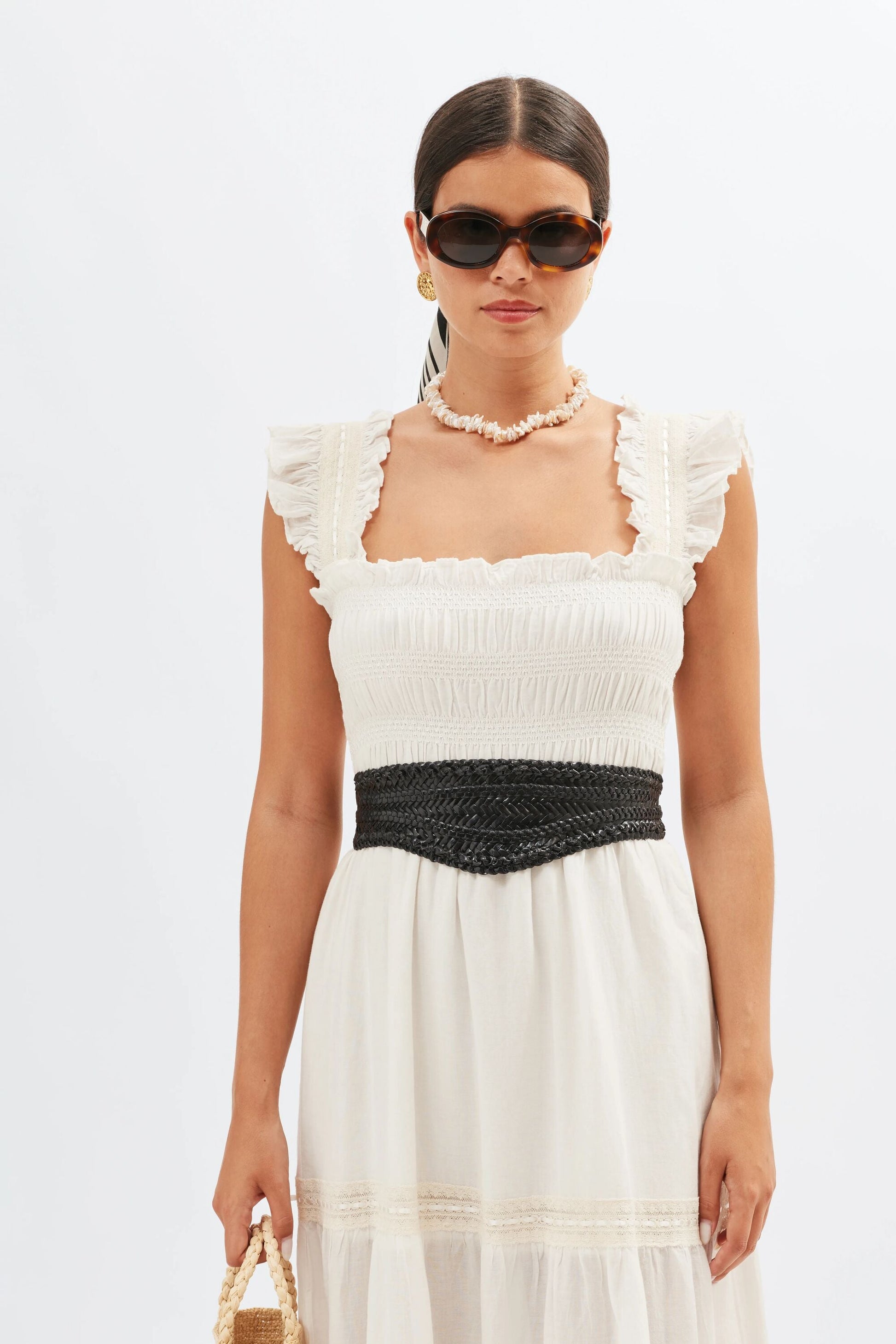 Aubrie is inspired by a nightdress from the 70s, and reimagined with lace, ruffles and shirred panels. The breezy shape and slip-on style are ideal for warm days.