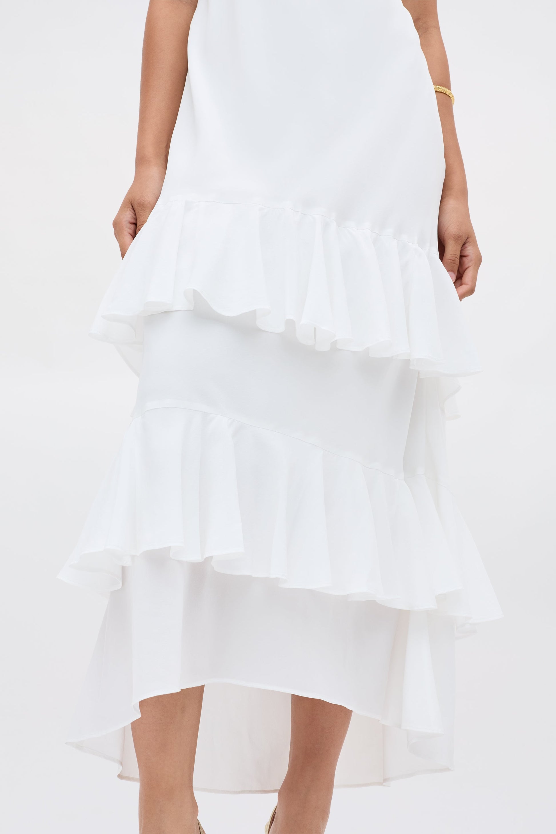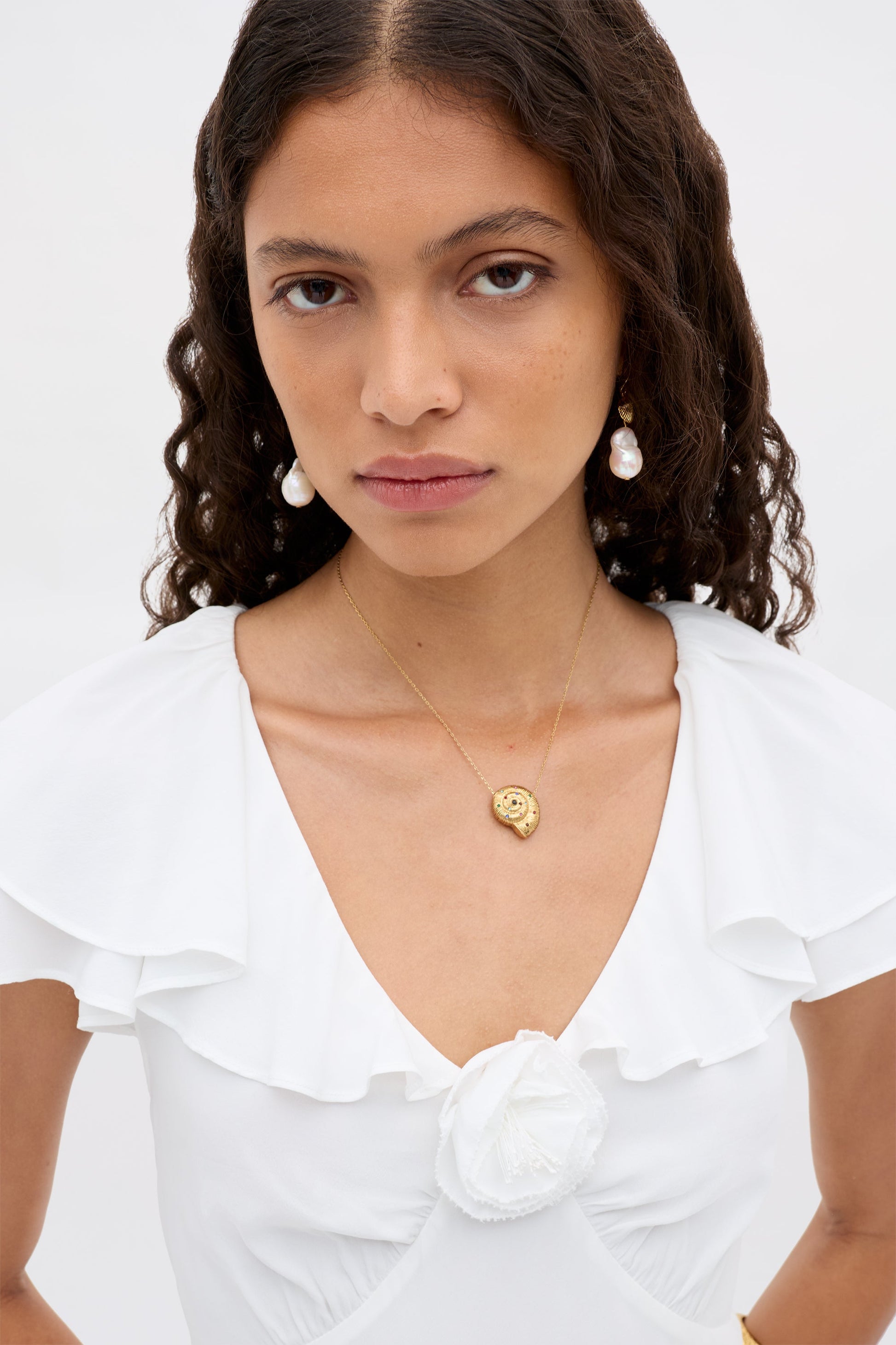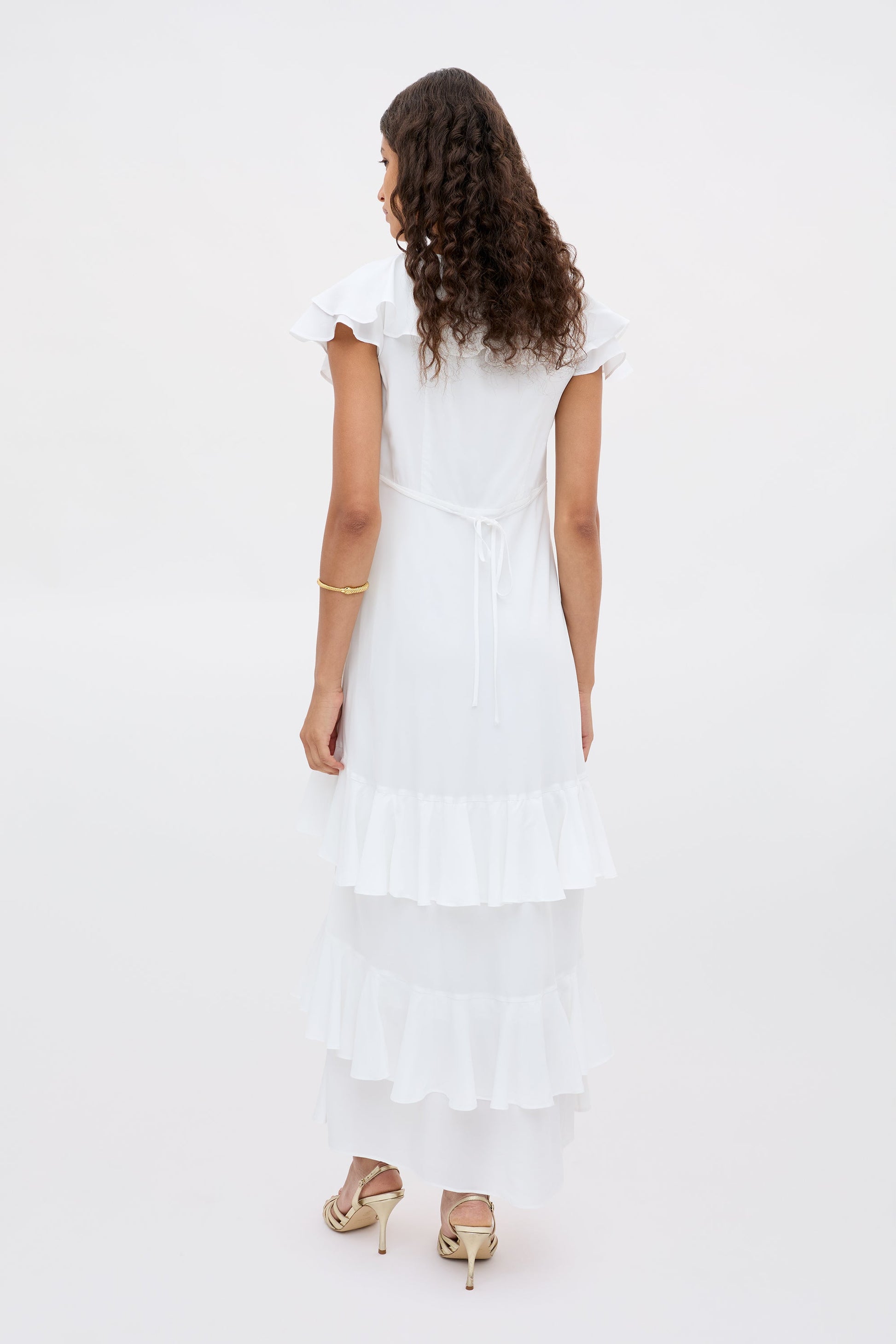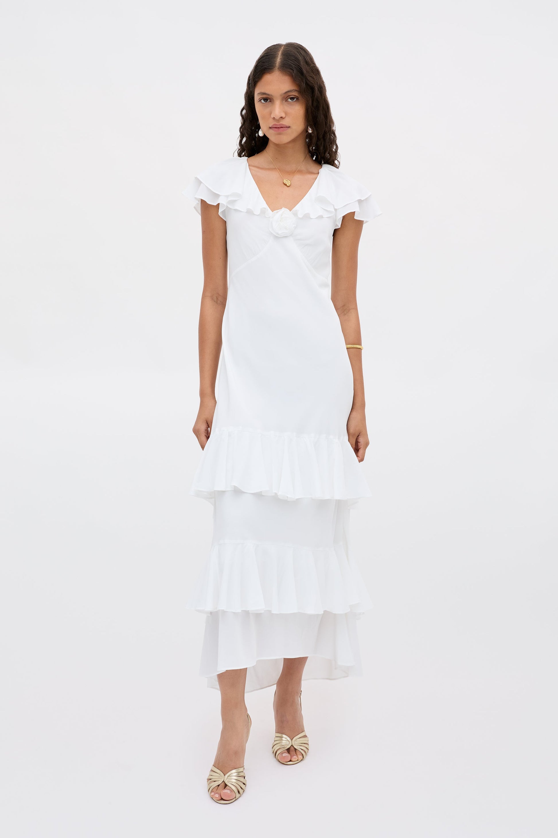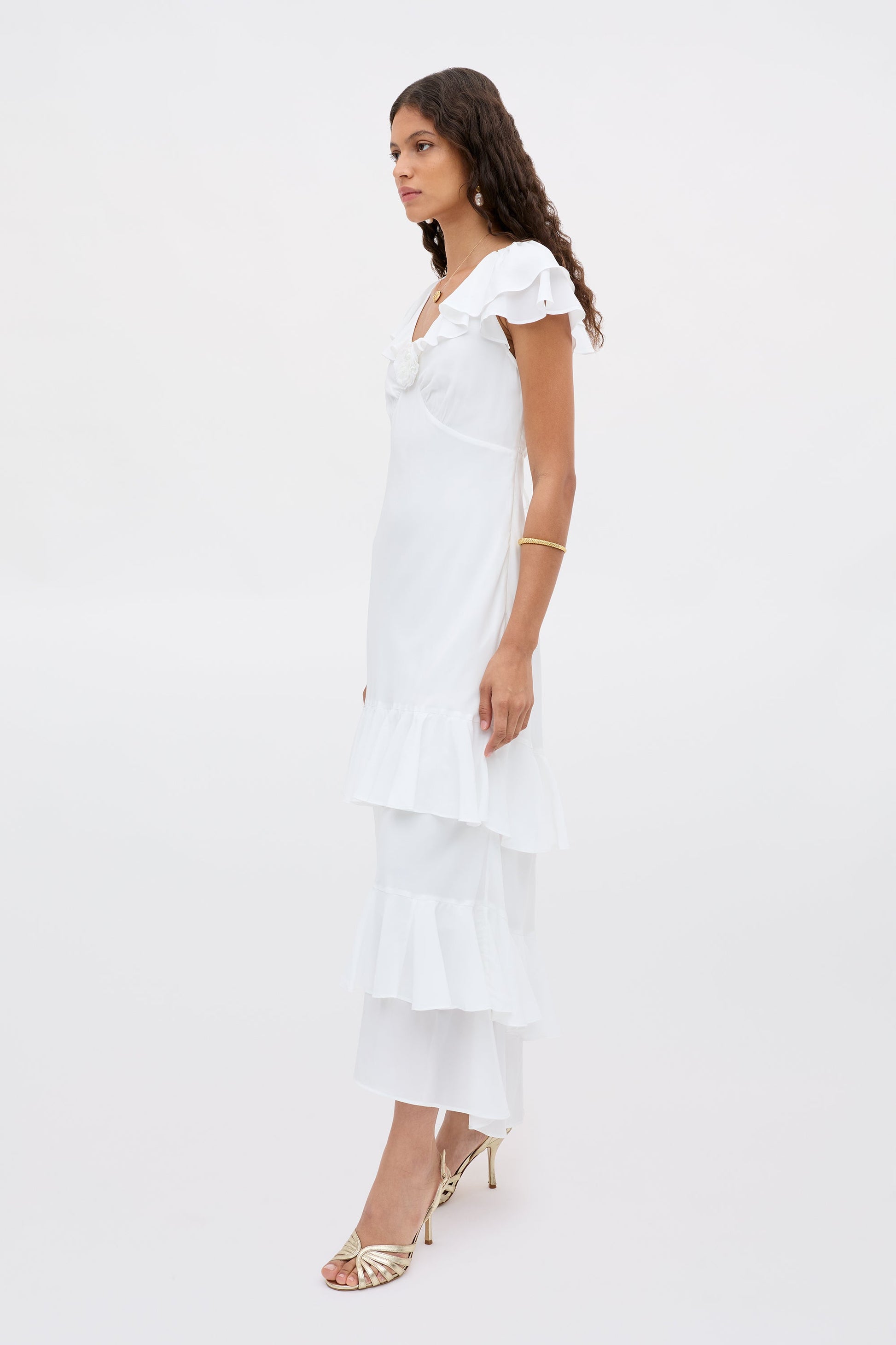 Our Benoite dress is especially feminine, with floaty ruffles and a corsage at the centre, inspired by vintage styles. It's made with touches of silk and has ties to draw in the waist.
