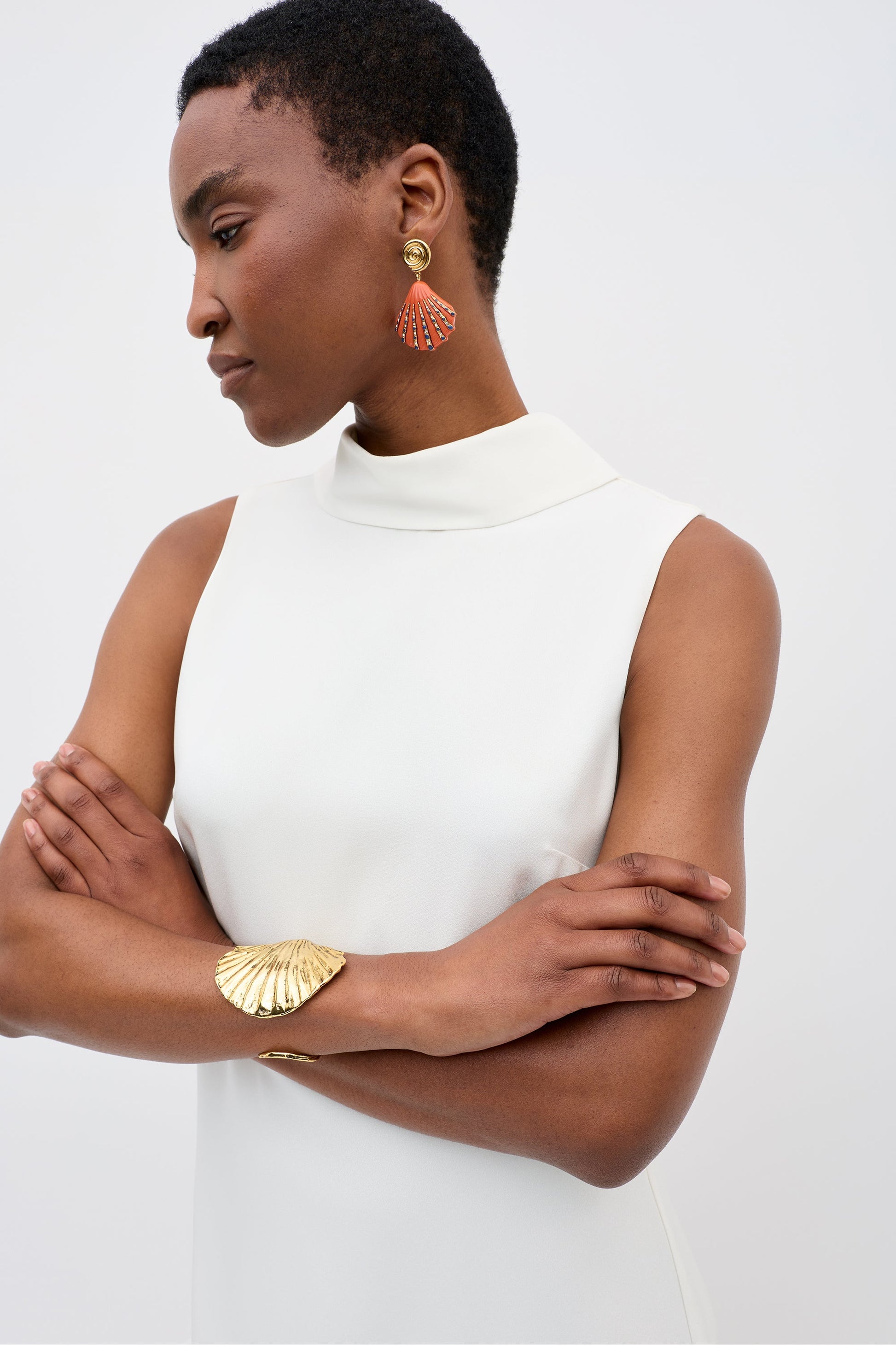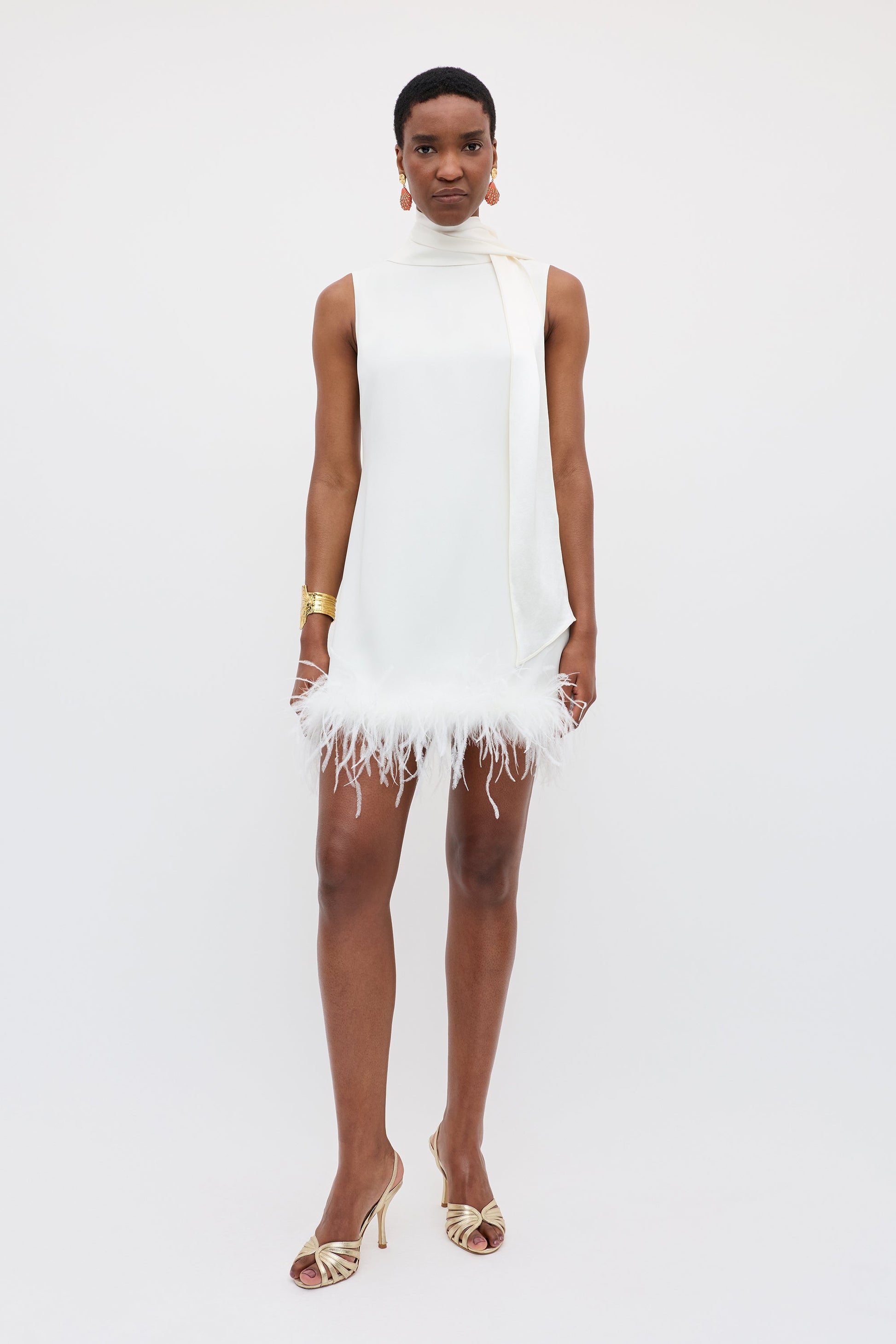 The Candice is an elegantly sixties-inspired shift dress in satin-back silk crepe. Made with a Jackie Kennedy-esque roll neckline, slightly A-line skirt, and ostrich-feathered hemline, she is a style no one will ever forget for the day you will always remember.
