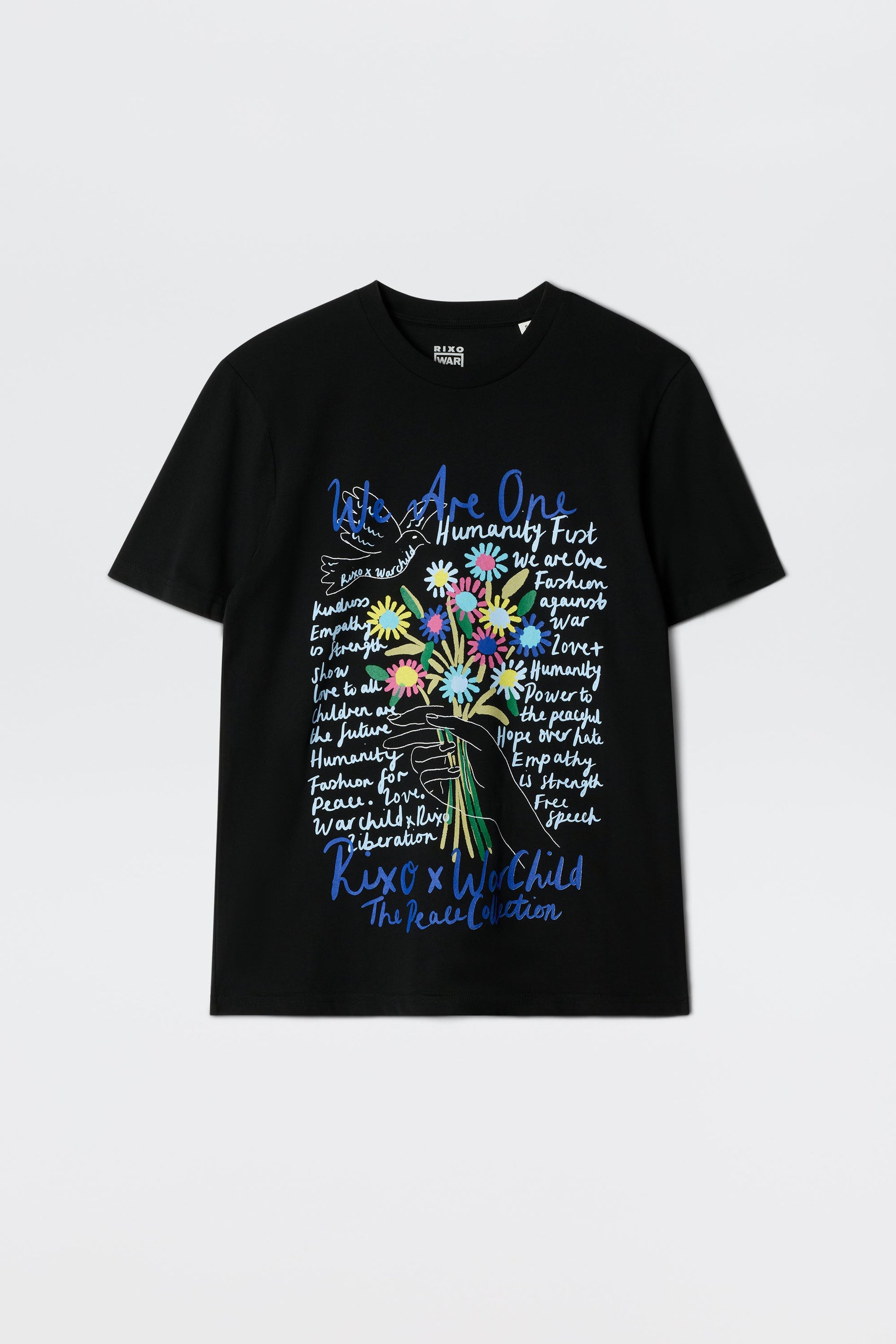 The RIXO x War Child T-shirt comes in two colourways and was inspired by anti-war posters from the revolutionary 60s and 70s, as well as the distinctive illustration styles of artists like Picasso. The design is hand drawn and features anti-war messages that surround a colourful bouquet of flowers – a call for equality, liberation and peace for all.