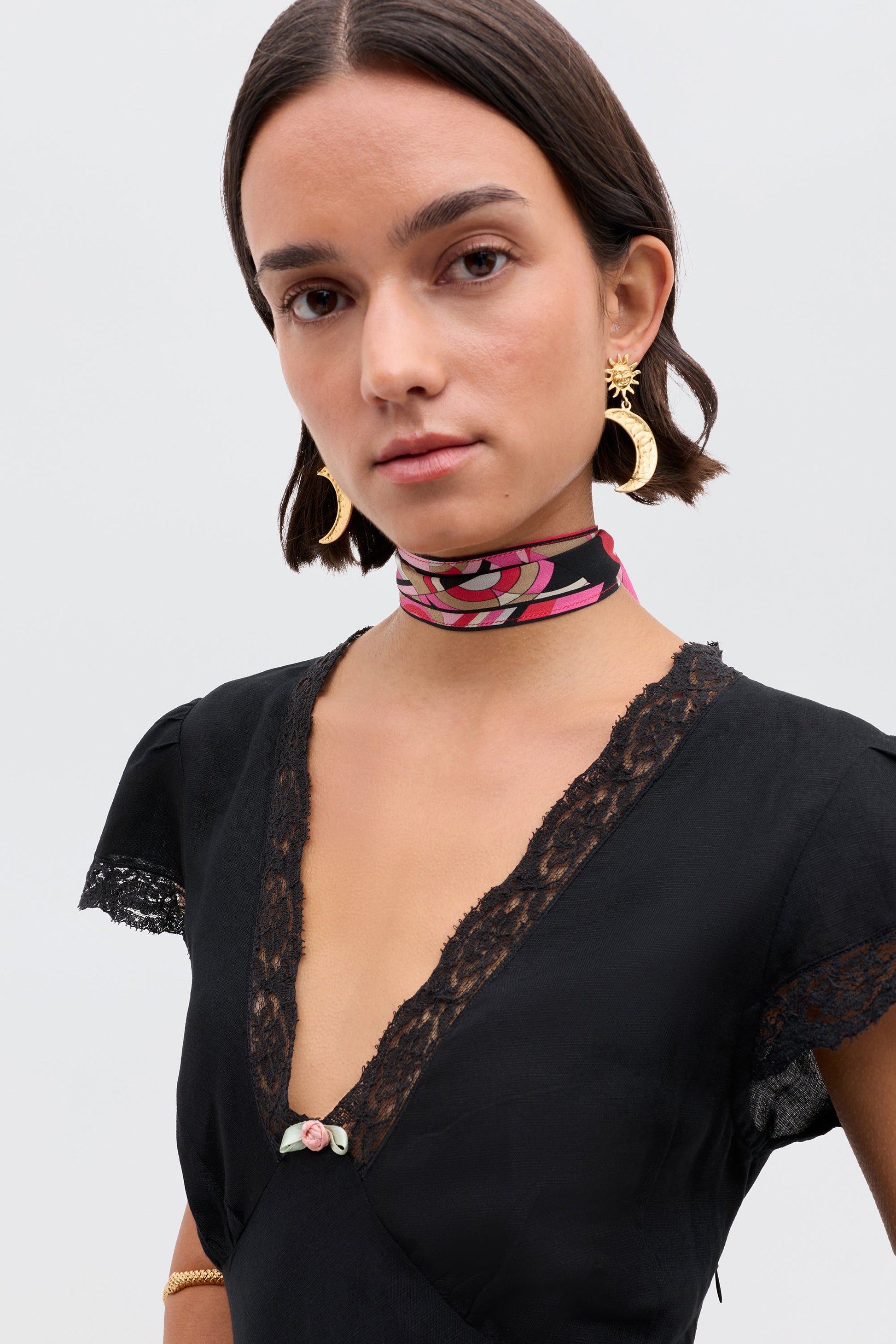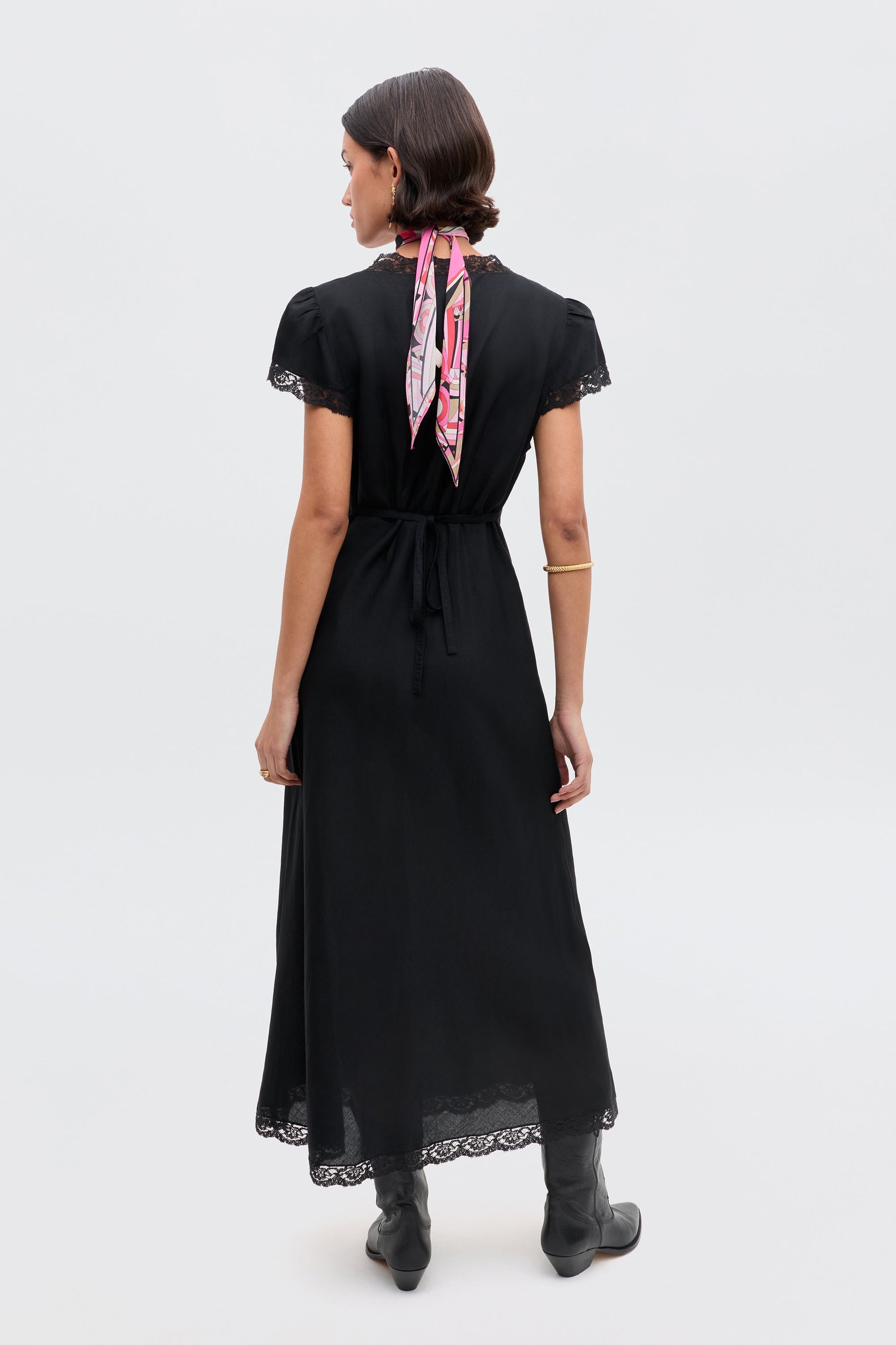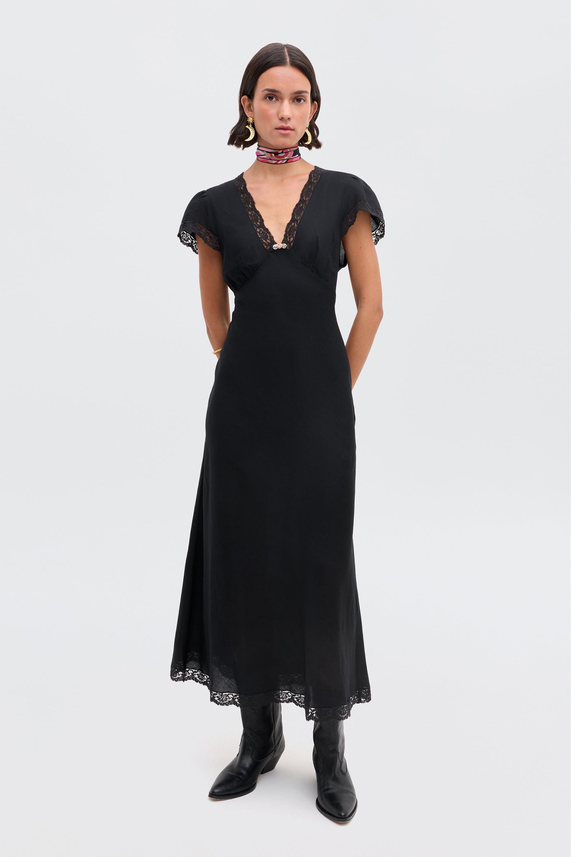 Every wardrobe needs a summery black dress like this Clarice midi. It's based on a vintage nightdress - you'll see the inspirations in the pretty lace and dainty rose trim.