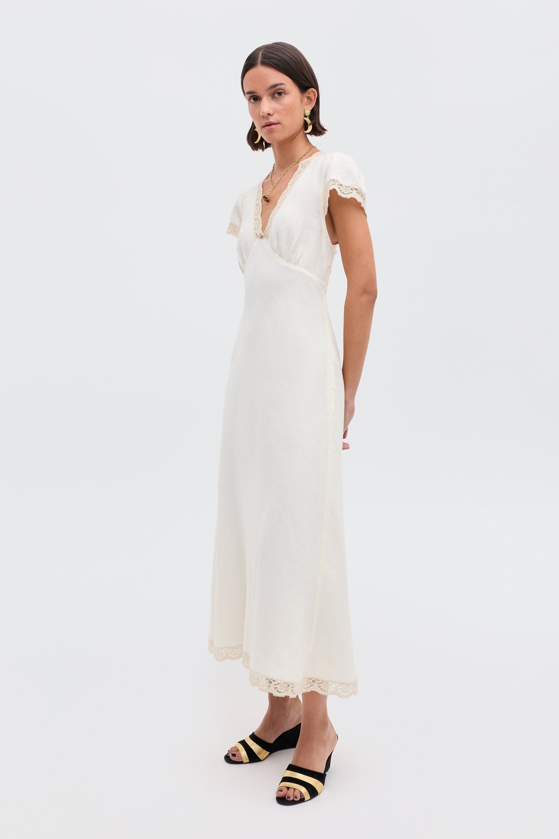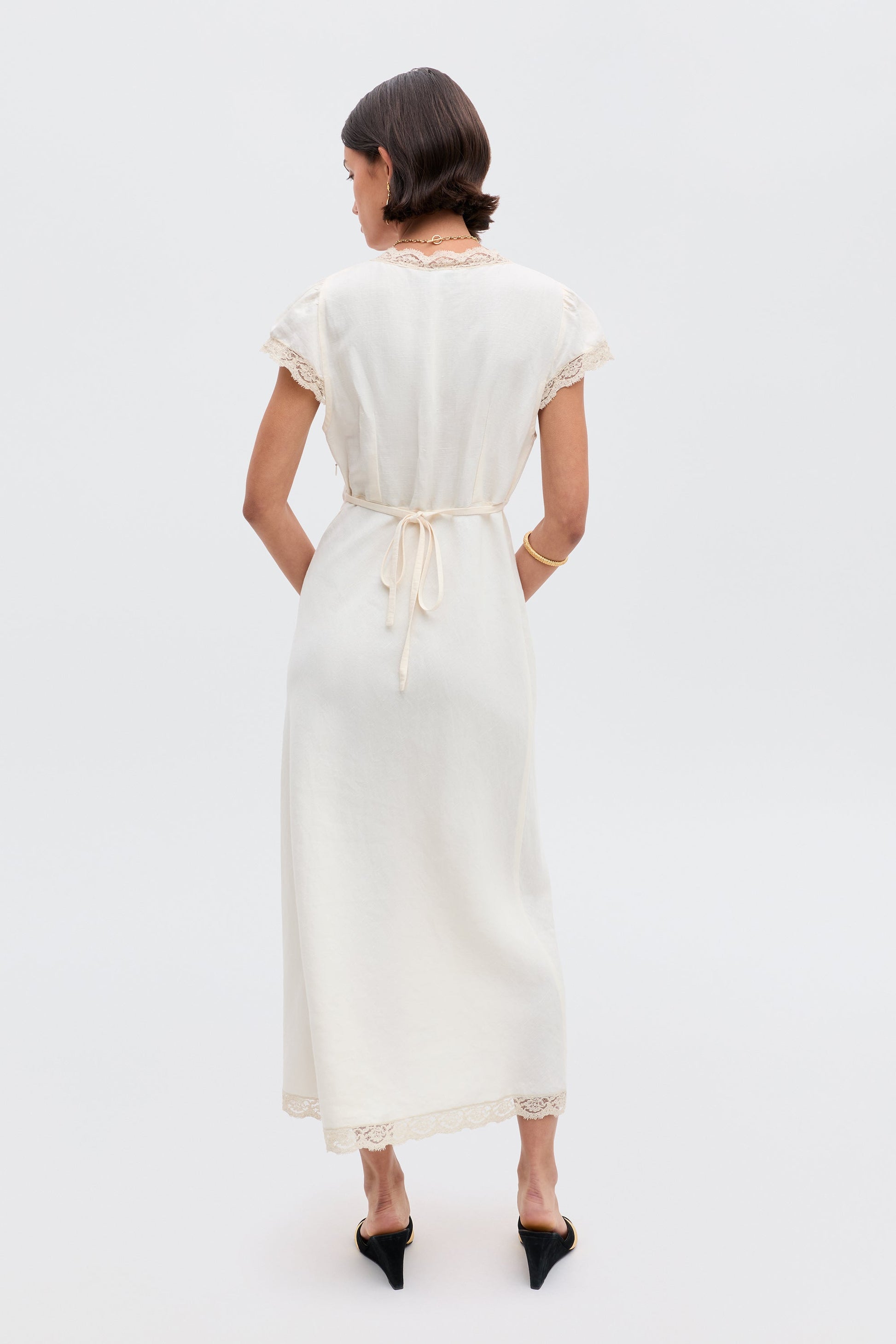 Every wardrobe needs a summery white dress like this Clarice midi. It's based on a vintage nightdress - you'll see the inspirations in the pretty lace and dainty rose trim.