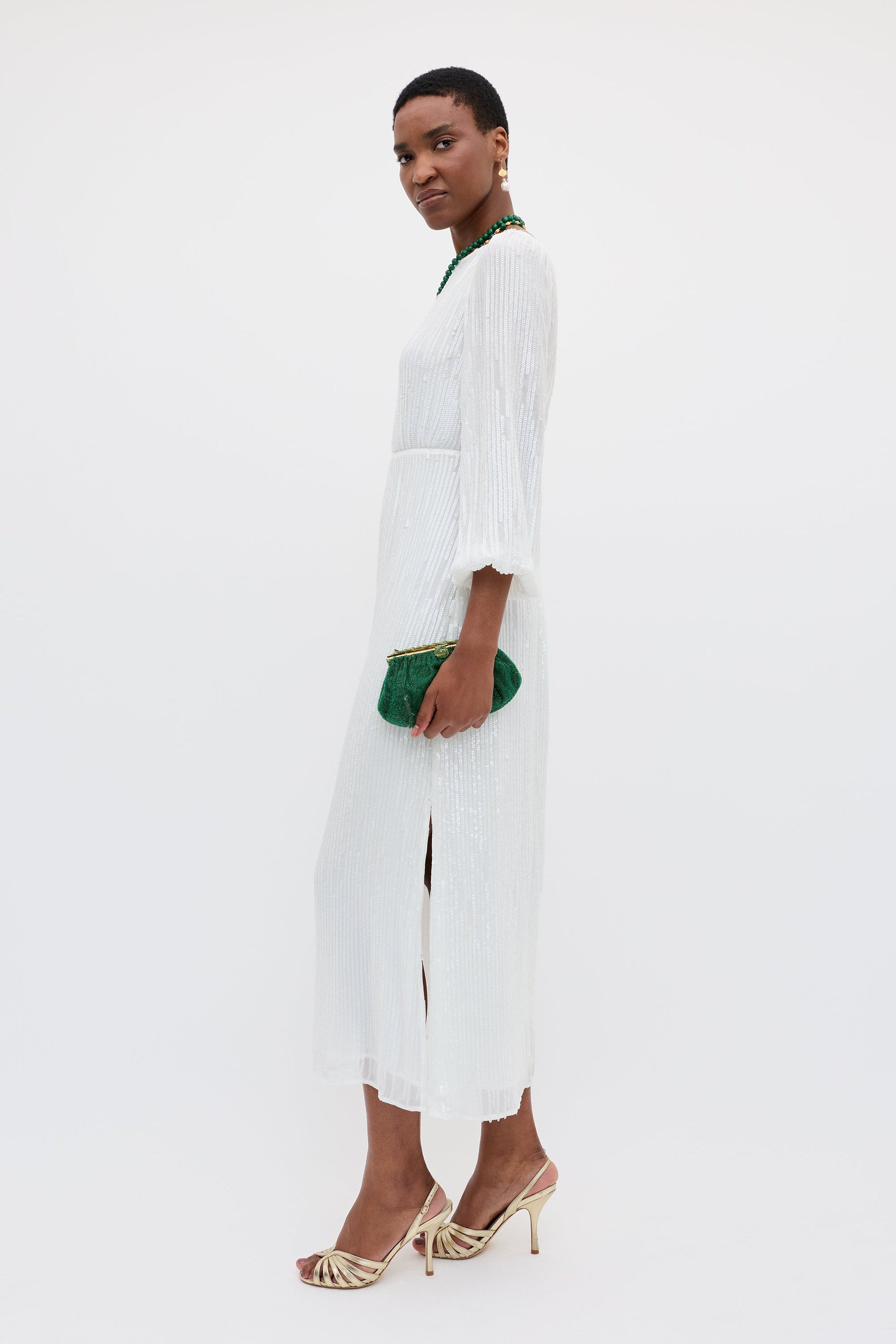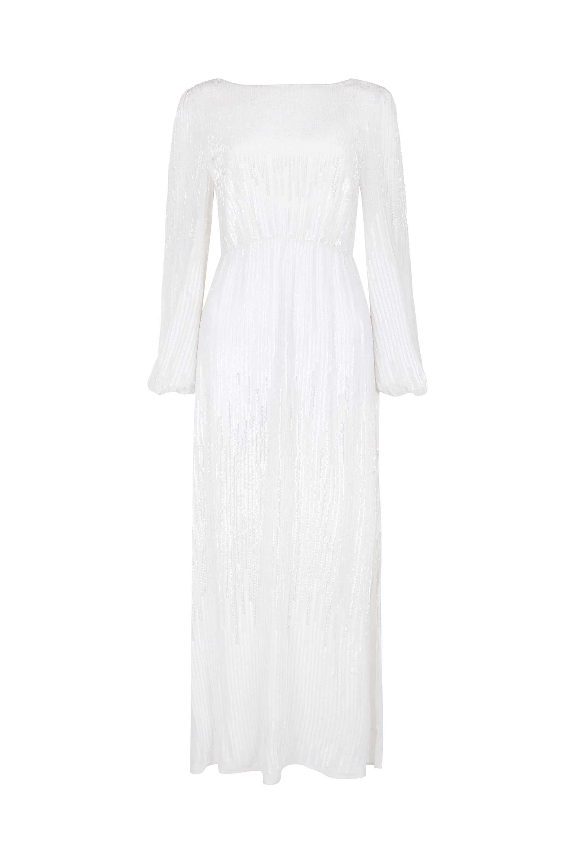 Coco's all-over ivory sequins flatter the fluid fall of her blouson sleeves and figure-skimming, bias-cut skirt. Inspired by vintage wedding gowns, a slender keyhole opening through her back and a high neckline elegantly shape her body.