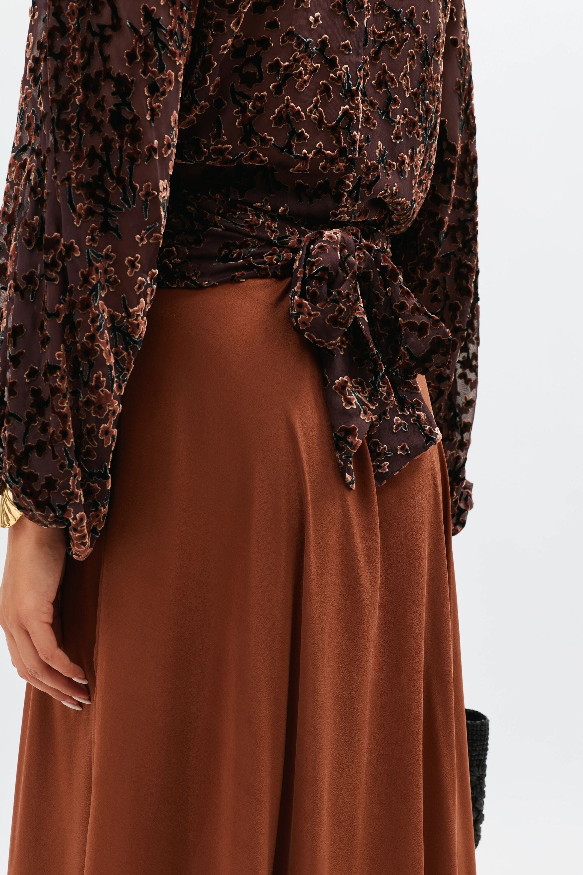 Introducing Cody, a beautiful cropped velvet wrap blouse. A new shape for us, with an adjustable waist fastening for a relaxed fit. Vintage-inspired in colour, burn out texture and silhouette, its blousy sleeves and '70s glam bohemia feel make it the perfect statement separate. Pair yours with your go-to RIXO skirt.