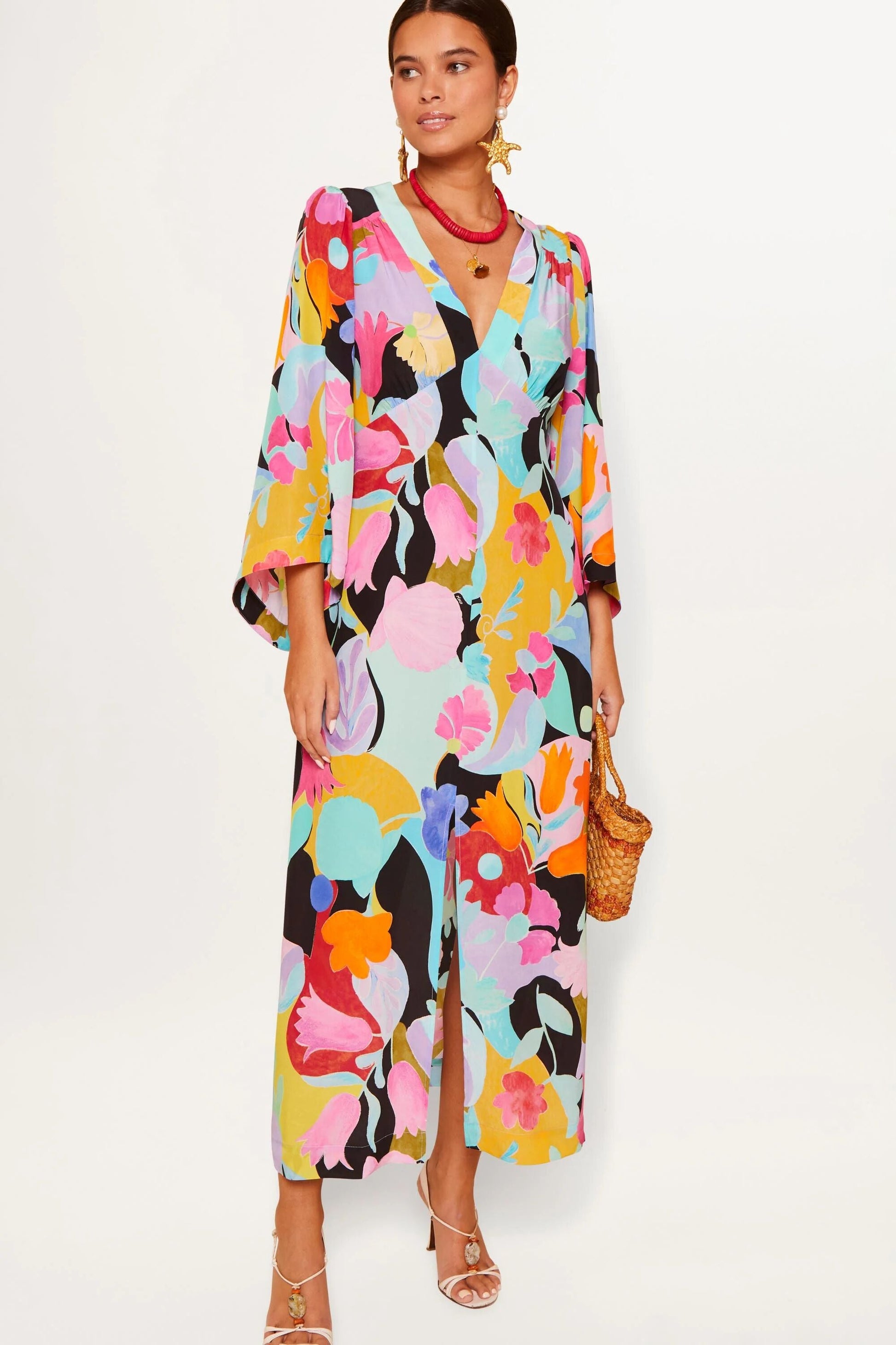 Available in regular and petite. Make a statement at your next event in this Dahlia dress. It's made from silk crepe de chine with dramatic sleeves and a split at the leg.