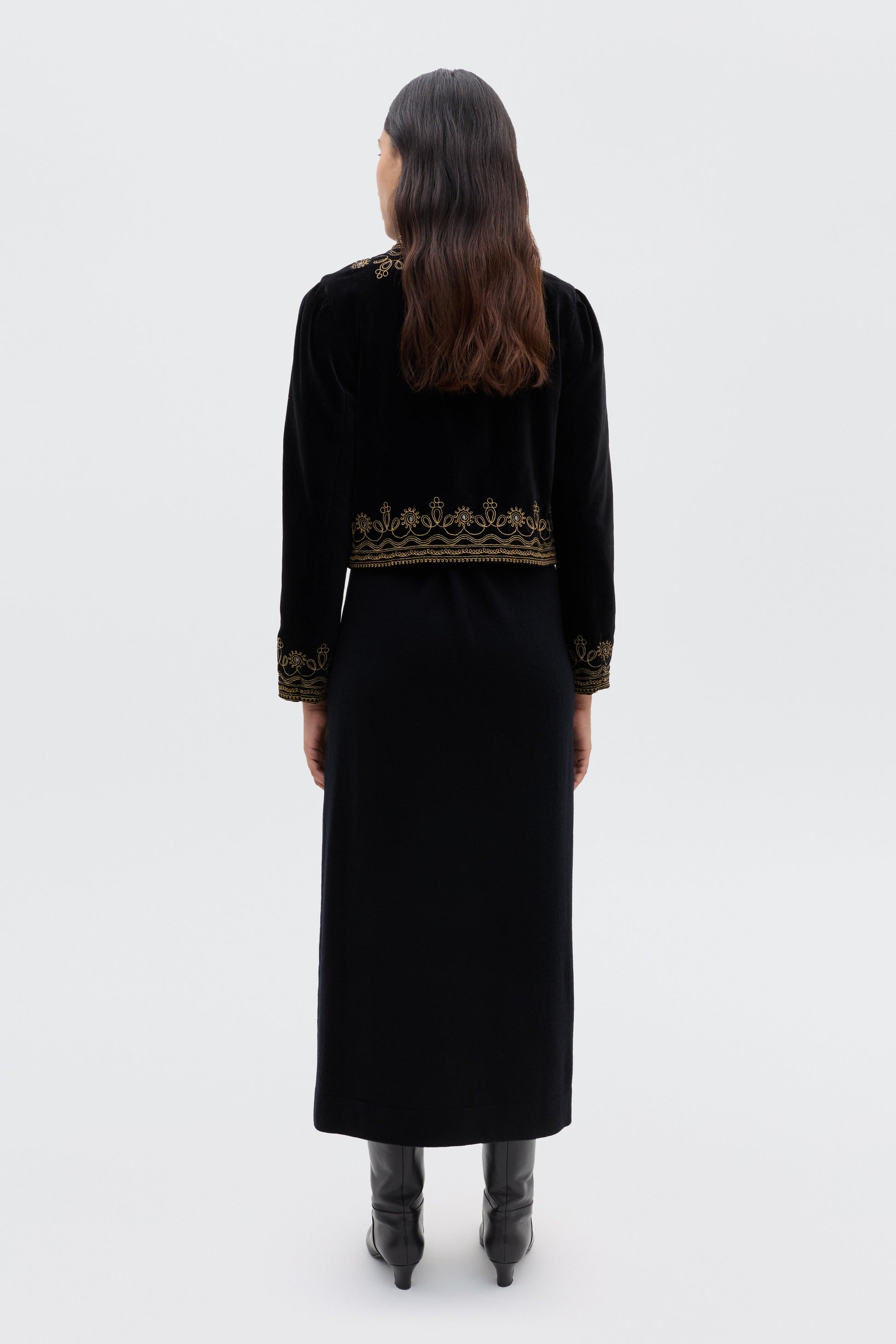 The Denver is a rich black cotton-velvet jacket with intricate gold soutache embroidery designed by hand.