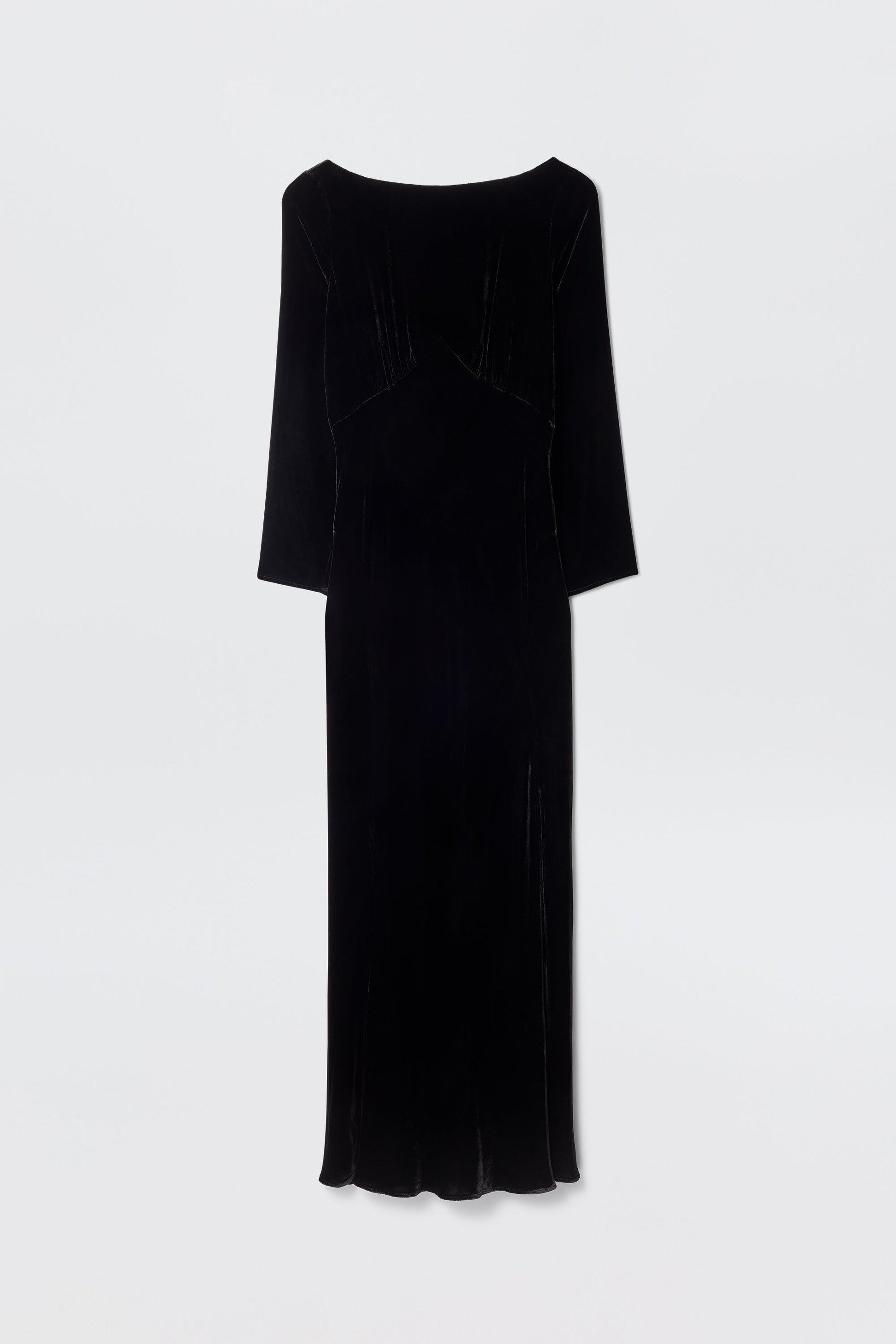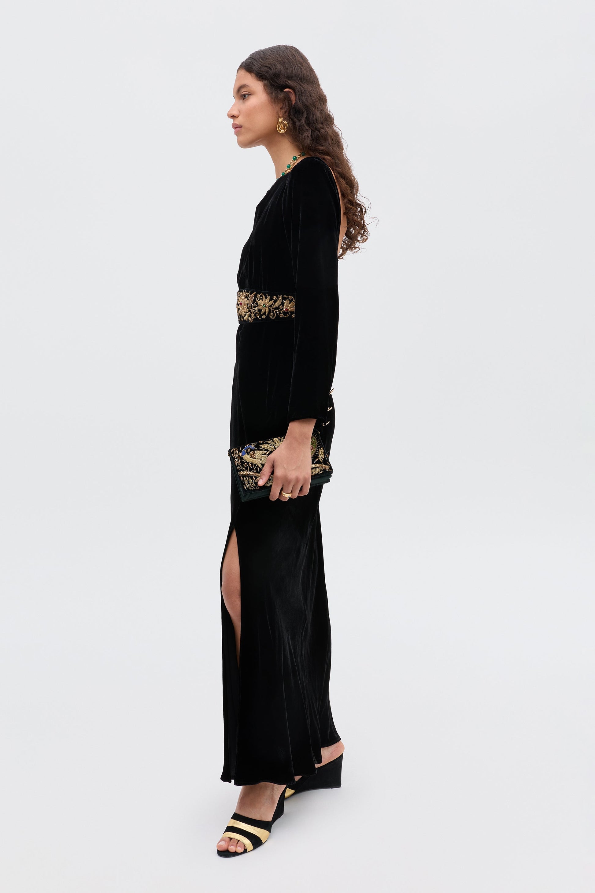 Devina is a classic black velvet gown - elegant and striking at the same time. It's designed with an underbust seam and slim sleeves for definition, plus a low back and side slit that show a flash of skin.