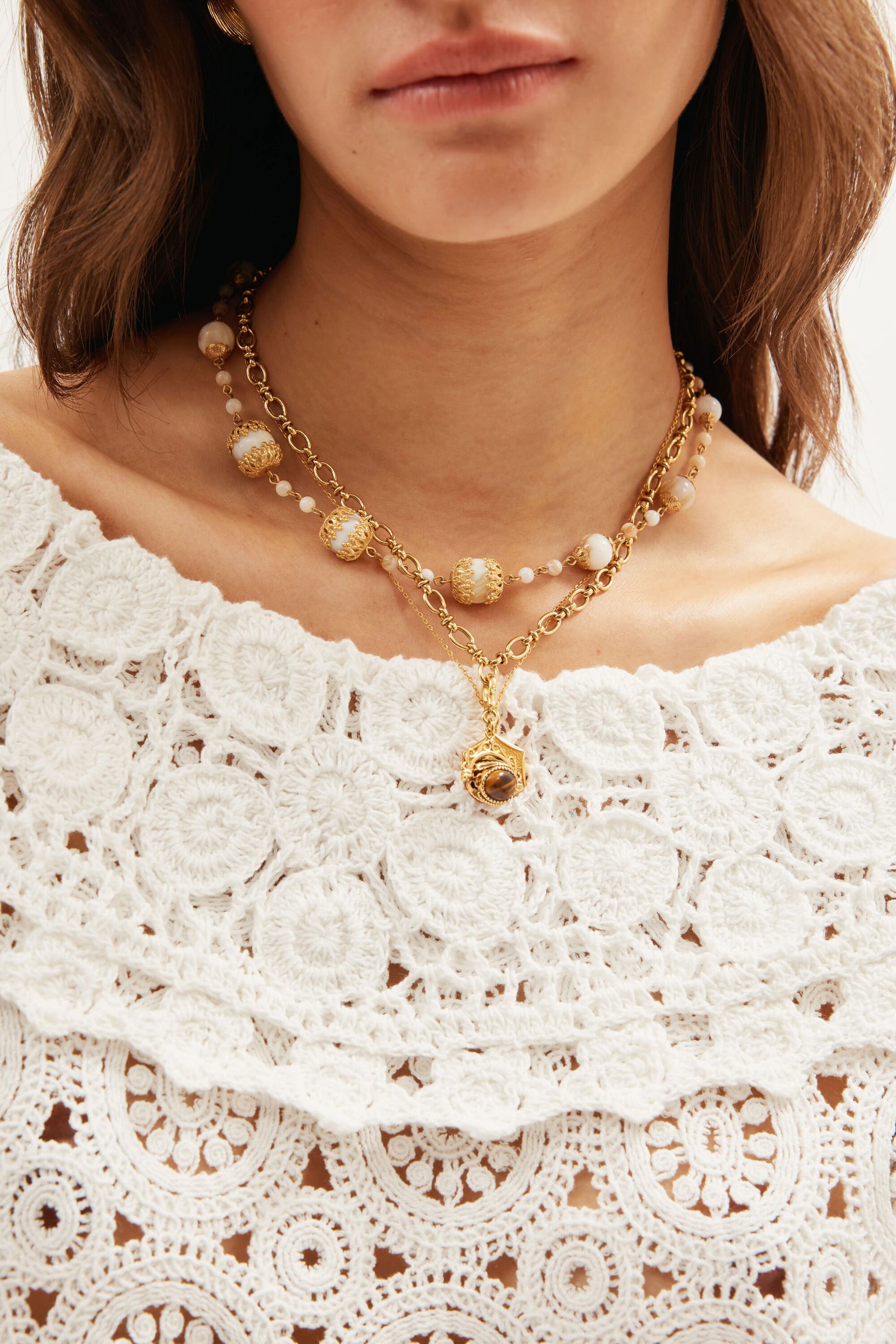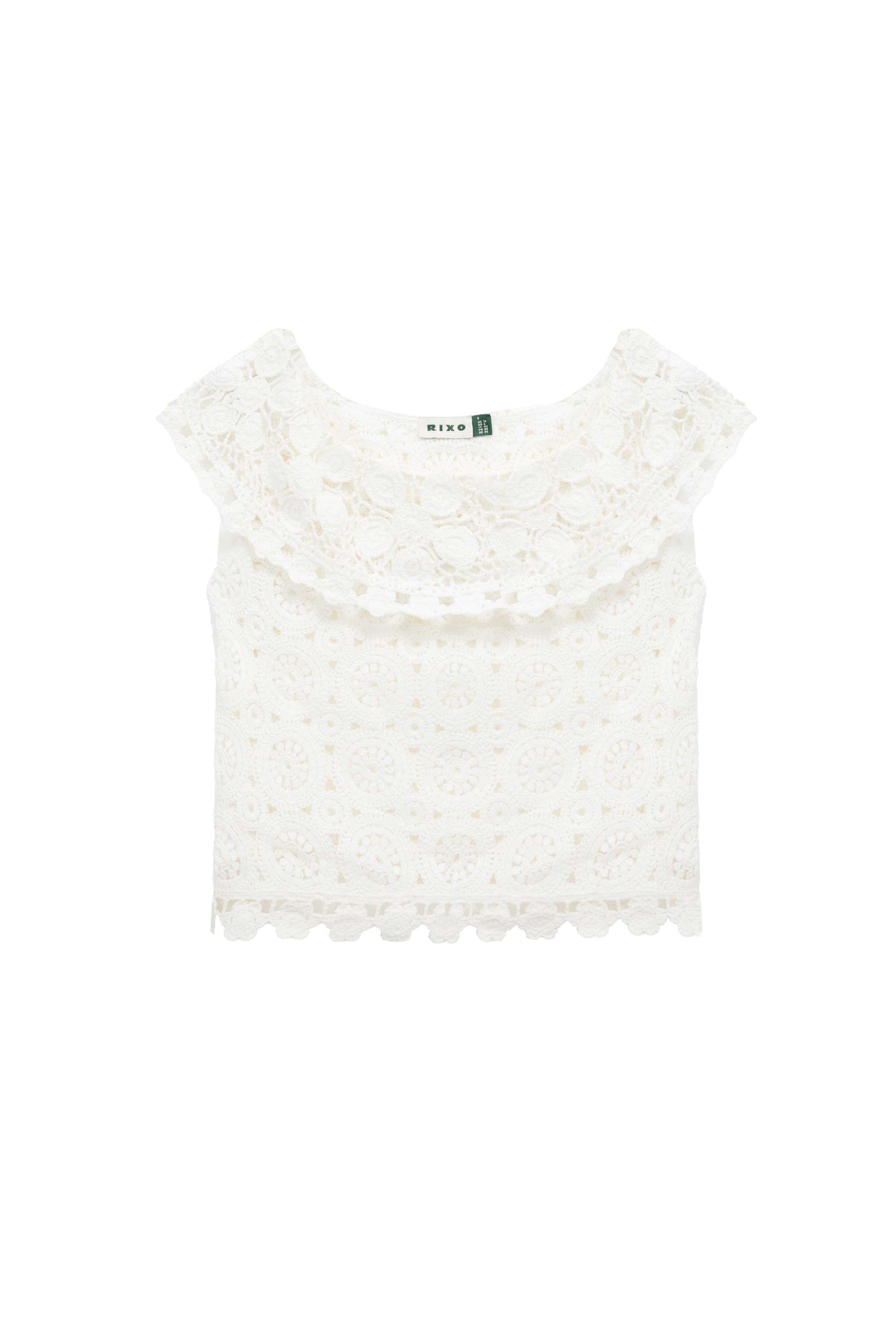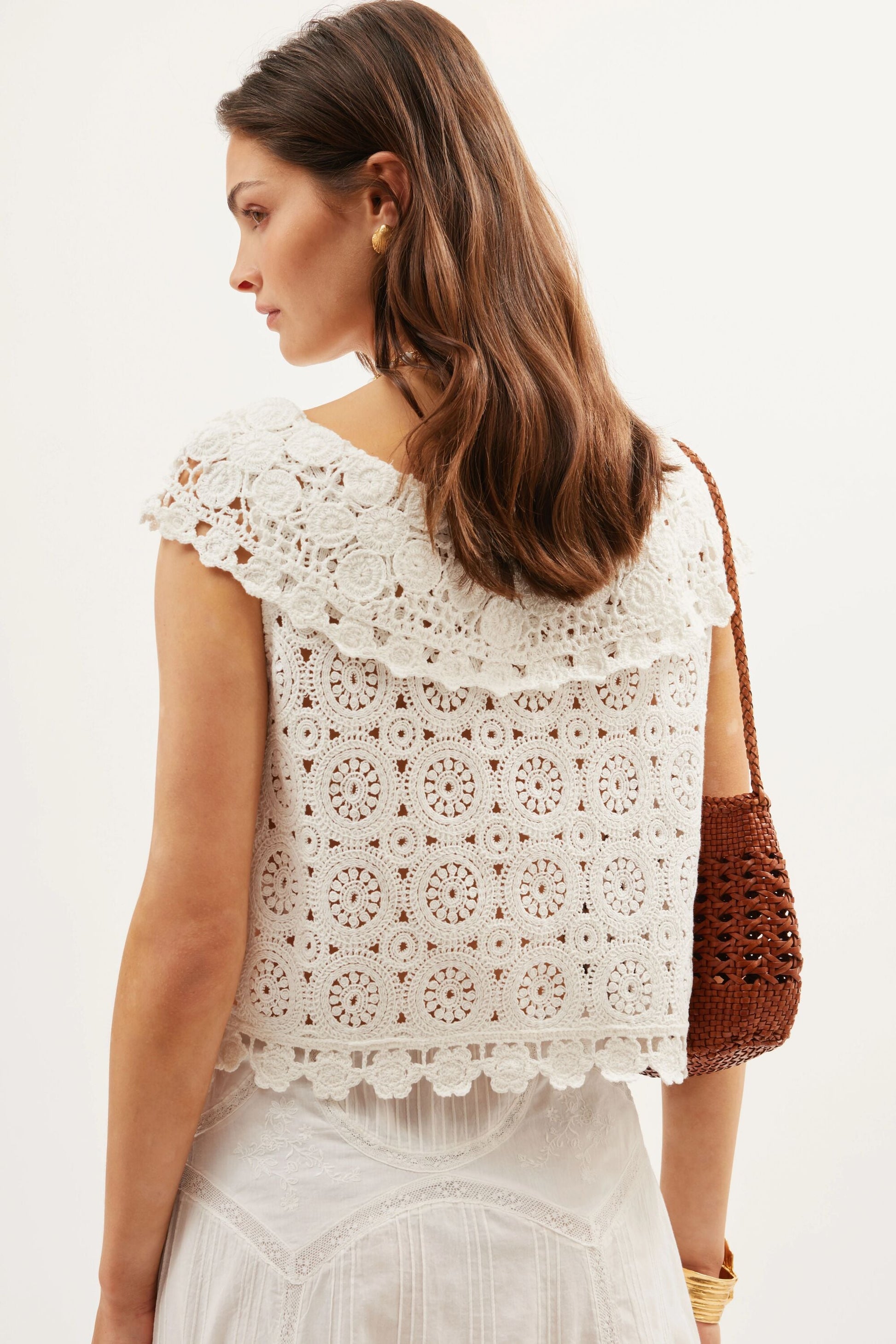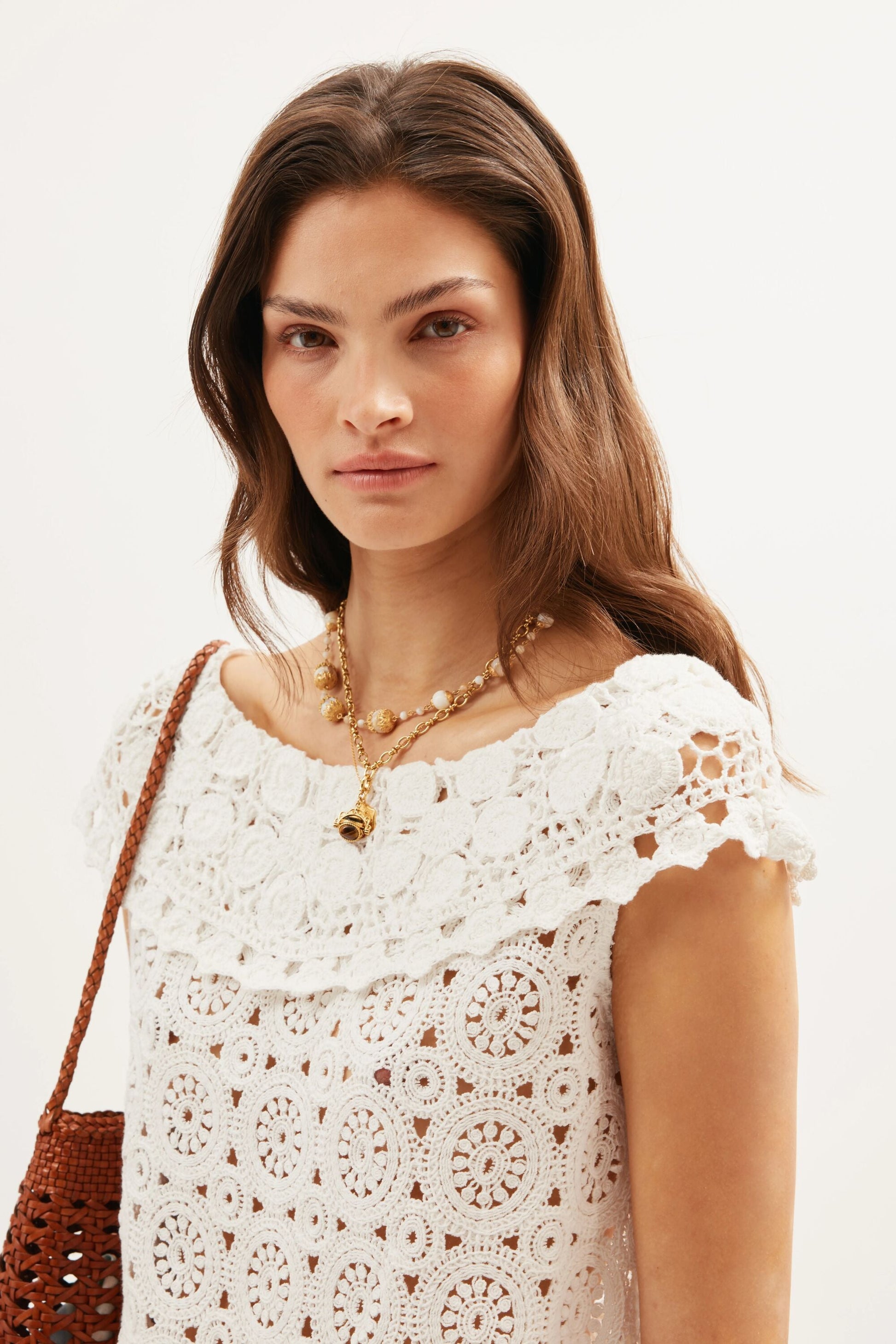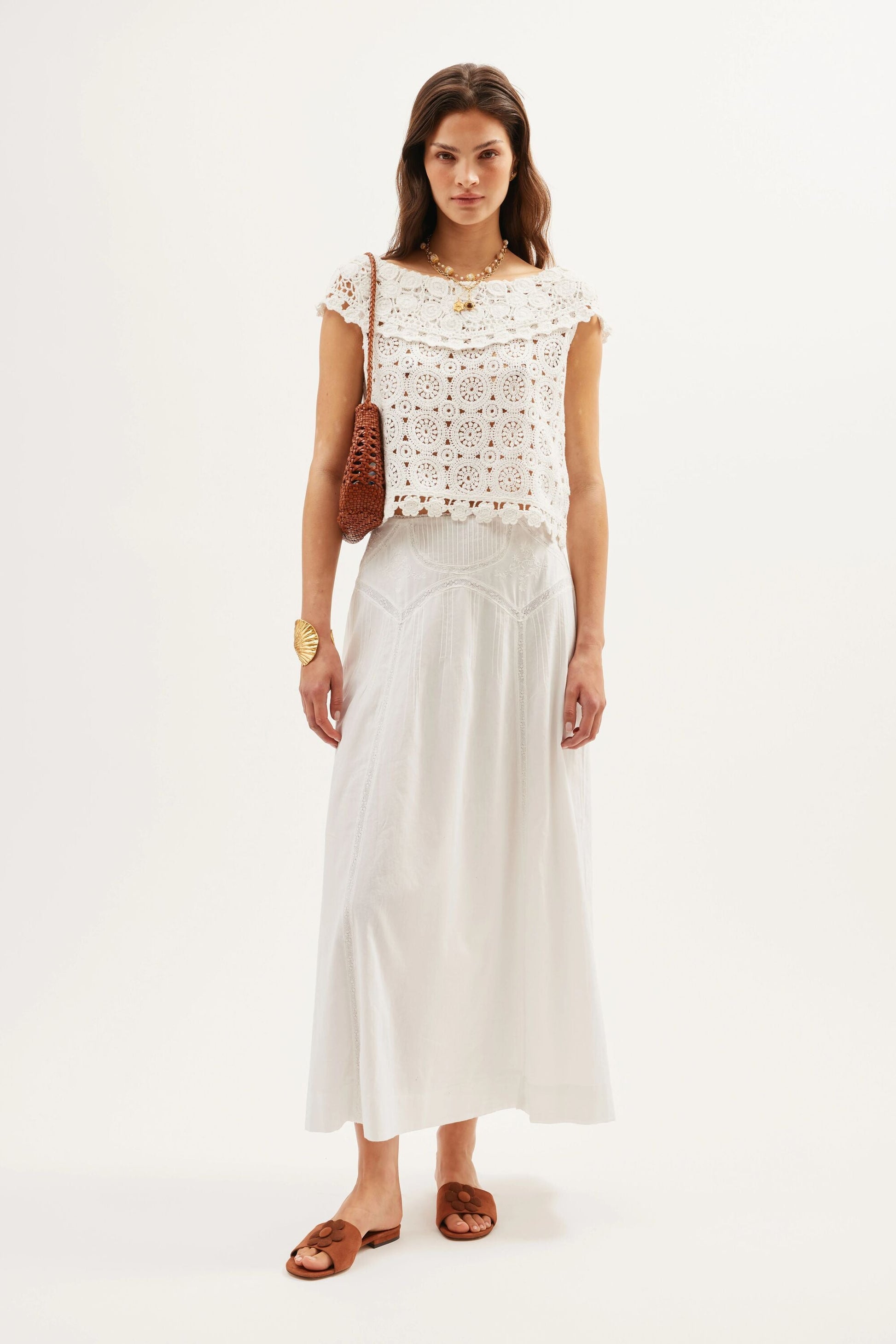 This Eimear top is perfect for pairing with our printed skirts. It's crocheted for a vintage feel and traced with hand-crocheted trims. Prefer a dress? You'll love Envalira.