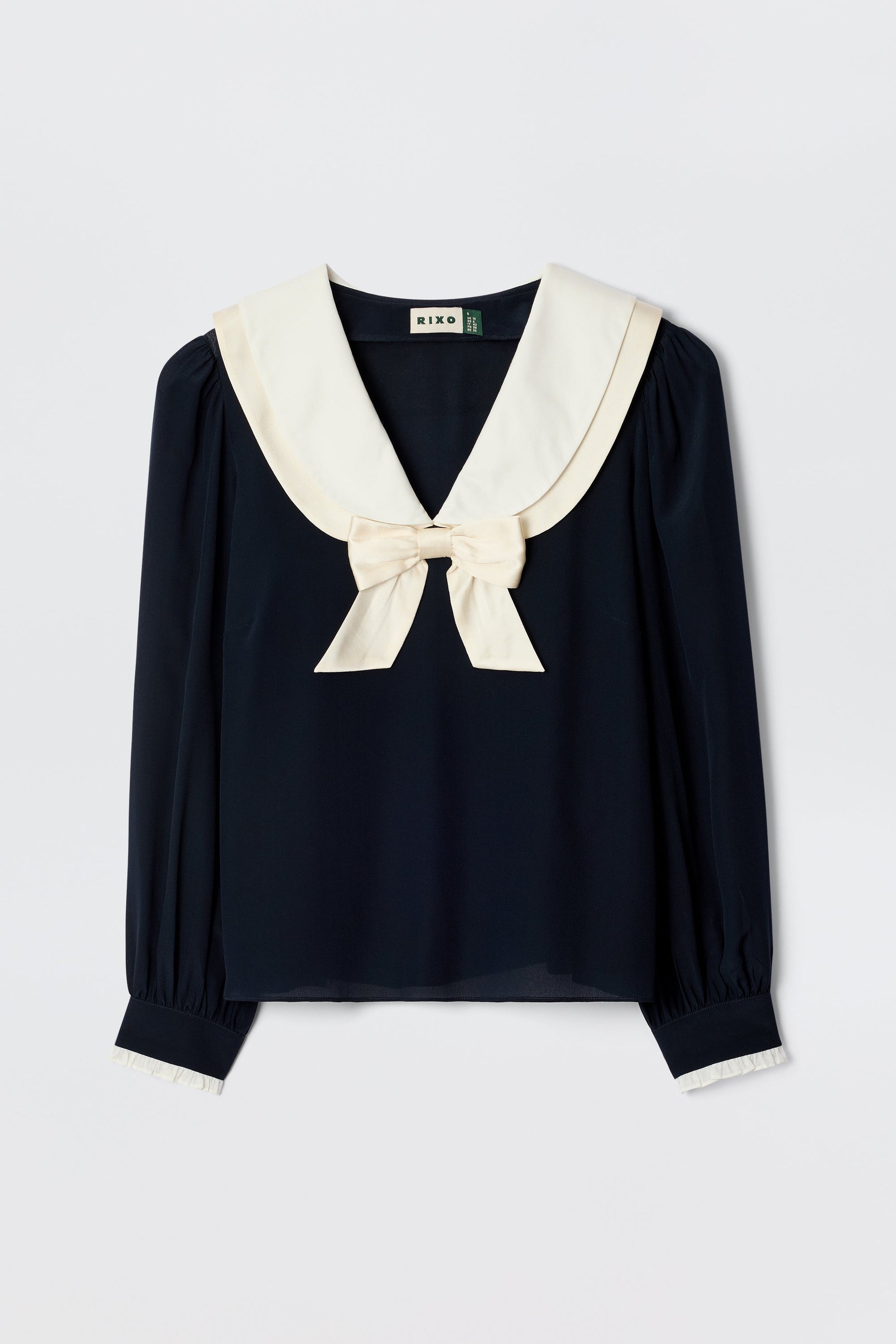 The Eimer silk top is a little nautical inspired, with a layered sailor-style collar and loose navy body. The blouson sleeves are trimmed with ladylike frilled cuffs you don't often see below deck. She is styled here with our Crystal skirt.