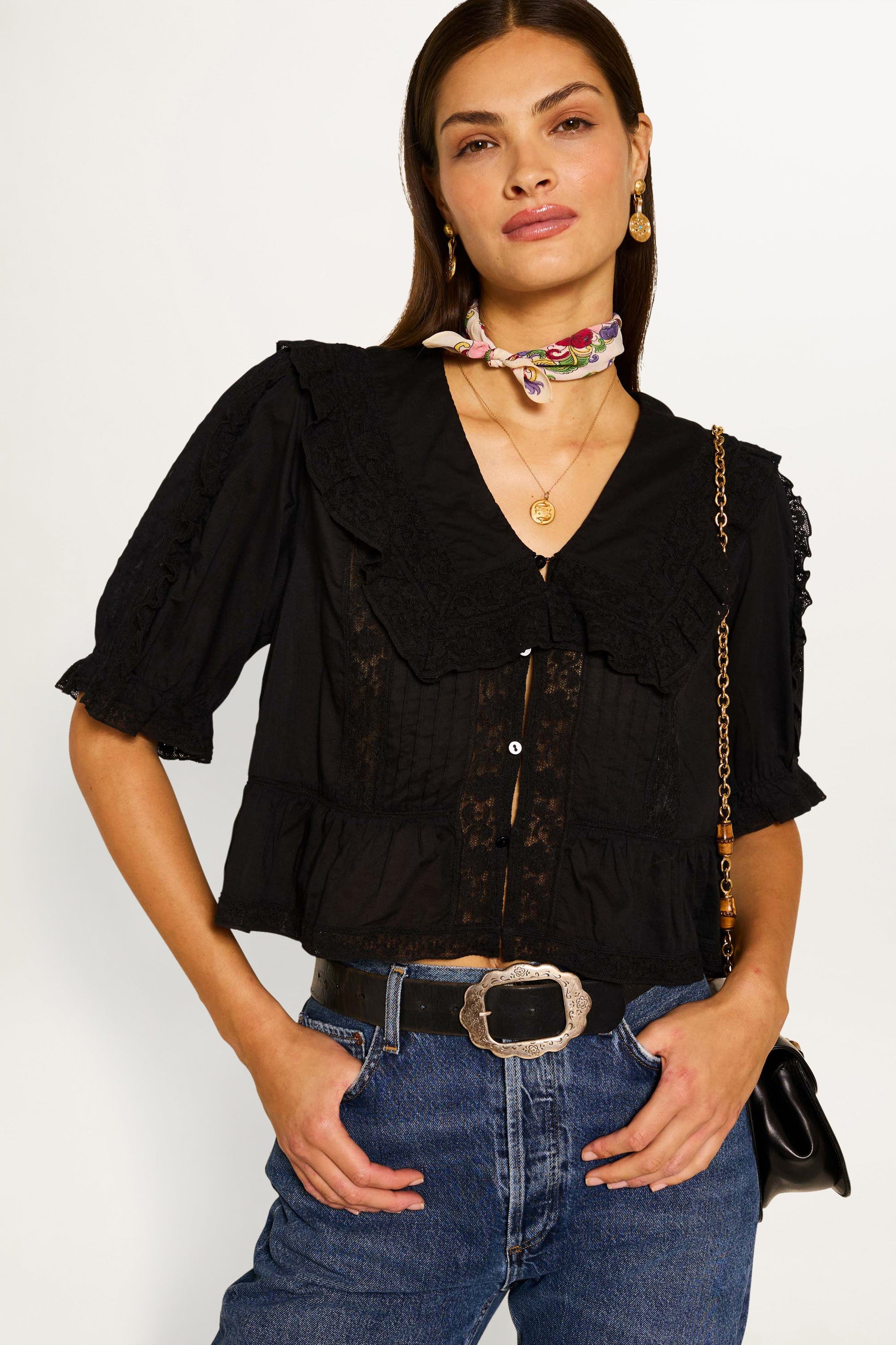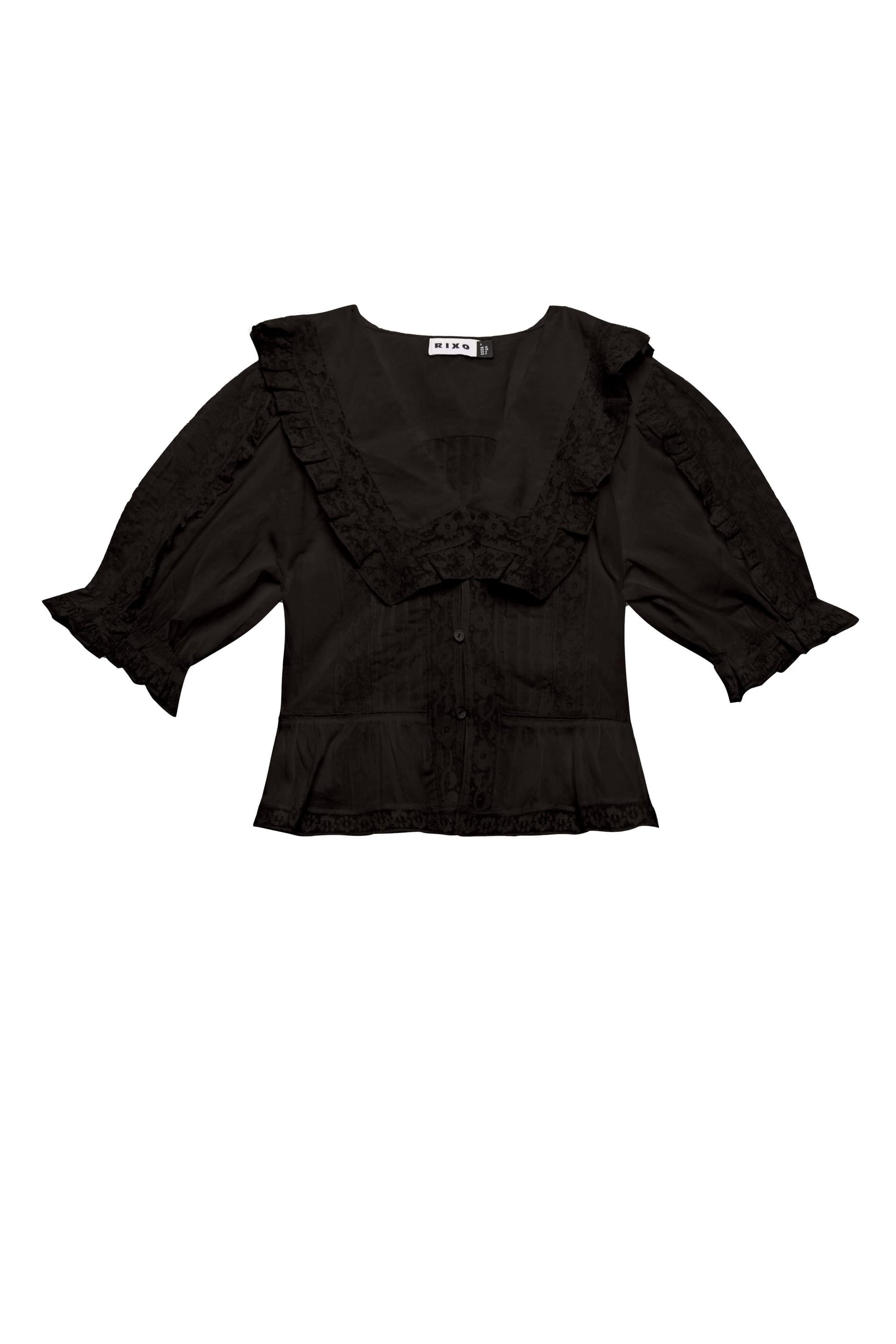 The Ellery is a romantic black cotton button-down top with a ruffled collar, blousy sleeves, and antique-look lace. She is just as timeless as the vintage that inspired her and has a relaxed and floaty fit that flatters every figure.
