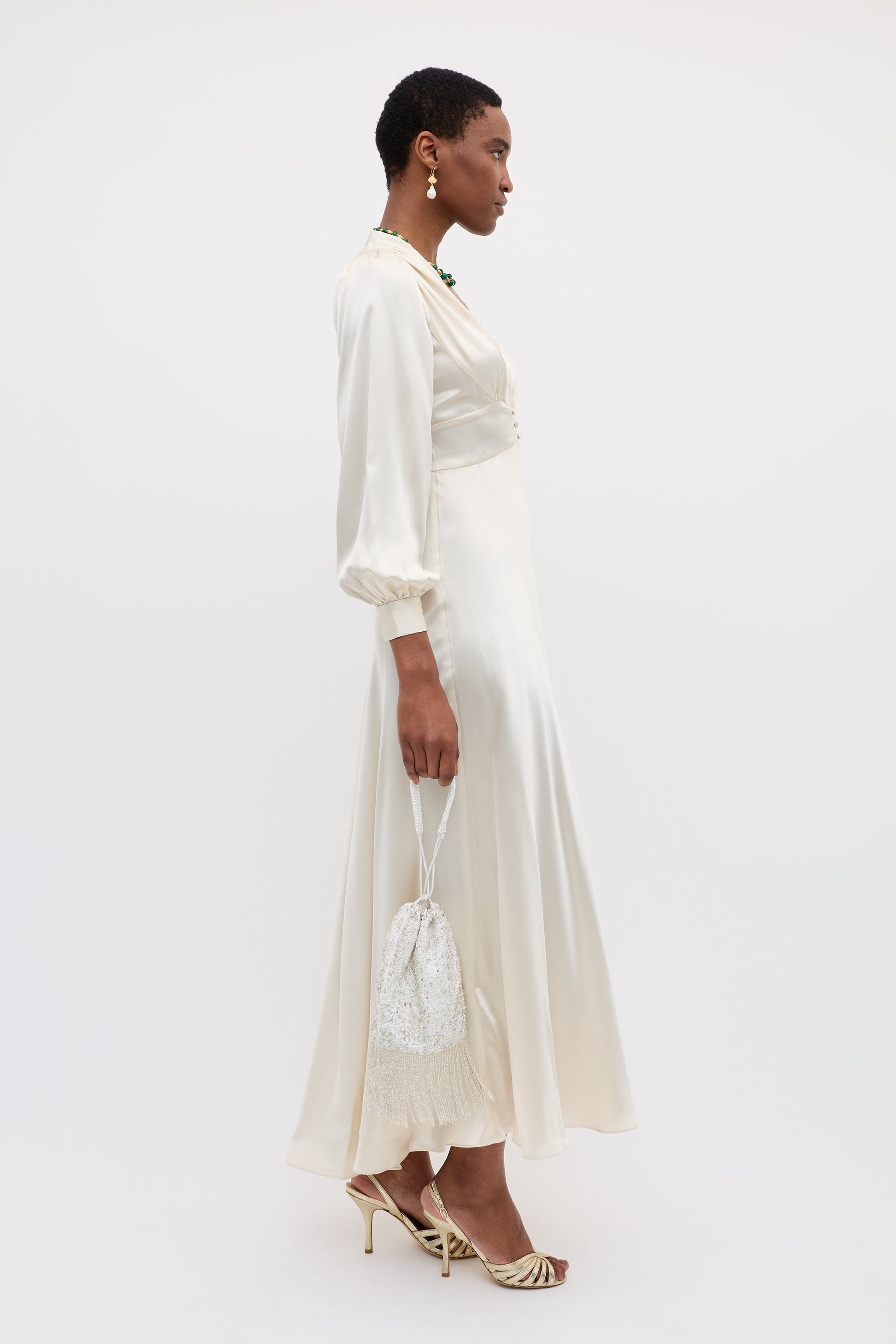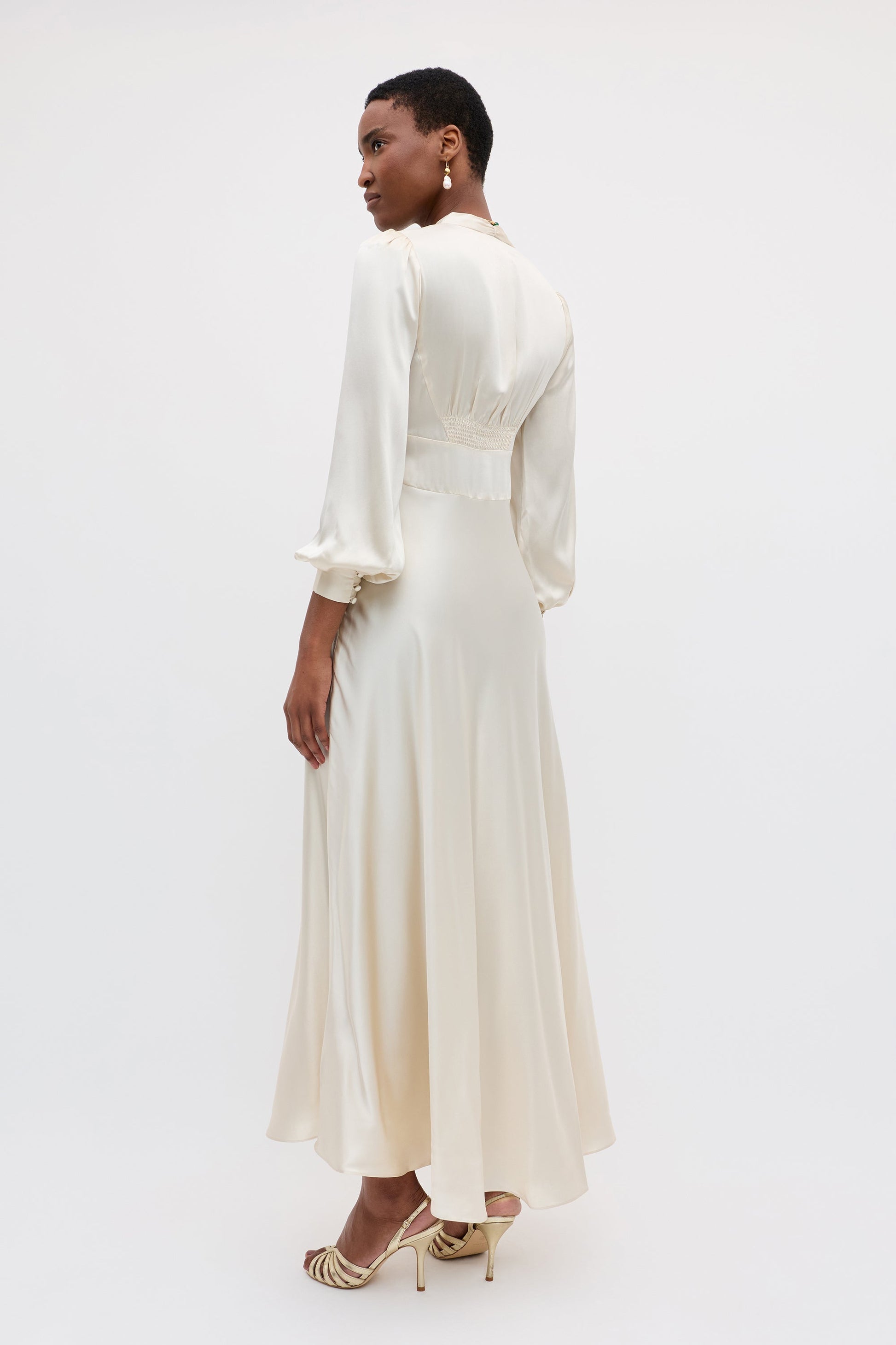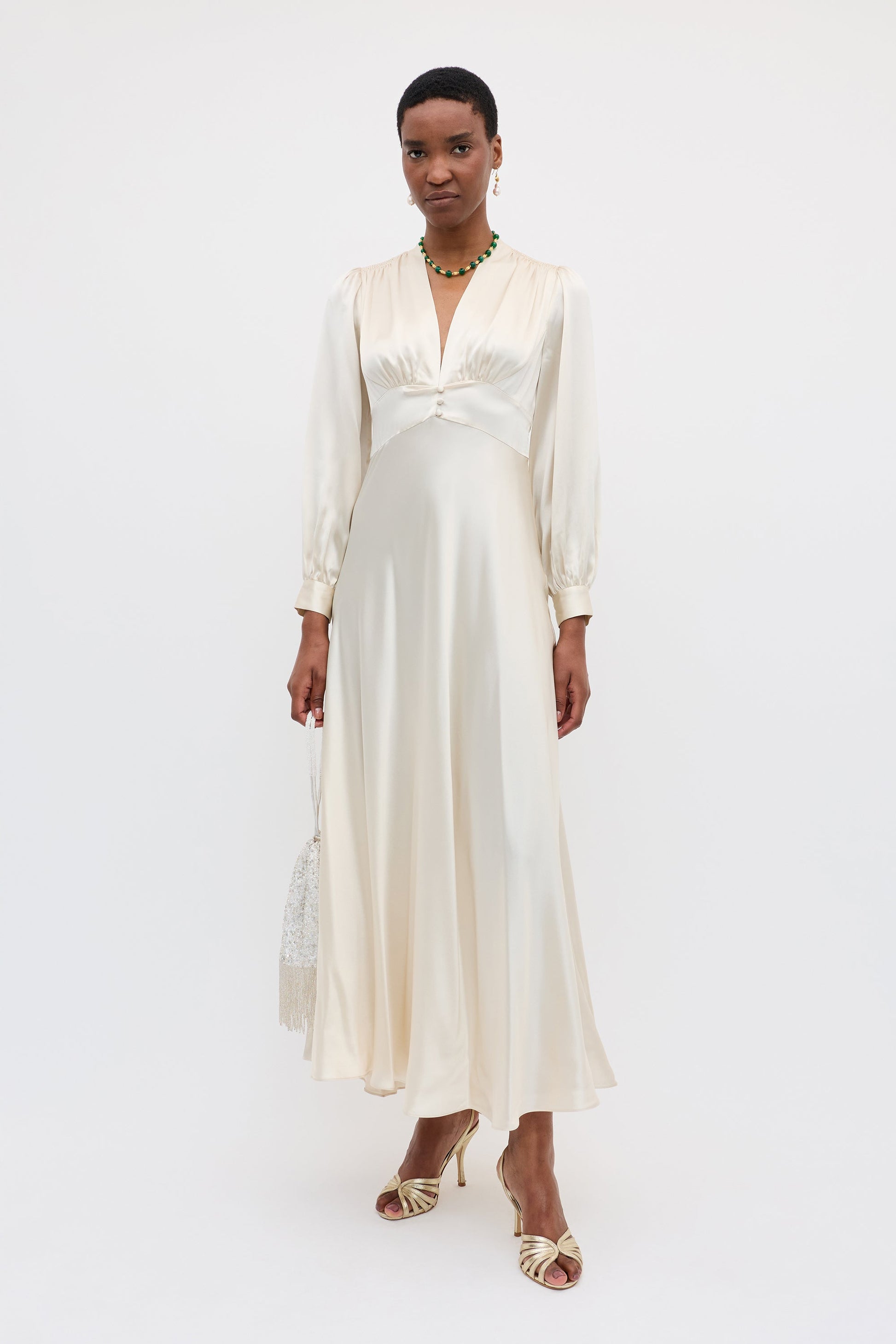 Feminine and refined. Discover RIXO’s iconic Emory gown, now in our elegant Pearl colourway. Crafted from luxurious silk, with its deep V-neck, nipped in waistband and long blouson sleeves, it’s a timeless choice for life’s most special moments.