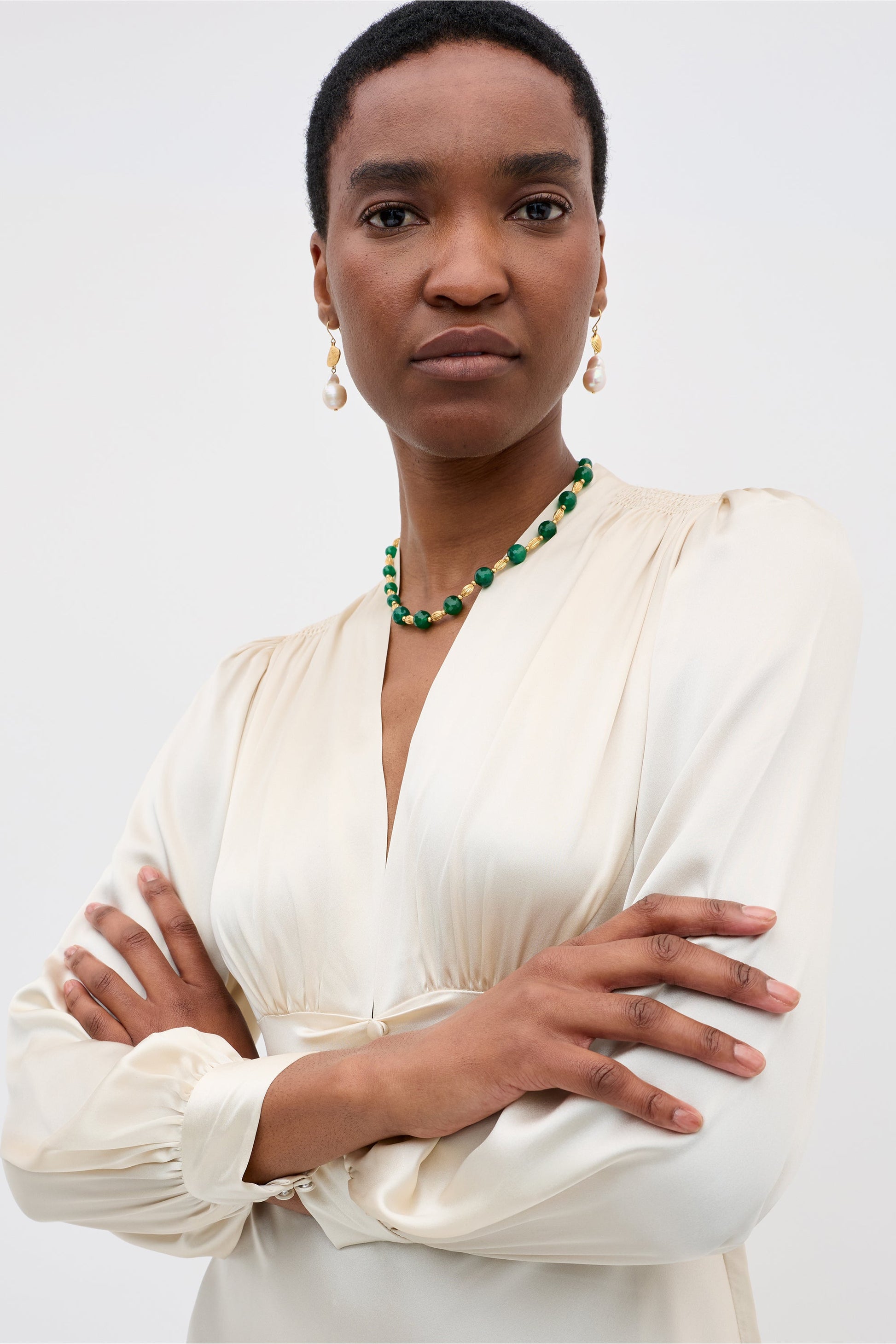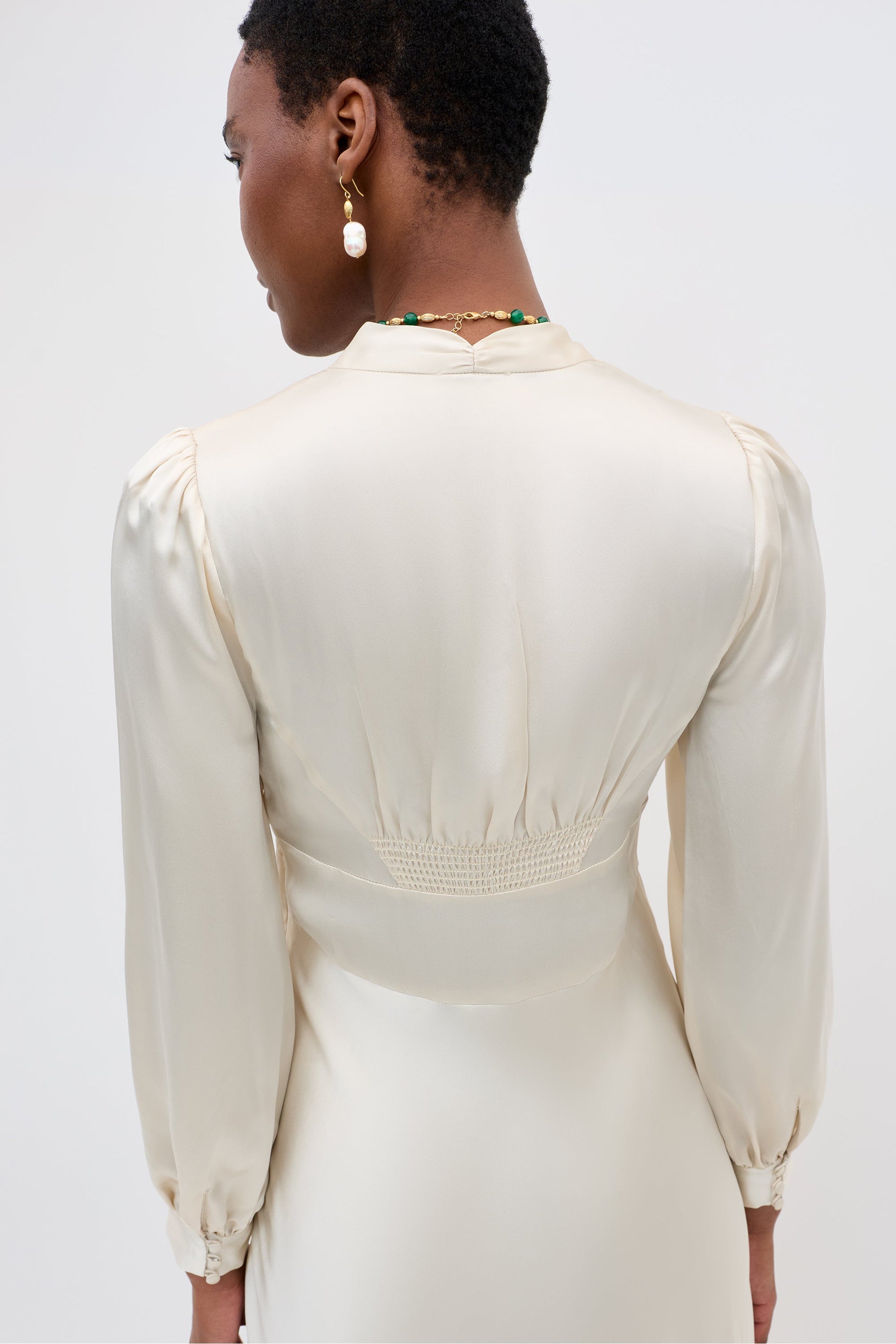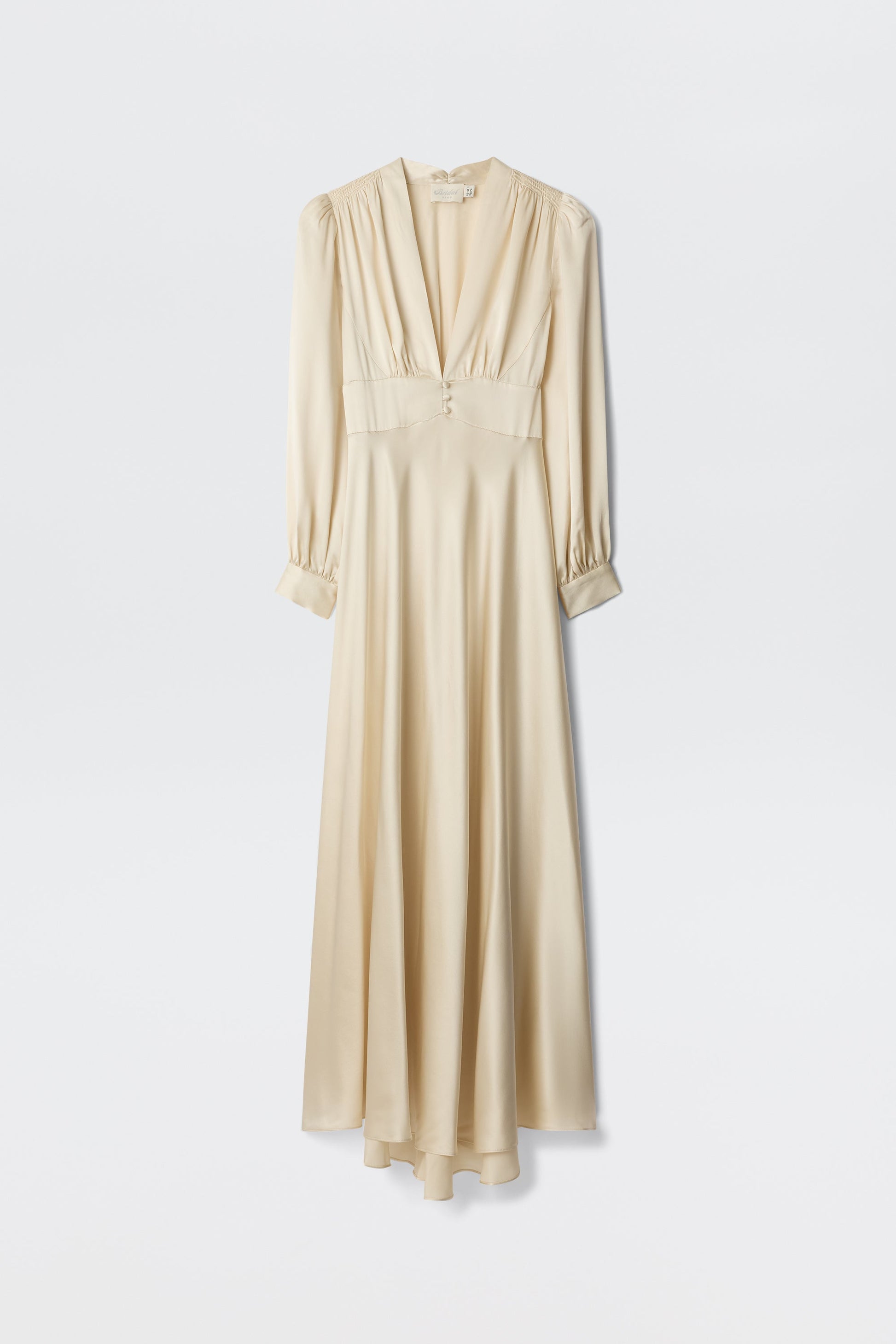 Feminine and refined. Discover RIXO’s iconic Emory gown, now in our elegant Pearl colourway. Crafted from luxurious silk, with its deep V-neck, nipped in waistband and long blouson sleeves, it’s a timeless choice for life’s most special moments.