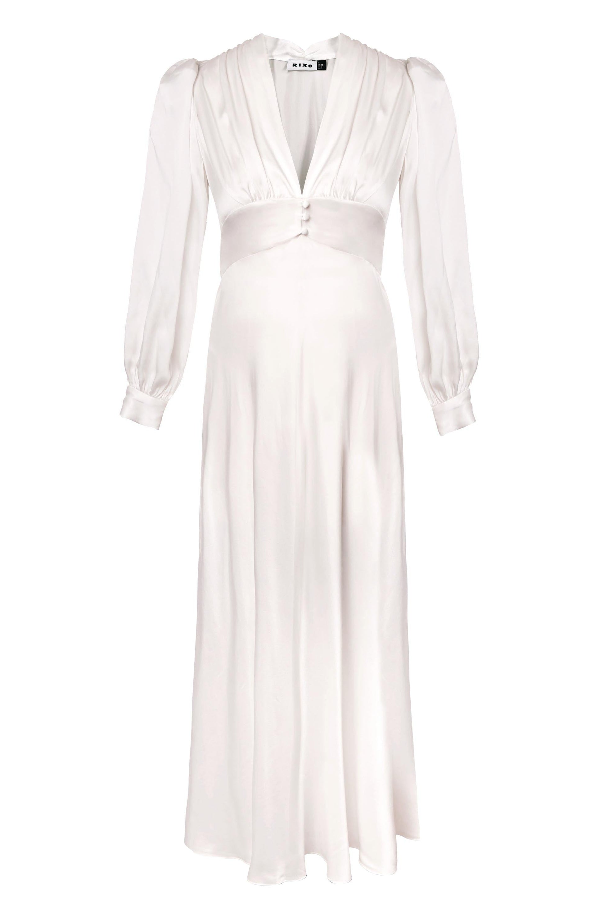 Look incredible in our Emory silk bridal gown with long blouson sleeves and and a deep V-neckline.