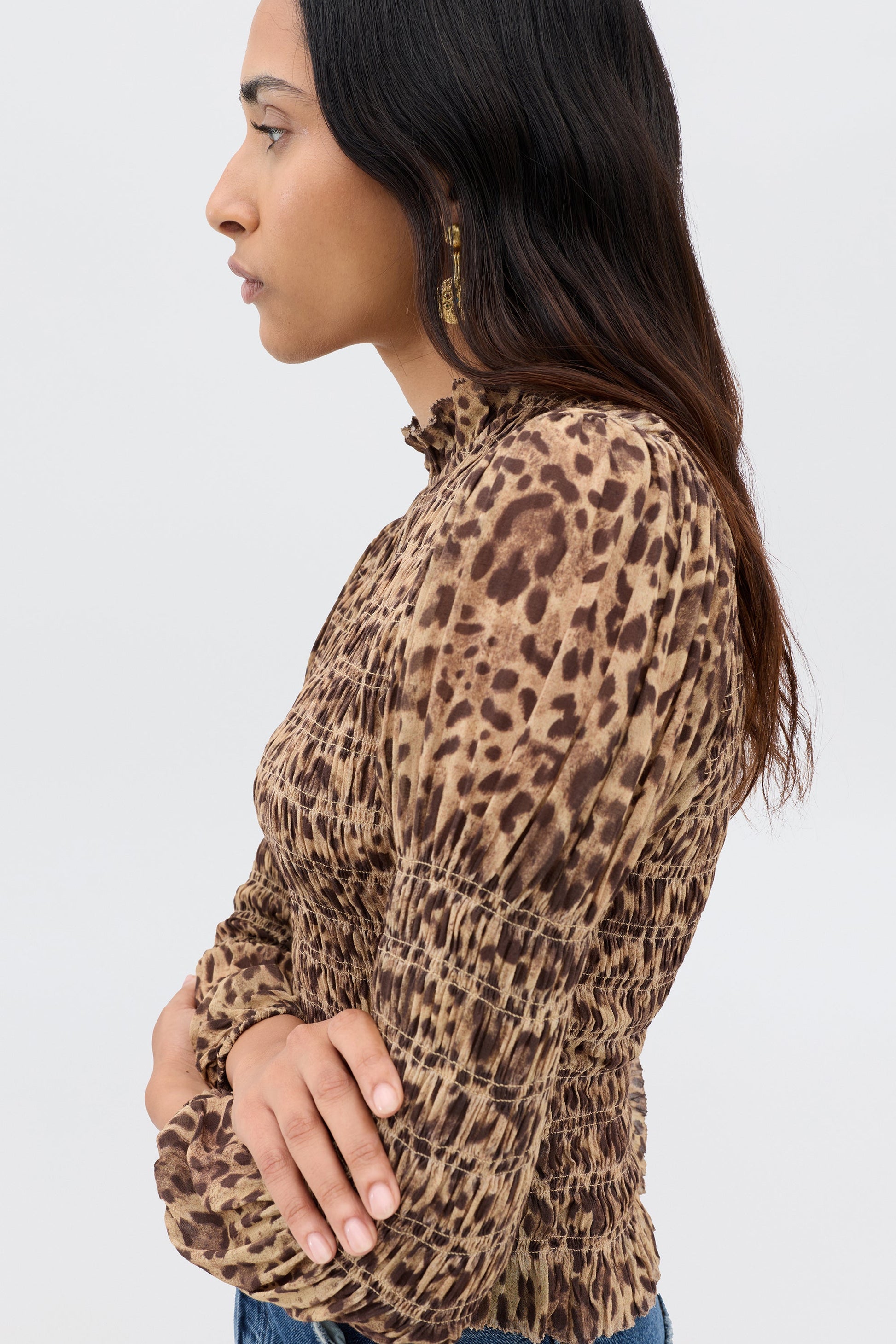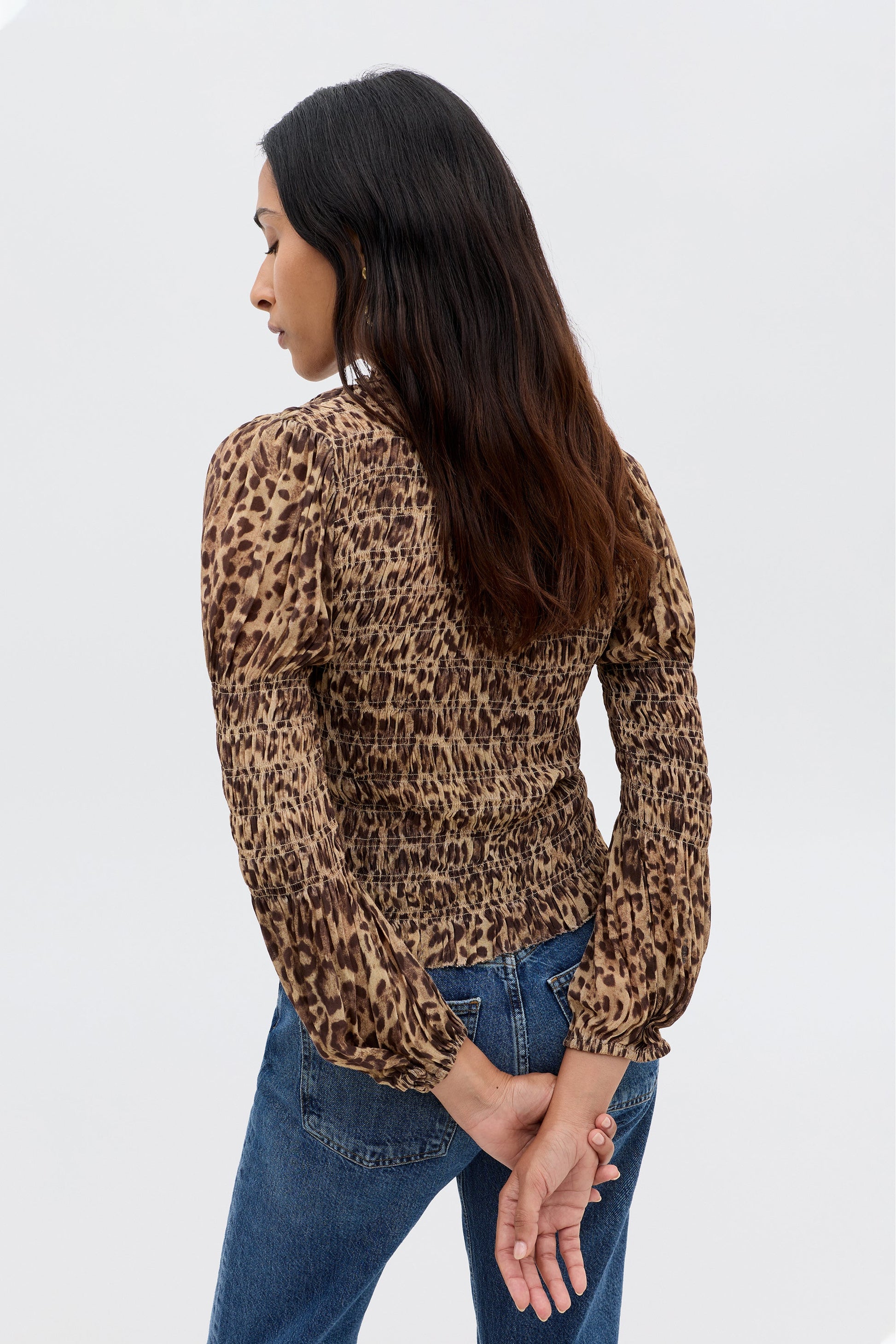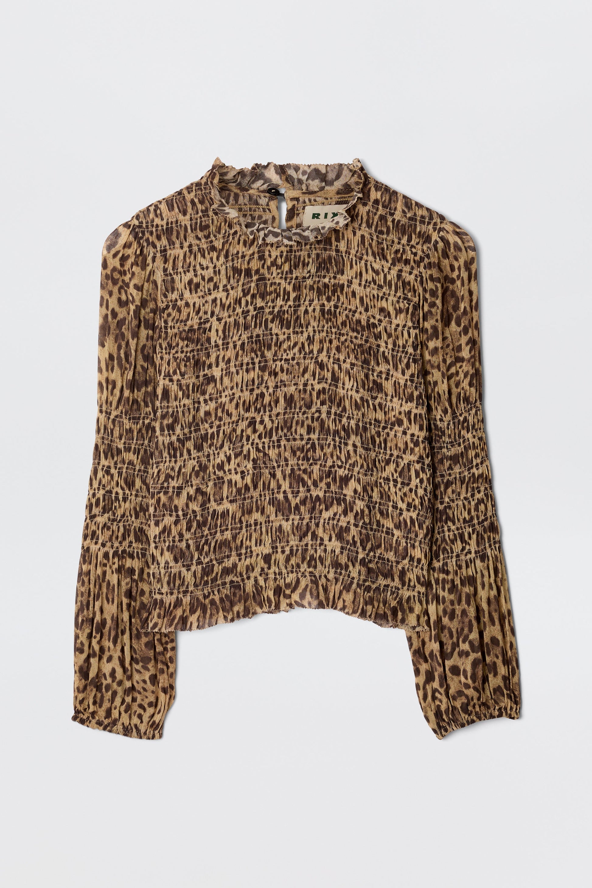 Our Gardenia top is vintage-inspired and easy to dress up as well as down. Crafted from a beautiful georgette, it feels elevated and timeless, with textured smocking for structure. The high neckline has a romantic ruffle trim, and the sleeves are cinched in at the elbows, creating a playful balloon shape on the shoulders and sleeves. Style with your favourite RIXO skirts in a contrasting print for an eclectic, statement look.