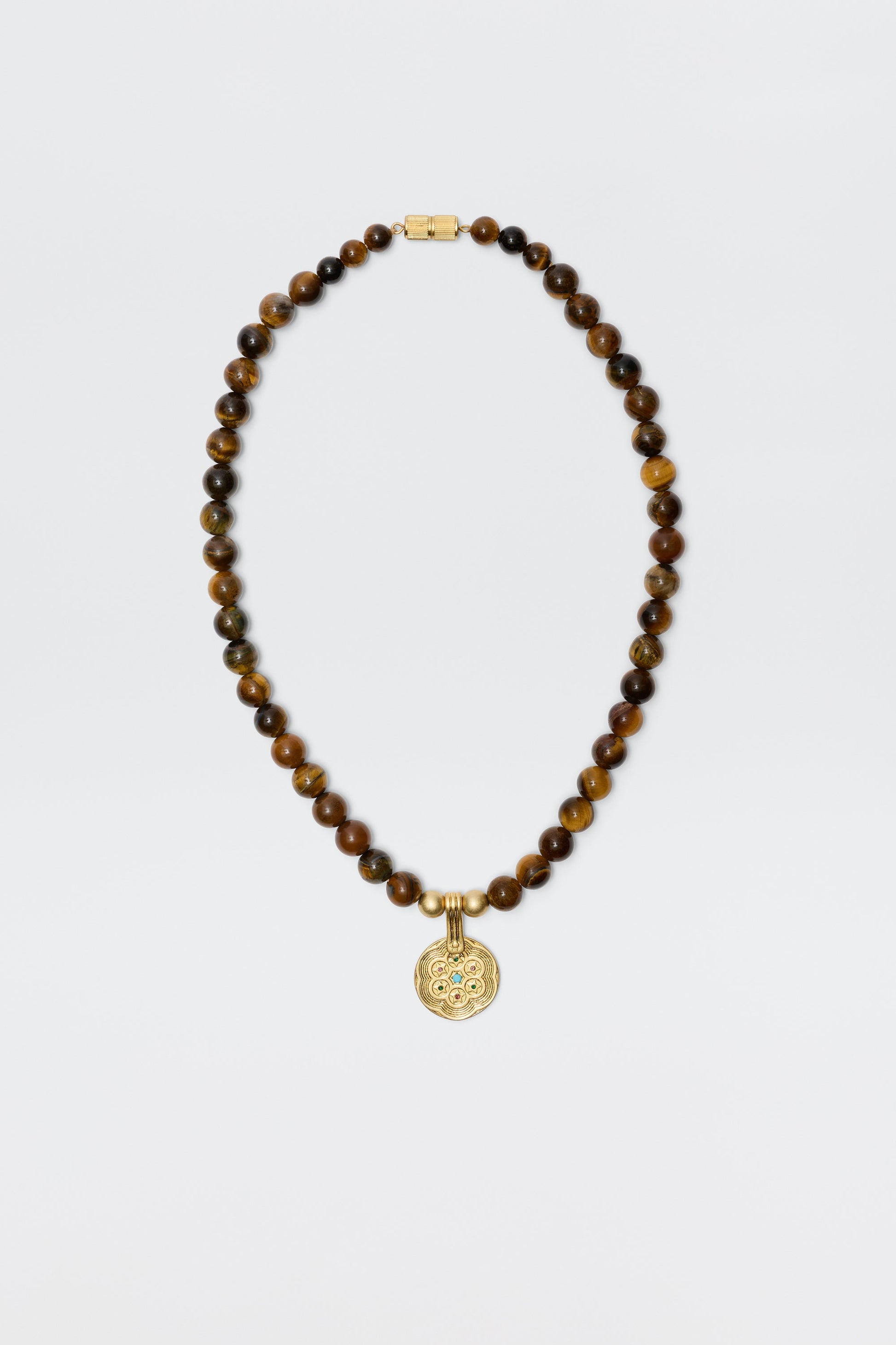 We've updated our Ischia necklace with tiger's eye beads - the semi-precious stone has natural marbling that means every one is unique. The barrel clasp twists shut to keep it secure.