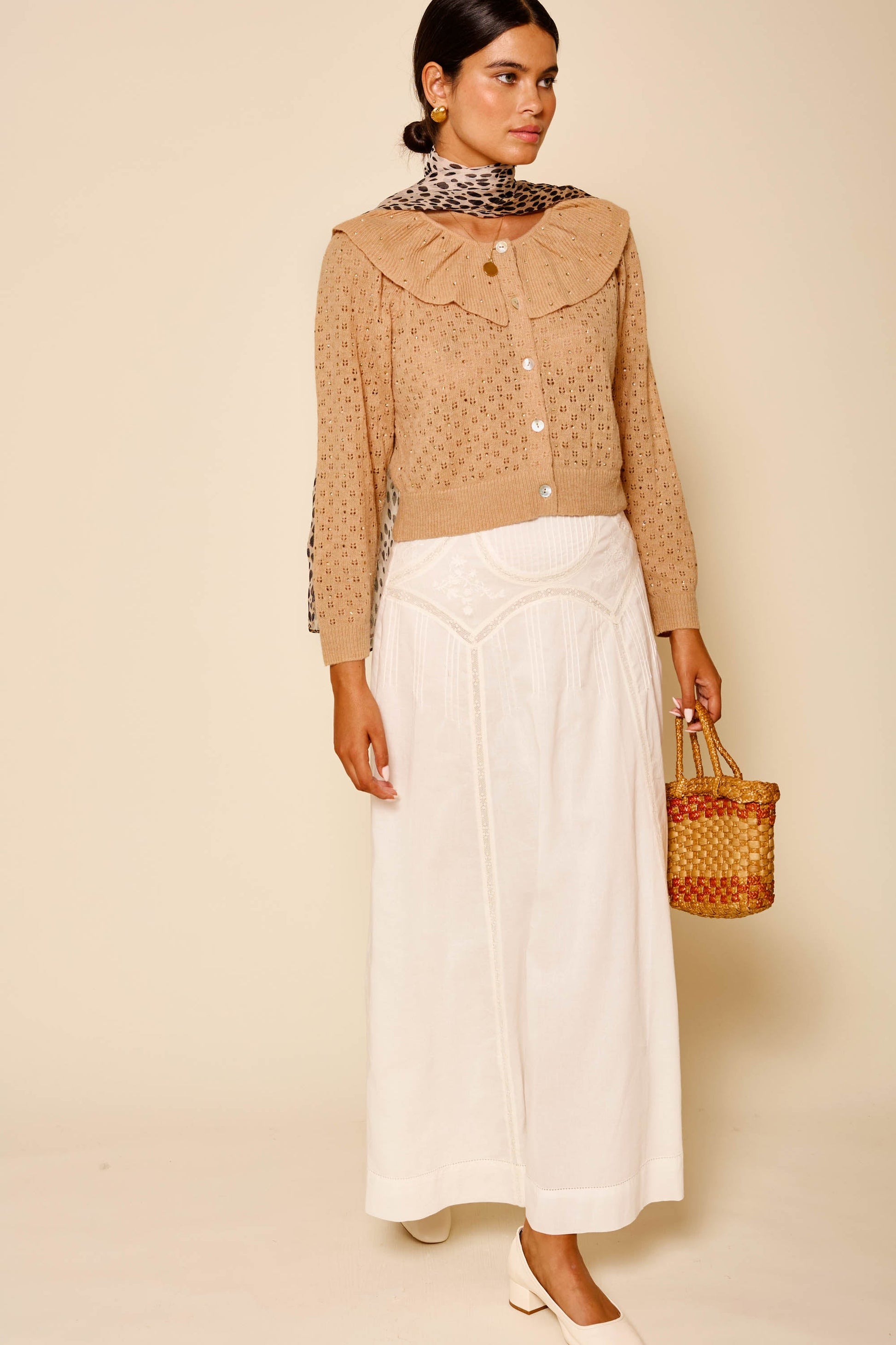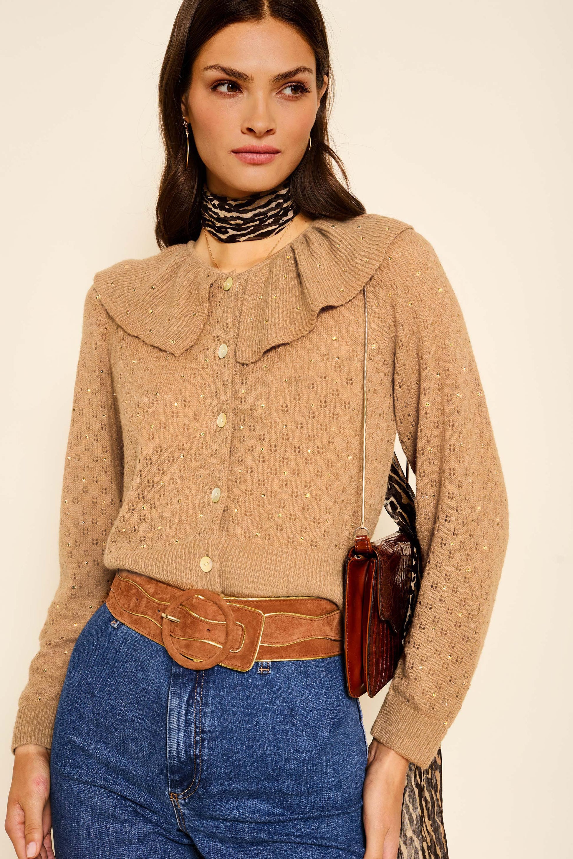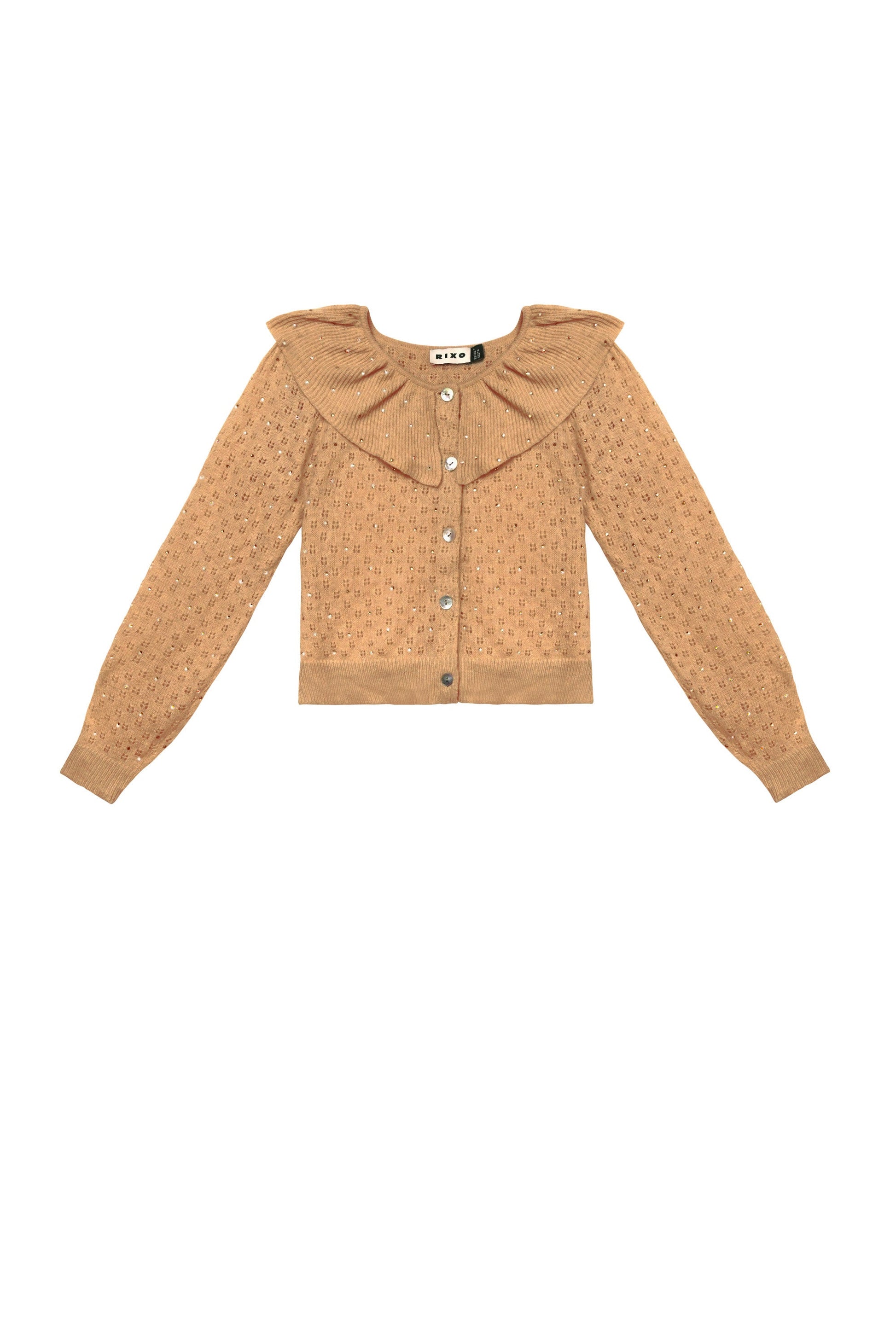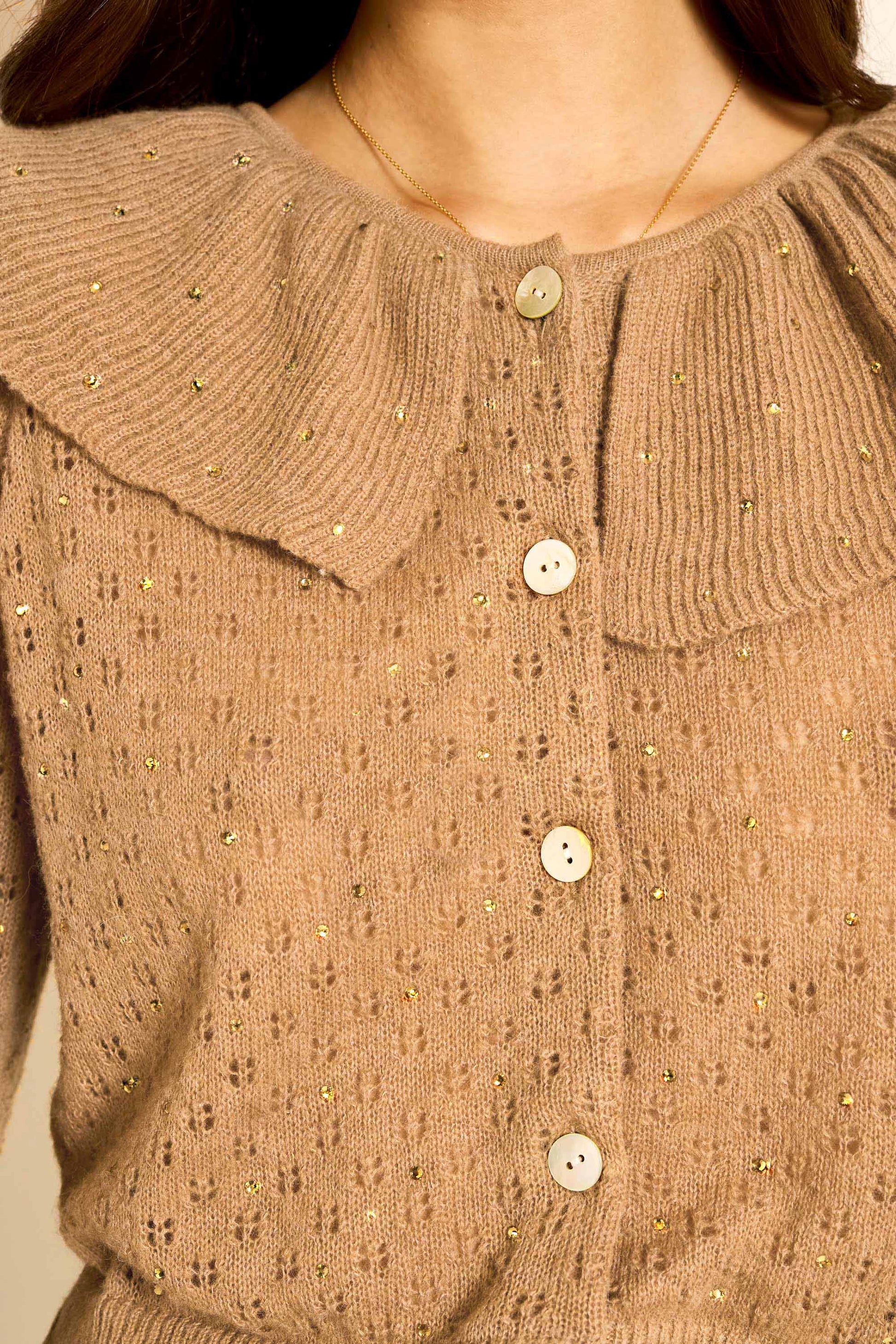 Jelena is the perfect party cardigan - subtle crystals add just the right amount of sparkle. Made from fluffy pointelle-knit, it has a pretty ruffled collar and mother-of-pearl buttons. Wear it as top or cardigan - the boxy shape works for both.