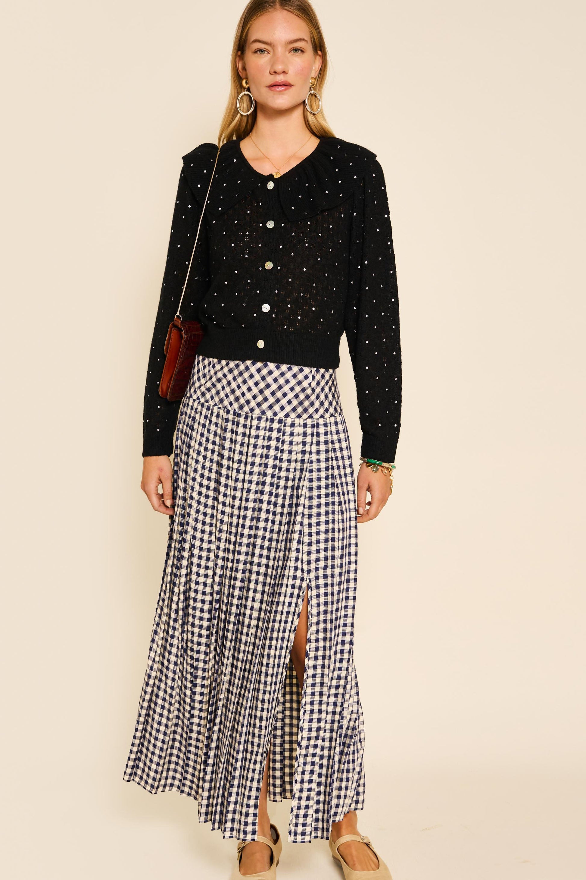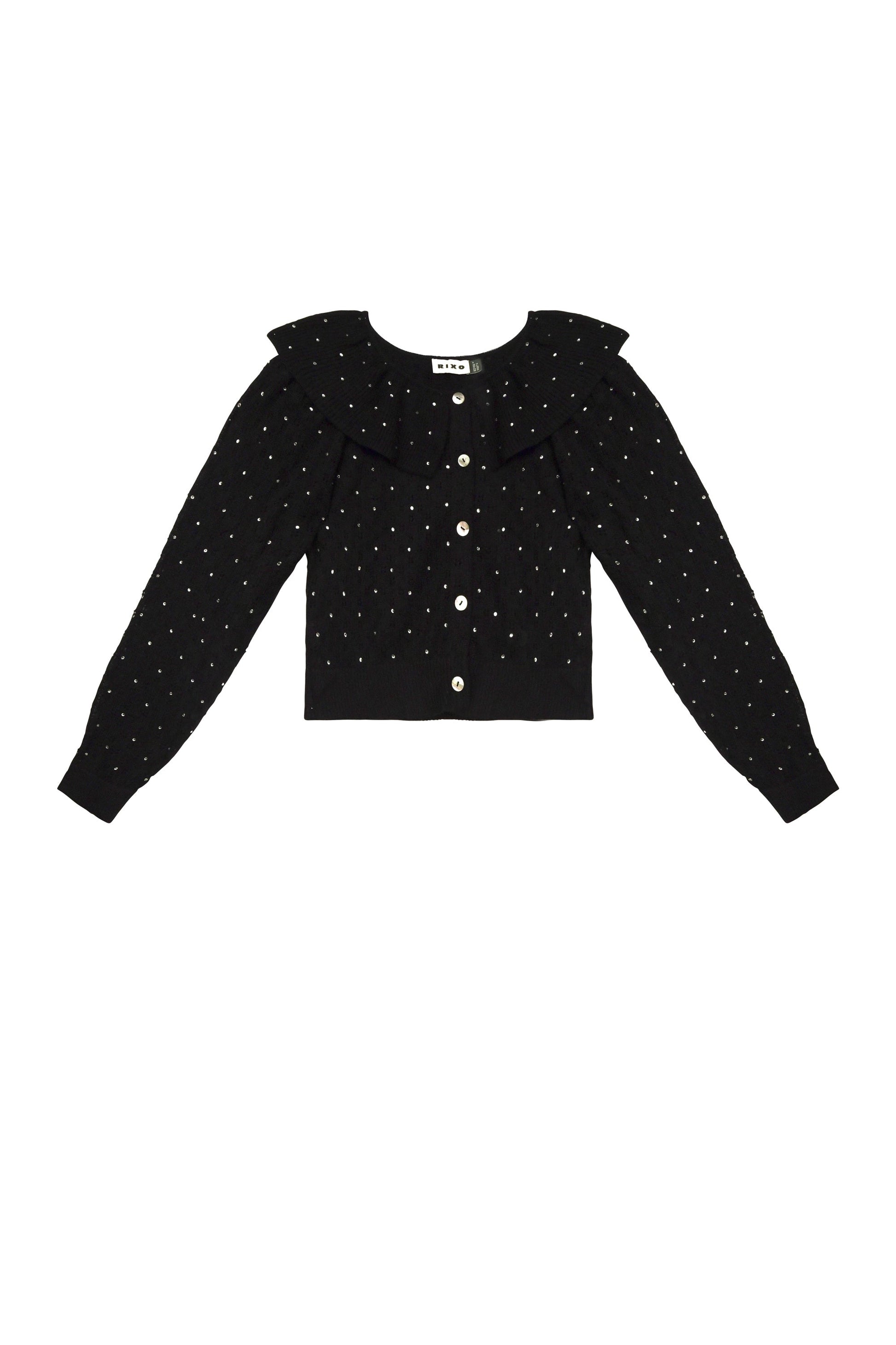 Jelena is the perfect party cardigan - subtle crystals add just the right amount of sparkle. Made from fluffy pointelle-knit, it has a pretty ruffled collar and mother-of-pearl buttons. Wear it as top or cardigan - the boxy shape works for both.