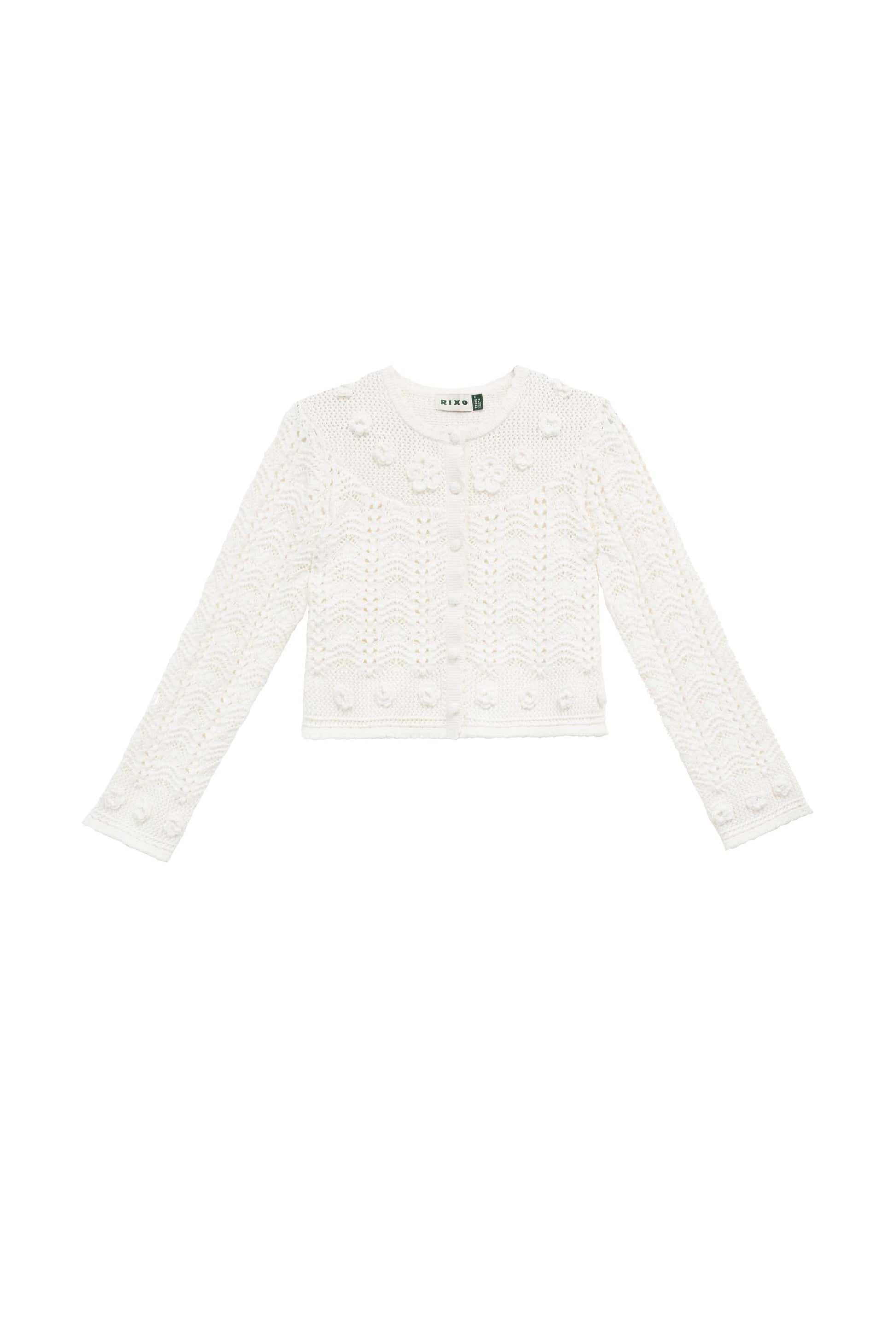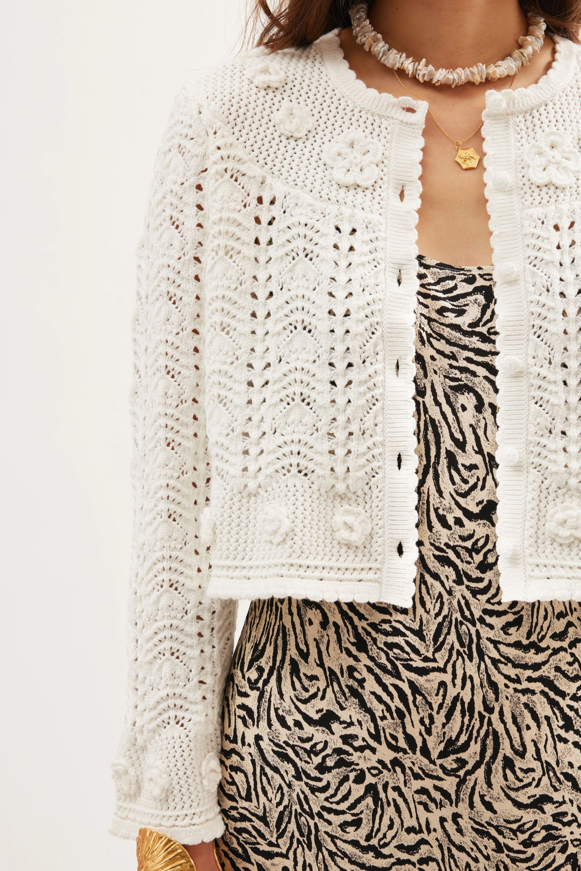 This cotton Kyra cardigan is crocheted for a vintage feel - it's the perfect layer over summer dresses. The pretty flowers are crocheted by hand.