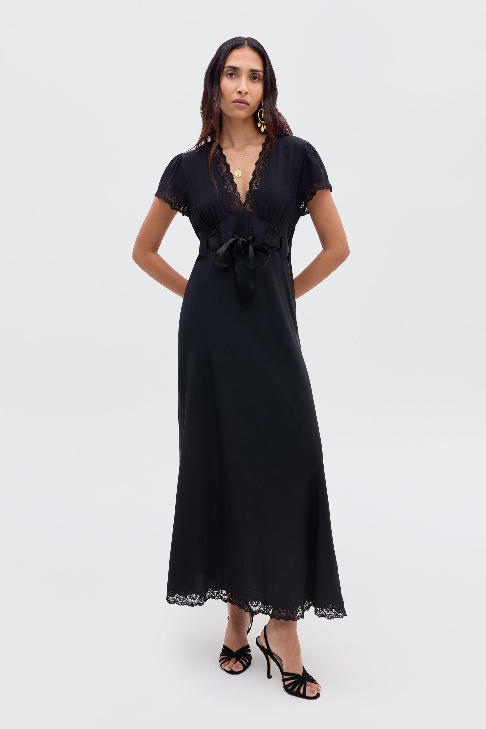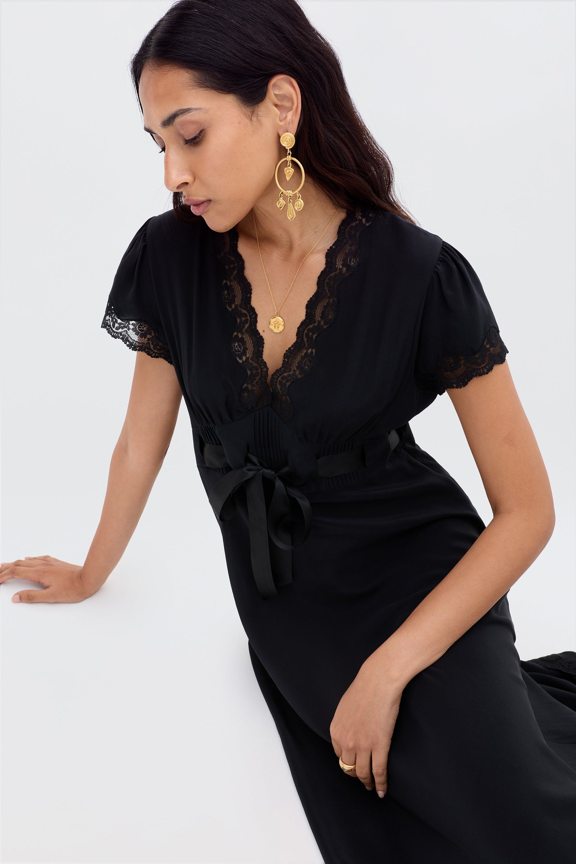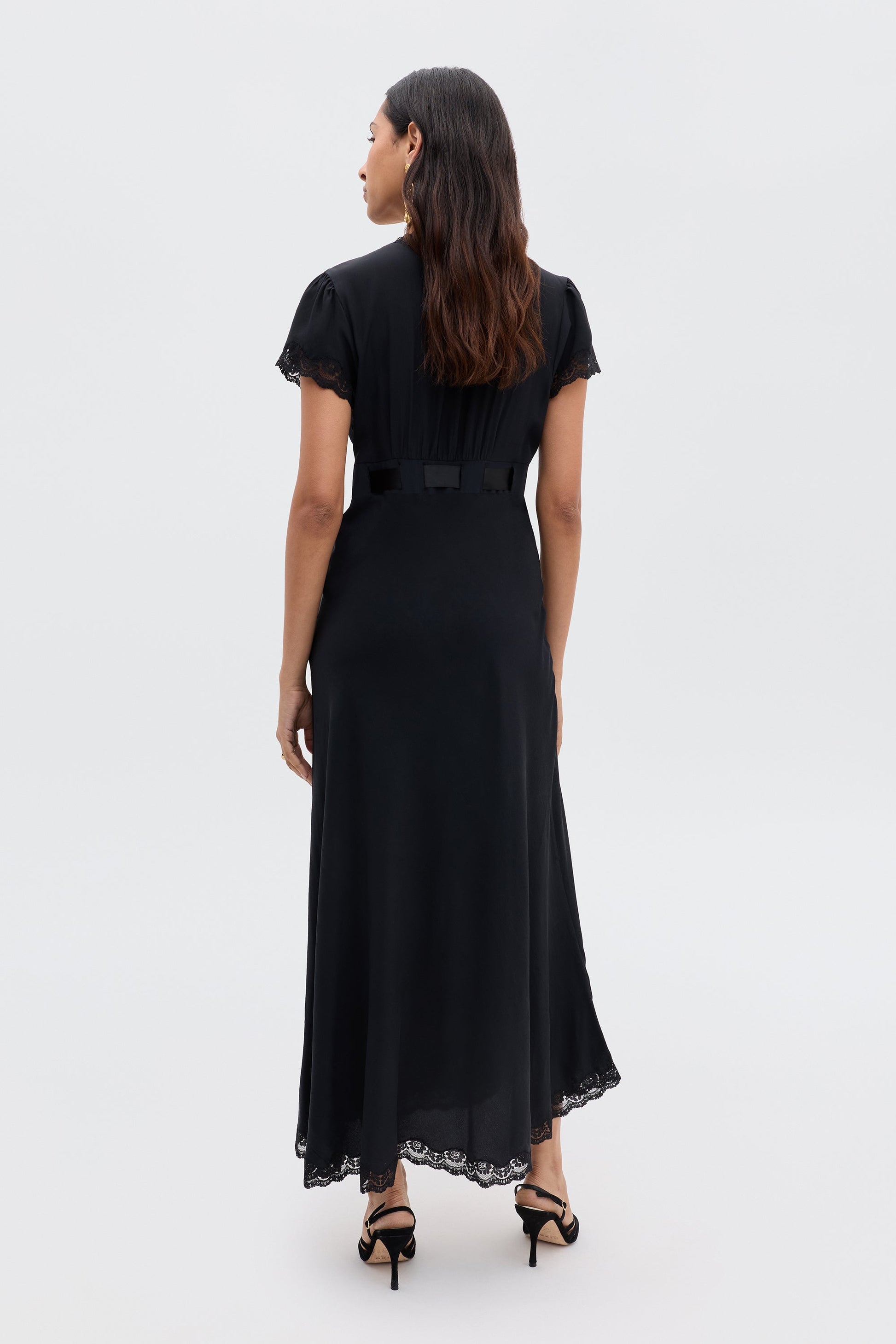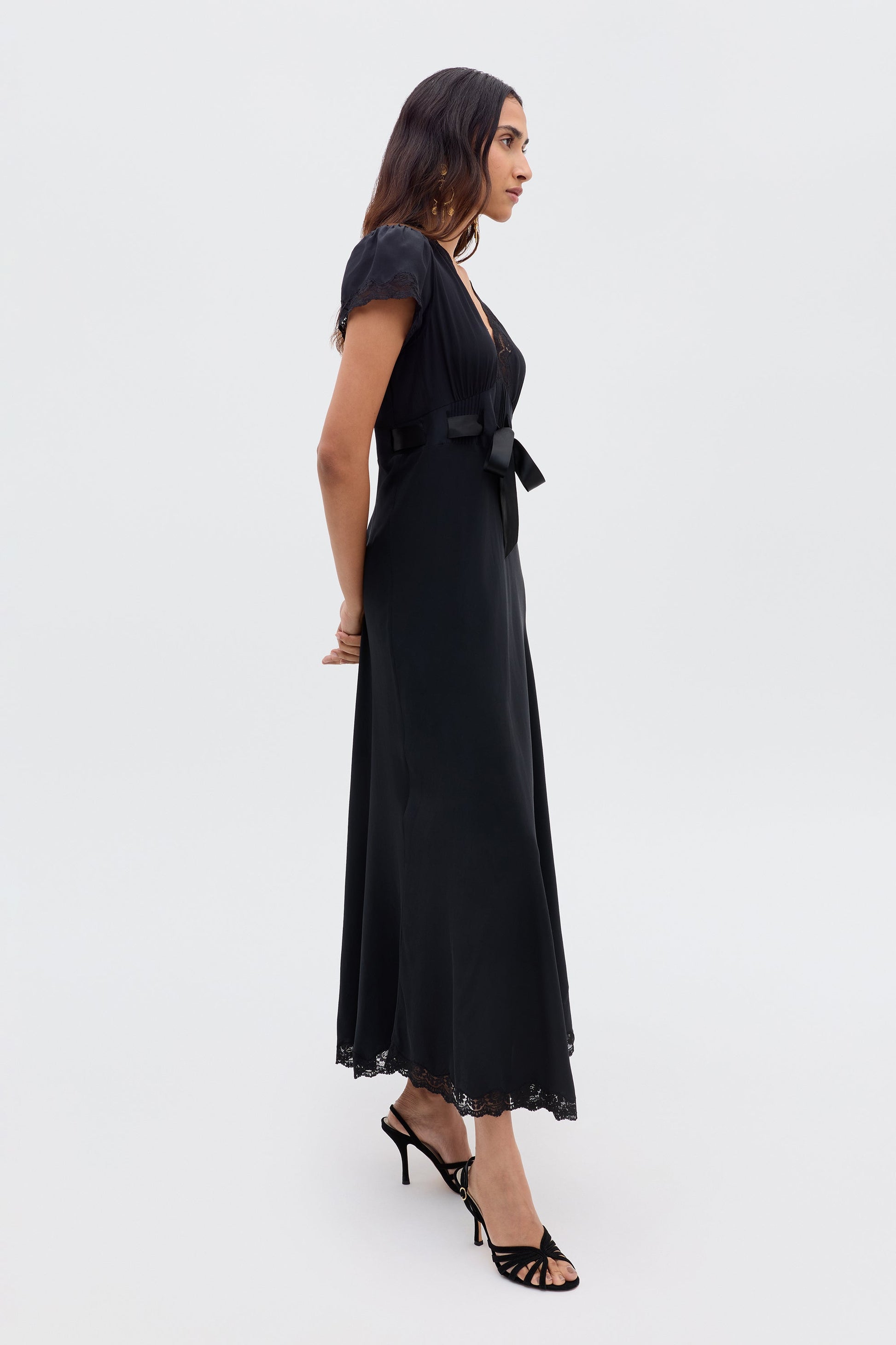For our collaboration with Ciao Lucia, we wanted to create a selection of easy black dresses like this silk Marlice midi. The shape is similar to our Clarice design and the satin bow at the waist is a detail borrowed from the LA-based brand.