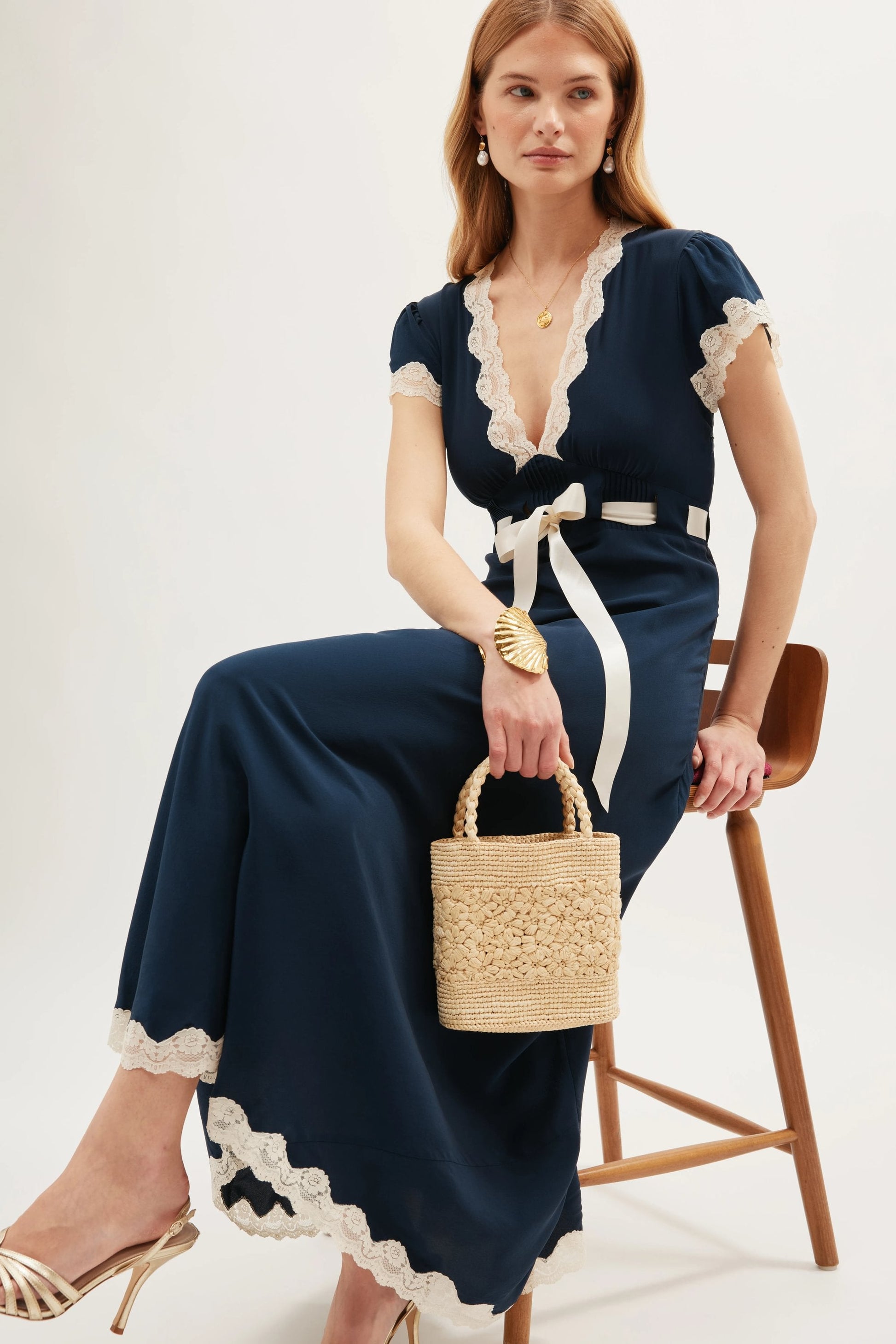 The shape of this Marlice dress is similar to our Clarice design - it's every bit as versatile and easy to wear. We've added a satin bow detail at the waist and pretty lace trims.