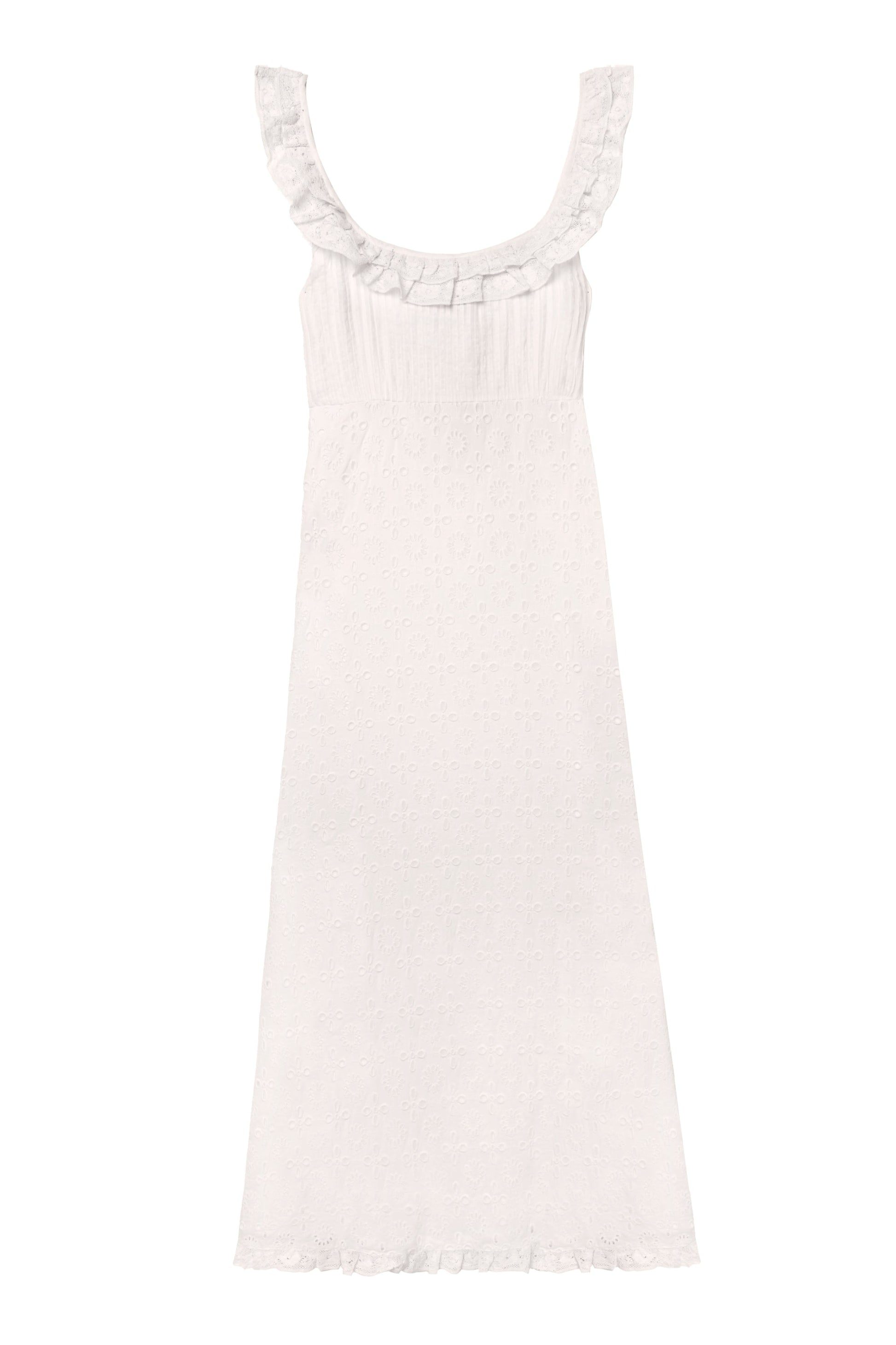 Every wardrobe needs a great white summer dress like this Patsy design. Made from broderie anglaise cotton-voile, it's traced with feminine ruffles and ties in a bow at the back - what's not to love?