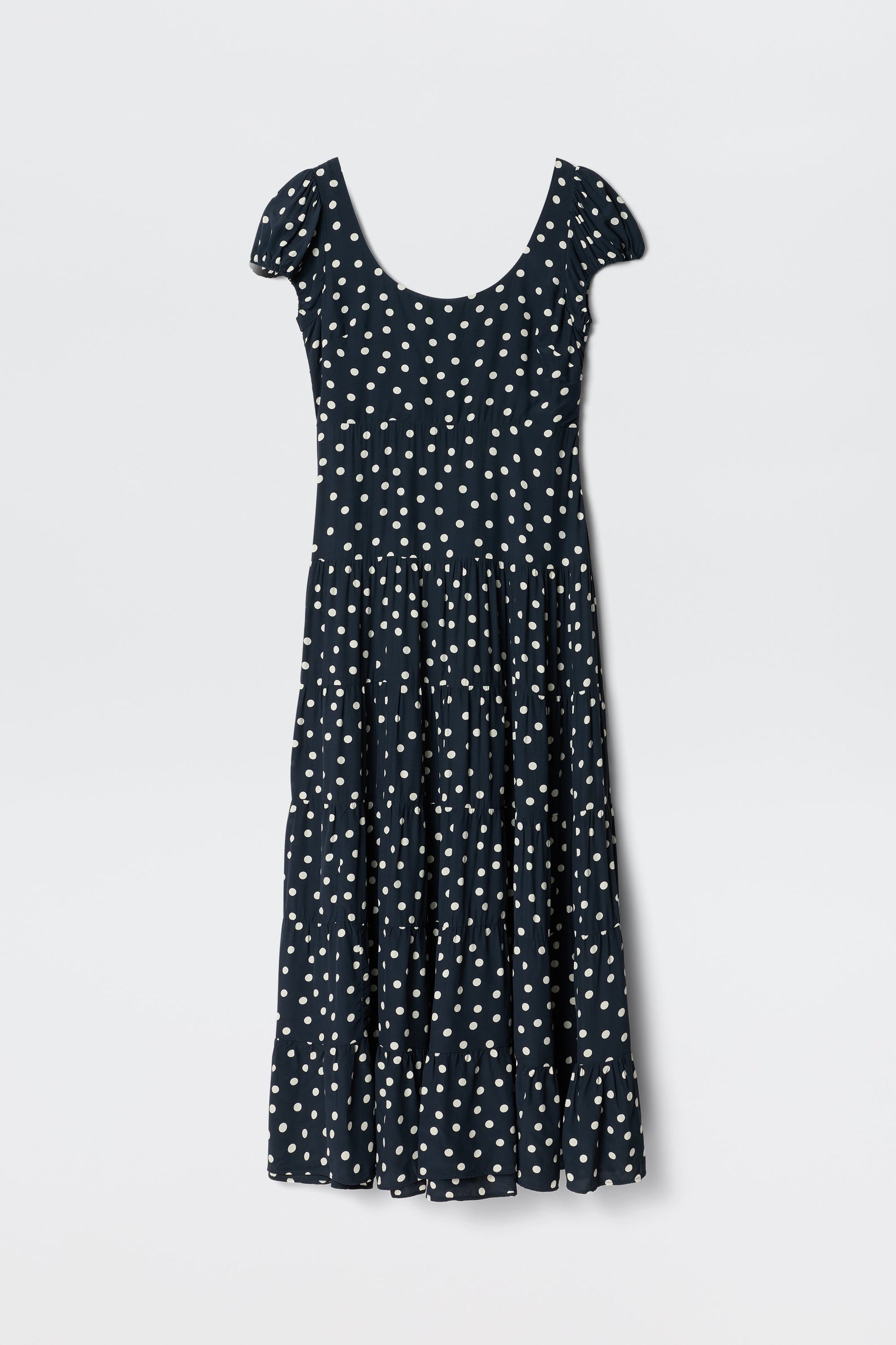 This scoop-neck Remi dress is a new shape for us, and perfect for summer. It has scalloped ruffles through the skirt and puffed cap sleeves. The polka-dot is perfect year round.