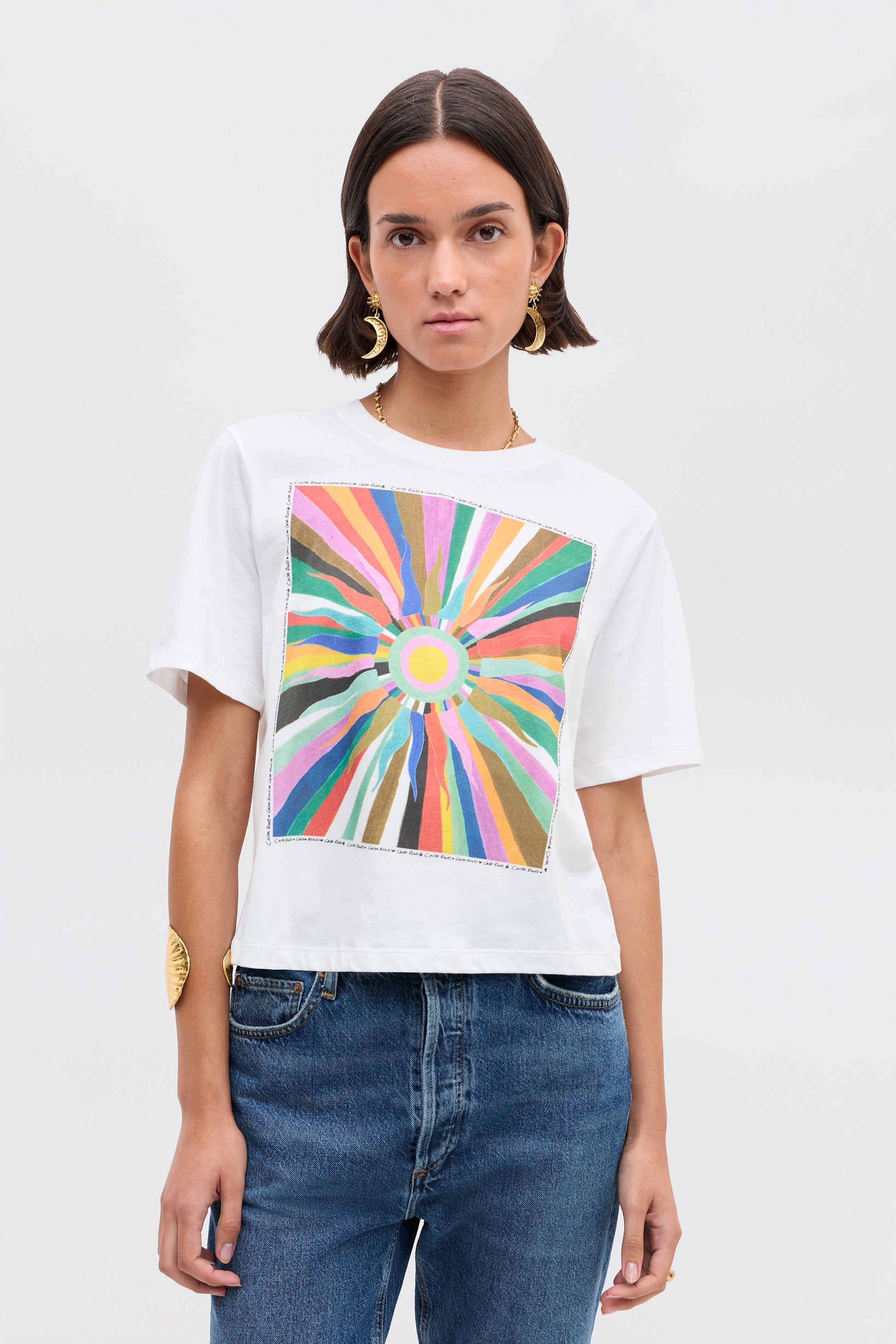 We used a sketch from our latest Casa RIXO collection for this Ria T-shirt. It's made from slightly sheer jersey with a cropped hem that's easy to tuck into your favourite RIXO skirts.