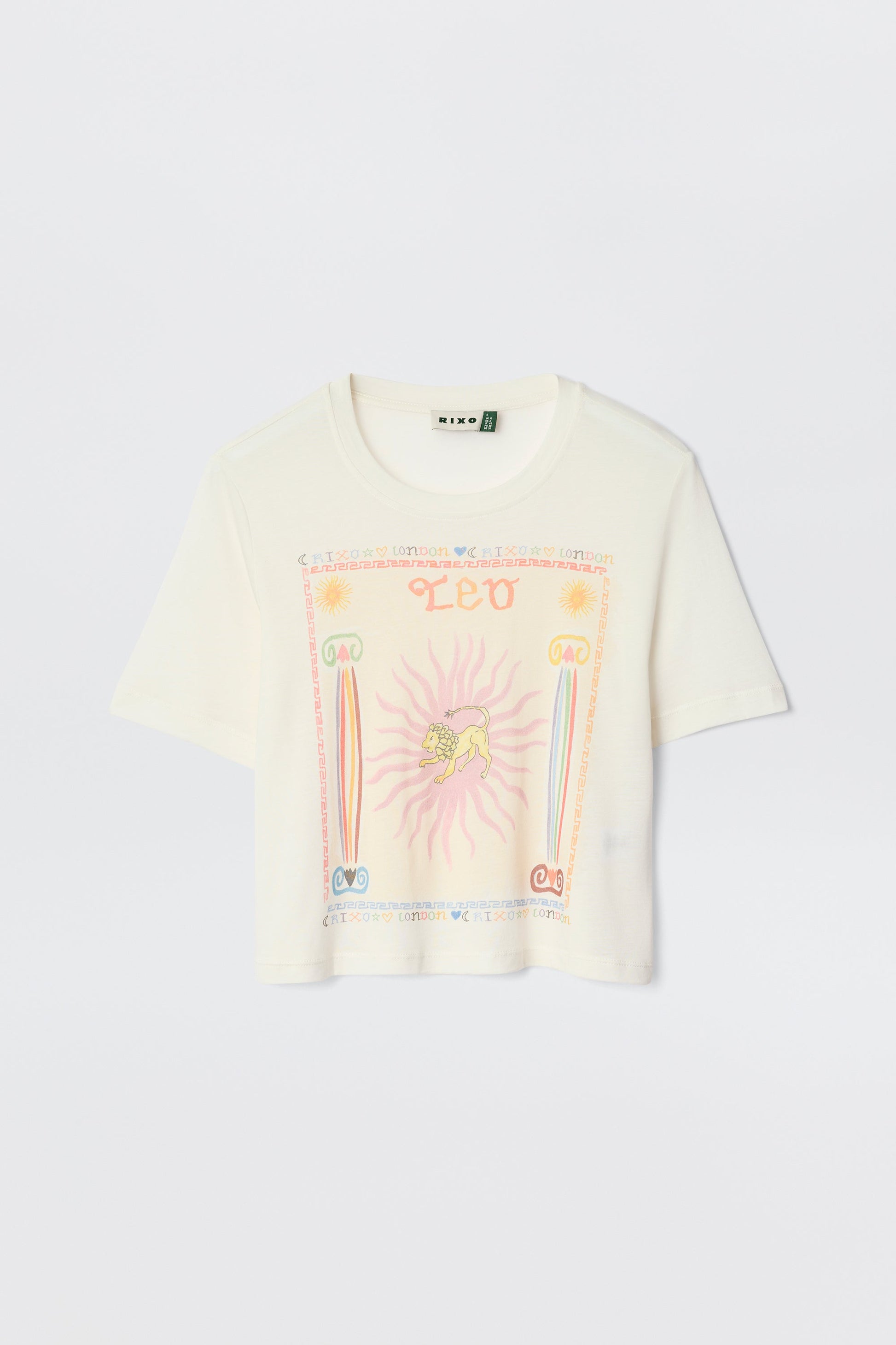 Our Co-founder, Orlagh, sketched this Leo illustration by hand so each Ria T-shirt is unique. It's made from slightly sheer jersey with a cropped hem that's easy to tuck into your favourite RIXO skirts.