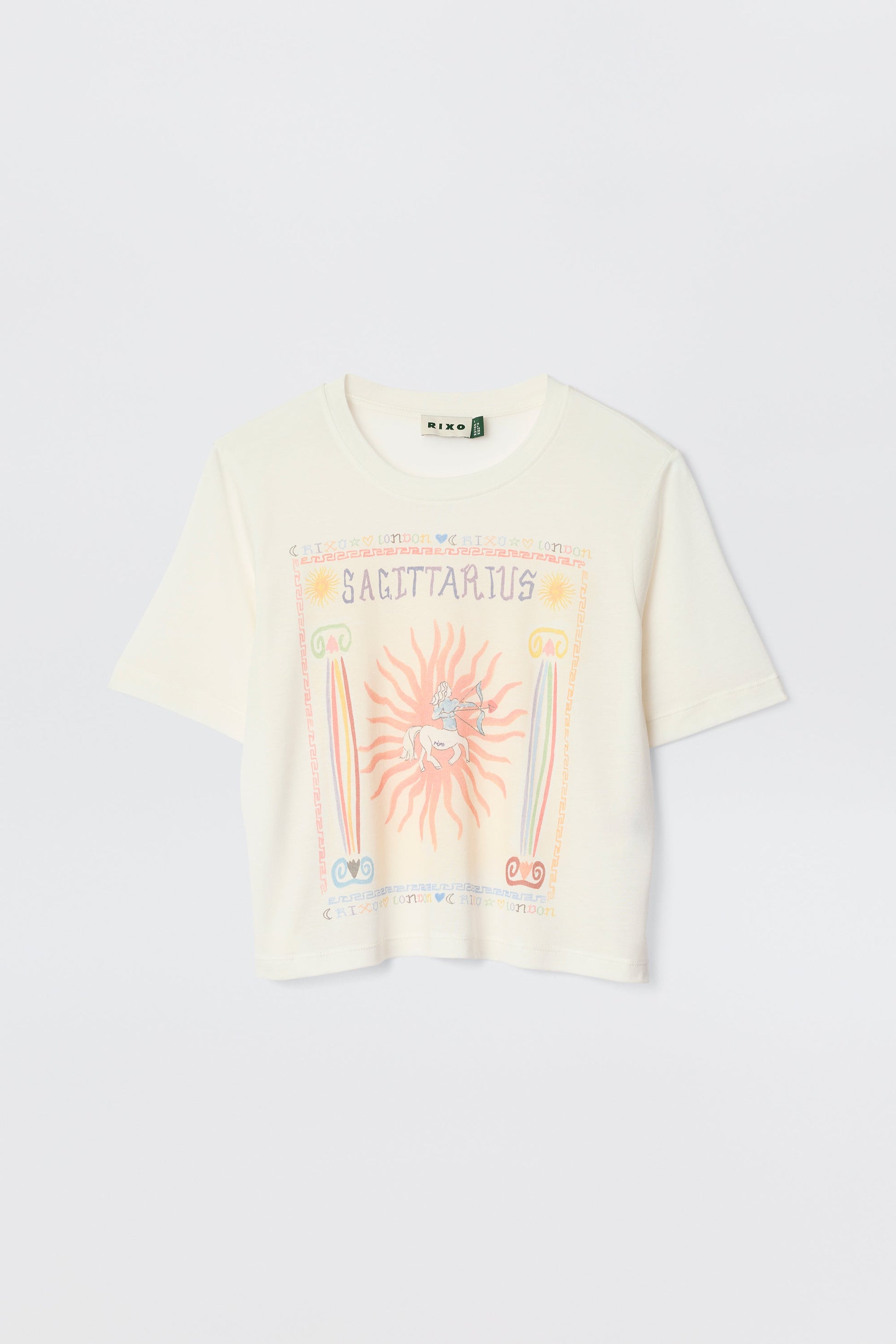 Our Co-founder, Orlagh, sketched this Sagittarius illustration by hand so each Ria T-shirt is unique. It's made from slightly sheer jersey with a cropped hem that's easy to tuck into your favourite RIXO skirts.