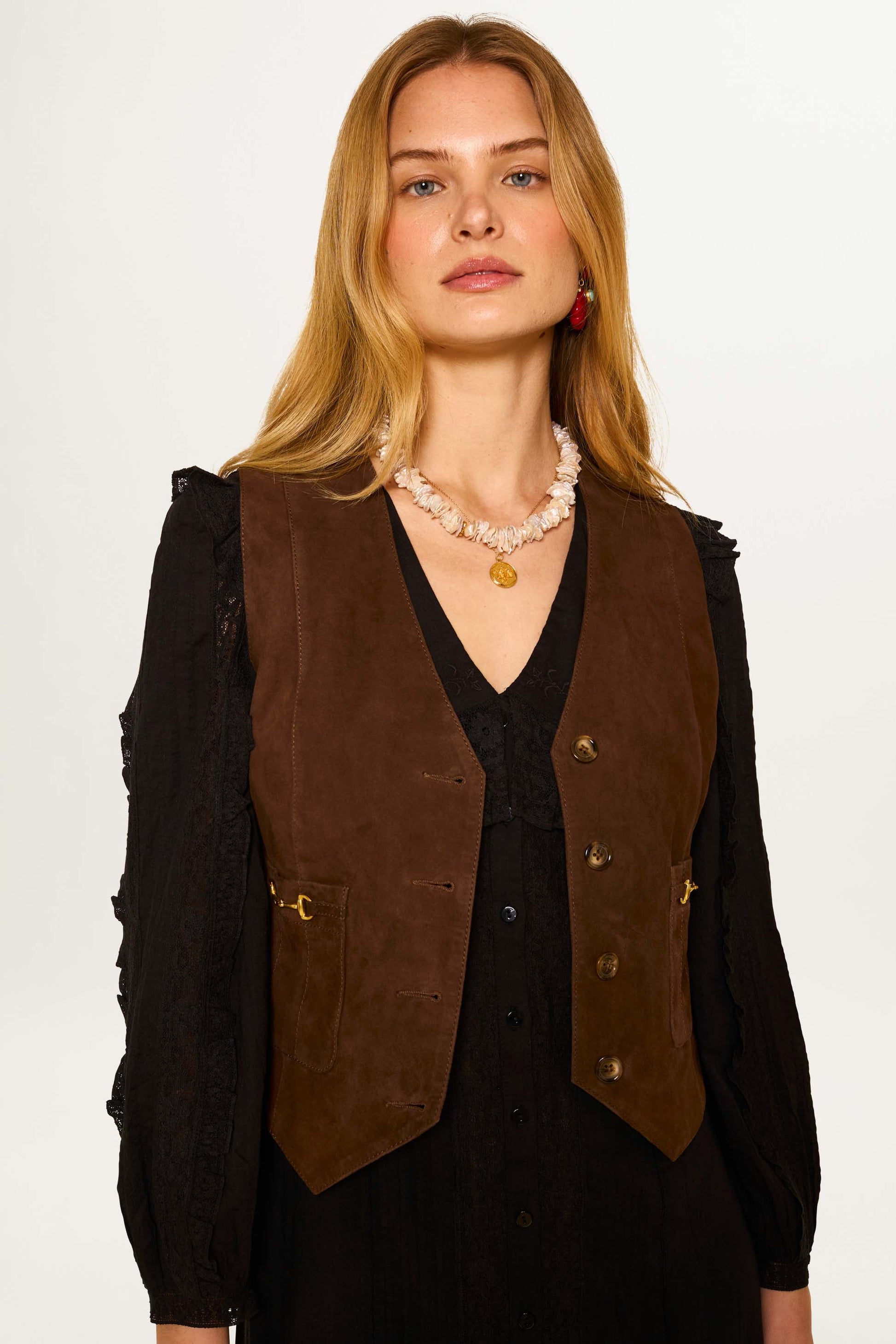 The tan suede gives this Rikki waistcoat an authentic vintage feel - the fabric will get even better with age. Panelled with satin at the back, it's designed for a close fit and detailed with gold snaffles. You may also like Edwina.