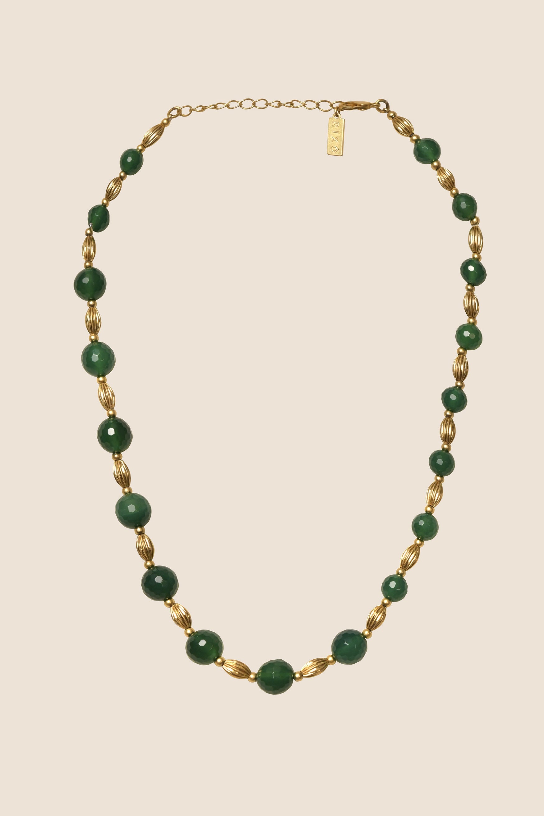 The vintage influence is clear to see in this Romee necklace. It's dotted with engraved gold-tone beads and rich green agate stones, which are faceted so they catch the light.