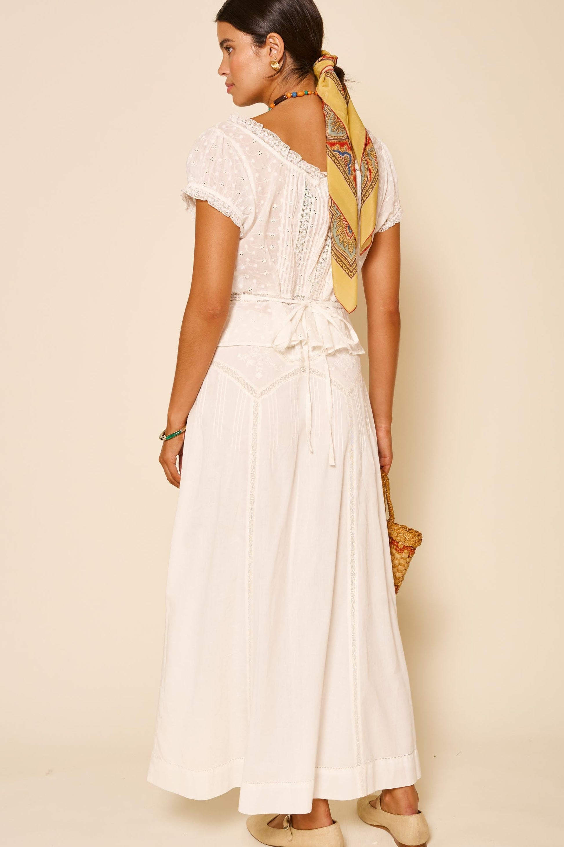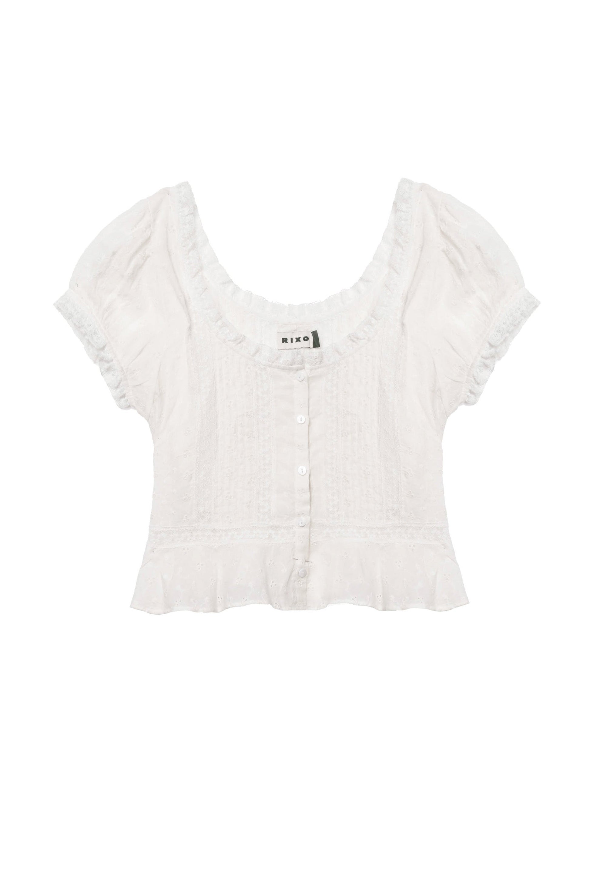 Sandi is made from broderie anglaise cotton with pretty lace inserts. The perfect everyday style, it goes with everything but we love it with our Vienne skirt.