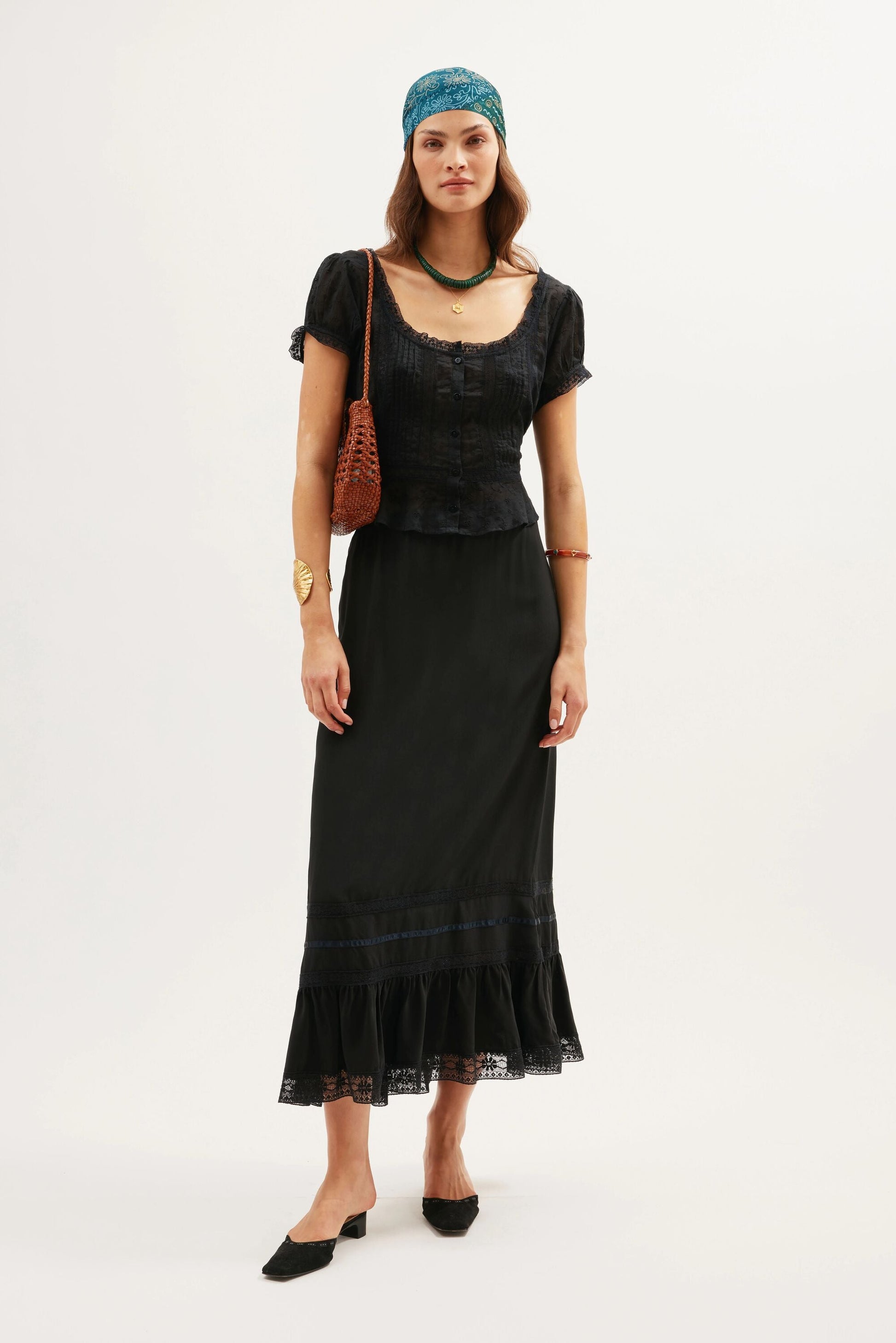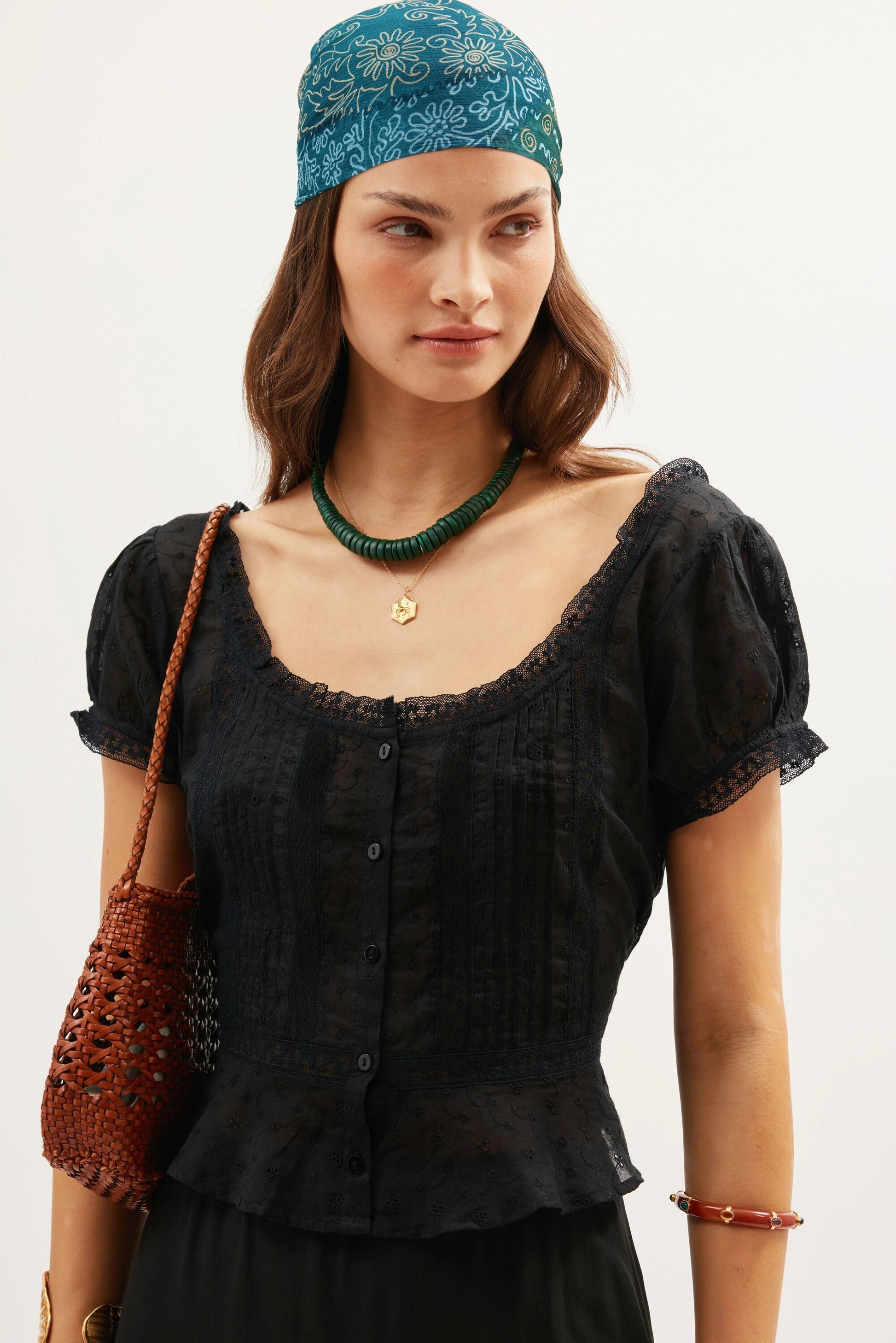 Sandi is made from broderie anglaise cotton with pretty lace inserts. The perfect everyday style, it goes with everything but we love it with our Eilish skirt.