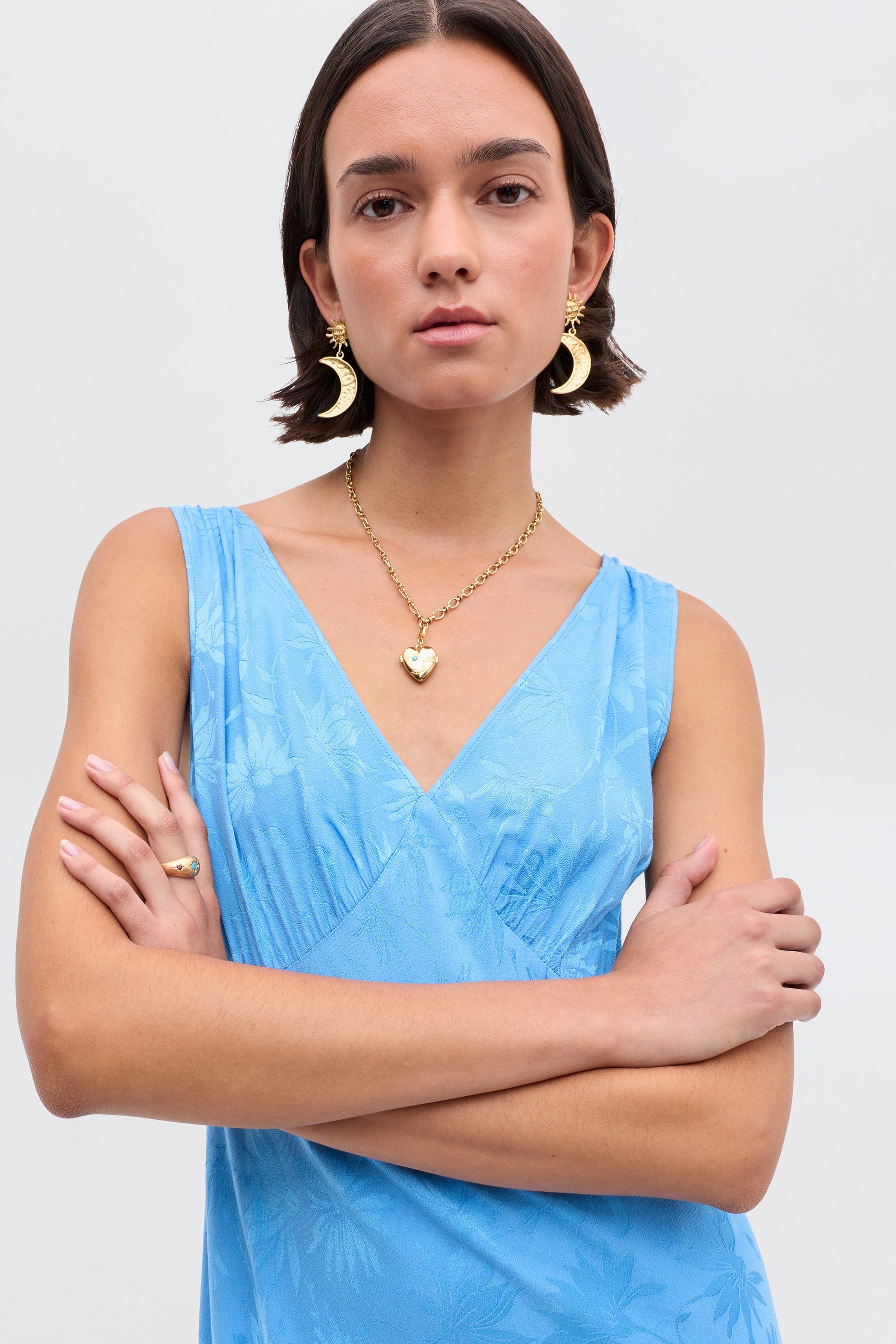 Slinky and sophisticated, this sky-blue Sandrine's daisy jacquard weave and bias cut are inspired by thirties vintage but have timeless appeal. This V-neck midi slip dress is an iconic RIXO style.