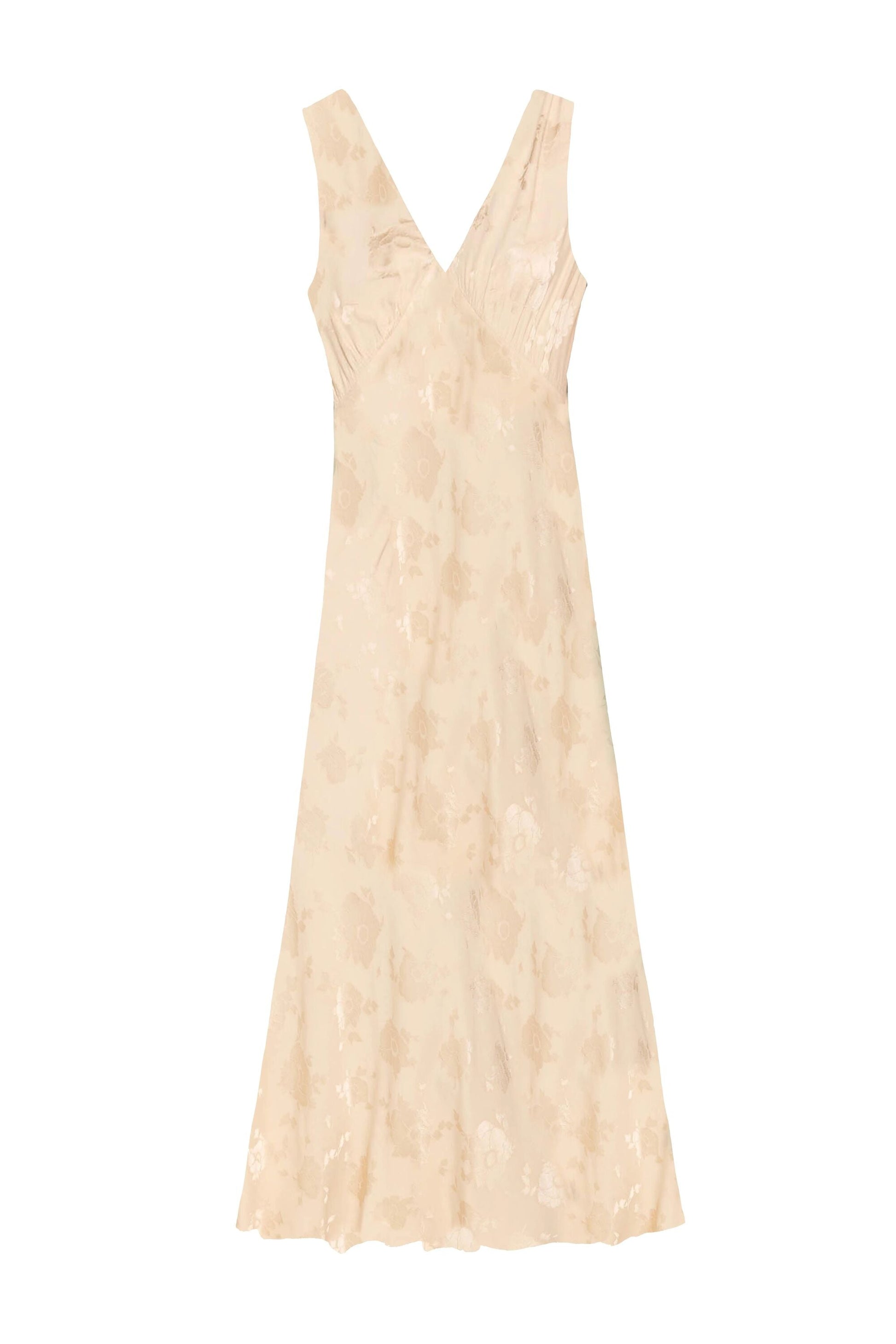 The Sandrine is inspired by thirties vintage styles and has timeless appeal. Her bias-cut Ivory jacquard drapes beautifully and the poppy pattern is our original design.