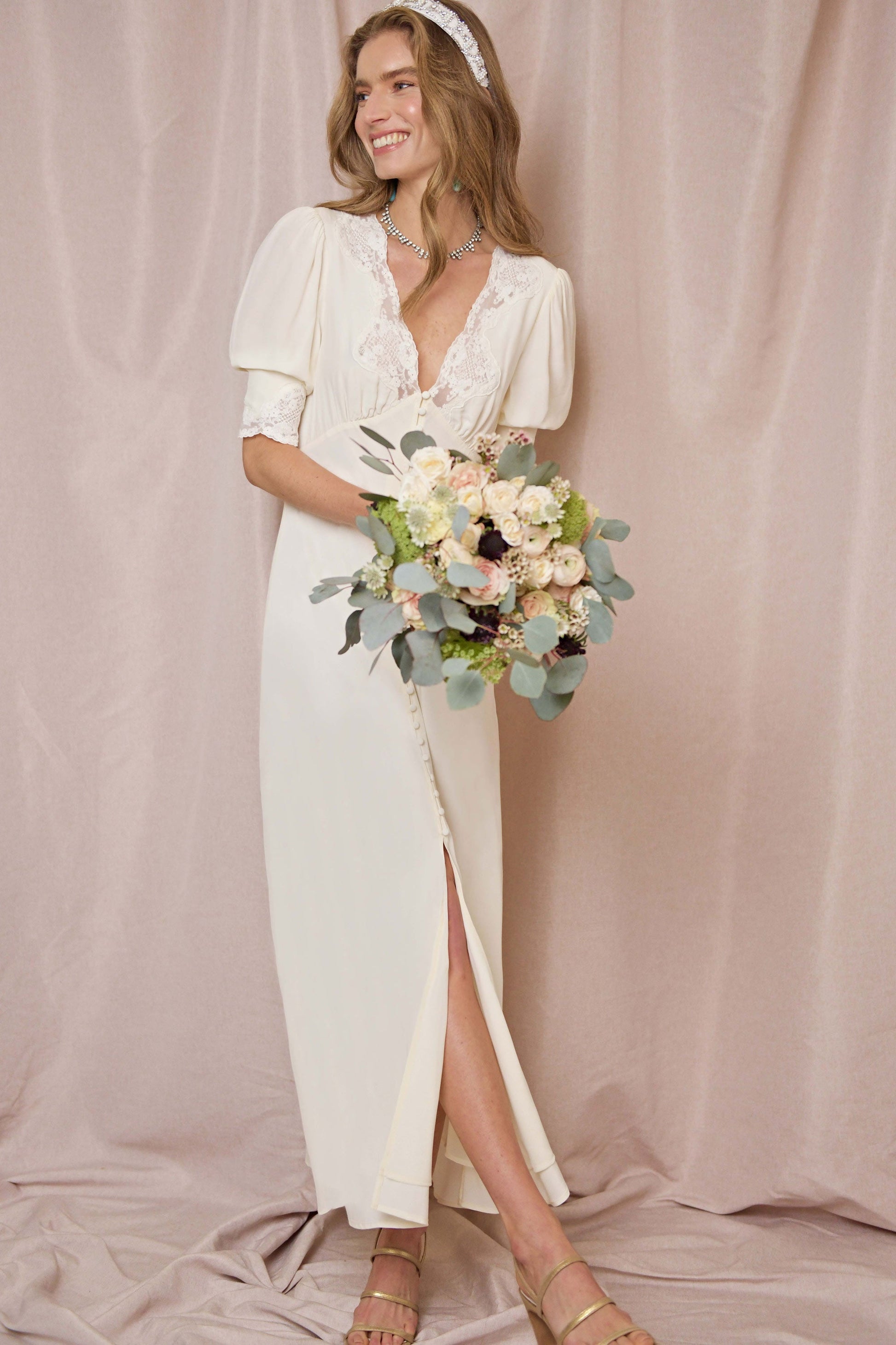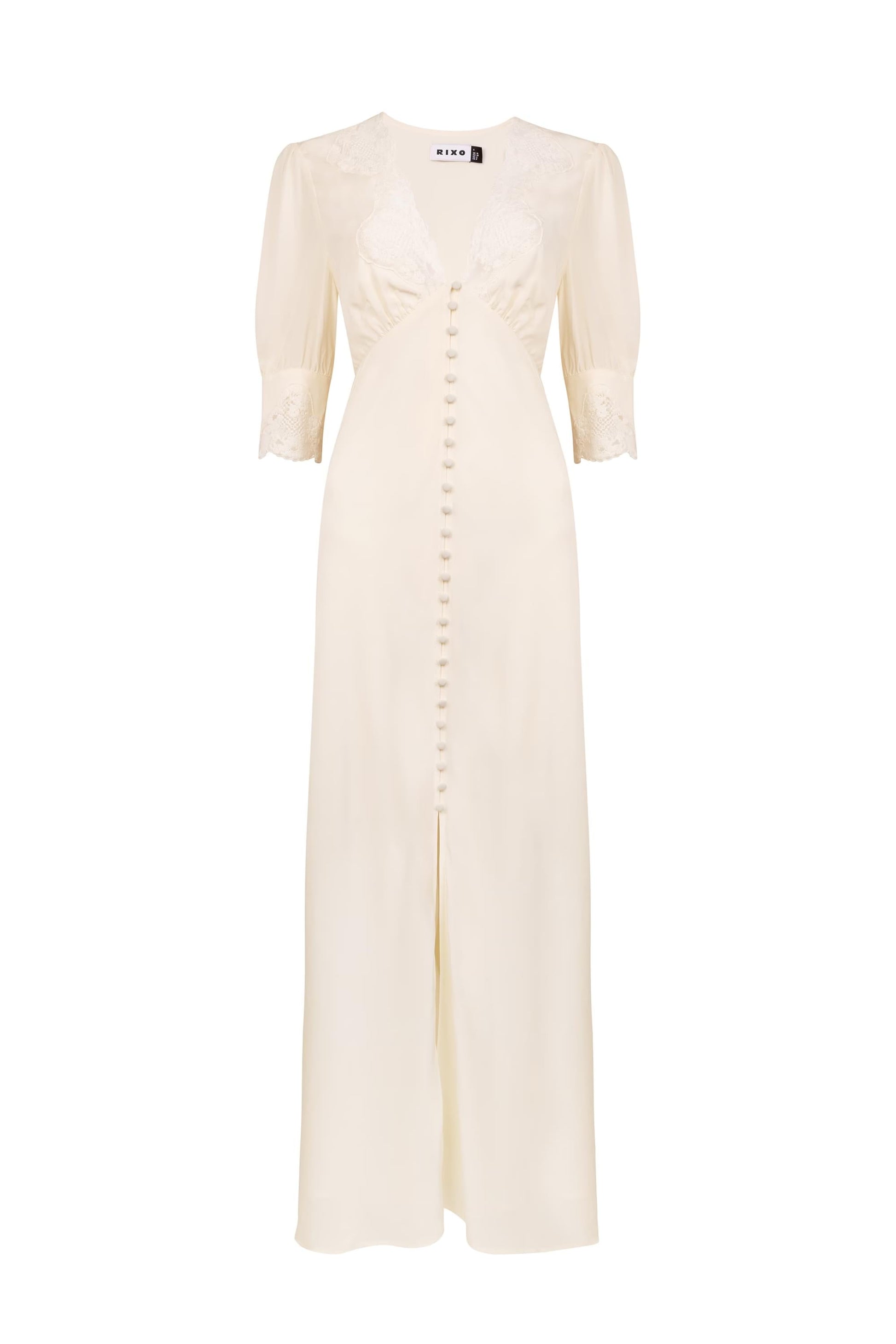 The Simone is an iconic RIXO dress. Her ivory bridal style is cut on the bias from luxurious satin-back crepe, so hangs loosely along the body’s lines and falls fluidly. She is trimmed with antique-style lace at her sleeve trims and V-neckline.