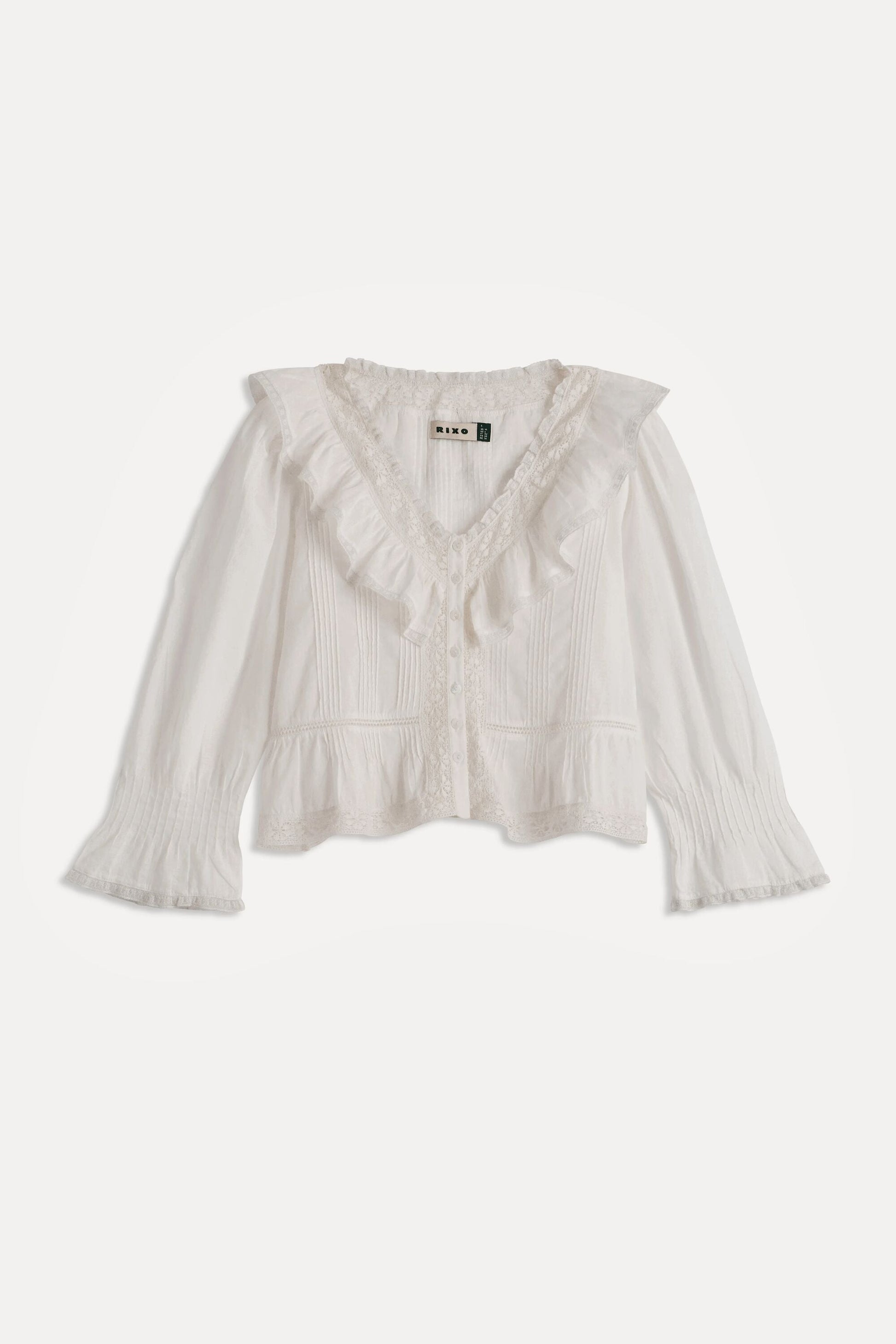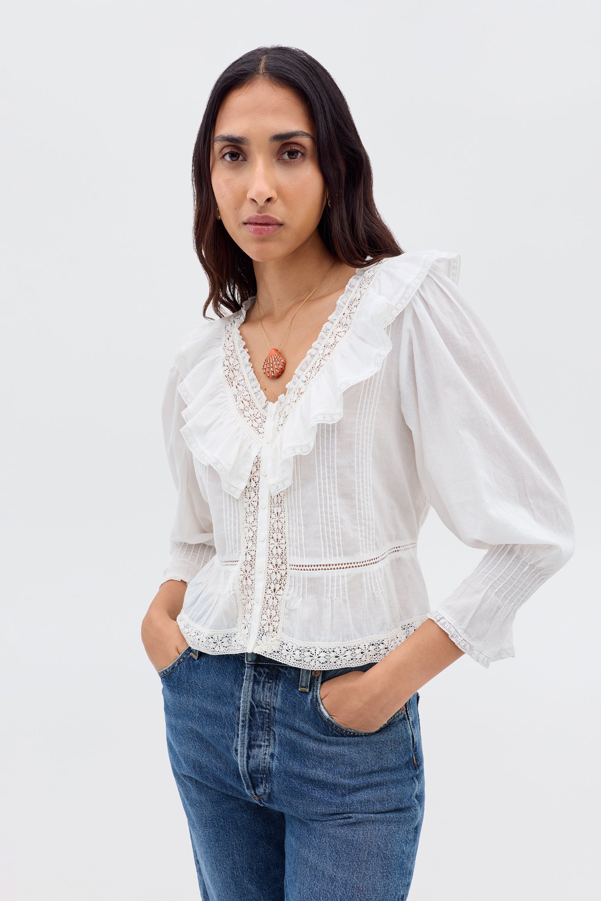 We live in our vintage-inspired blouses - they go with everything, from printed skirts to jeans. This Solene style has a pretty ruffled V-neckline and elasticated panels at the sleeves that create a puffed shape.