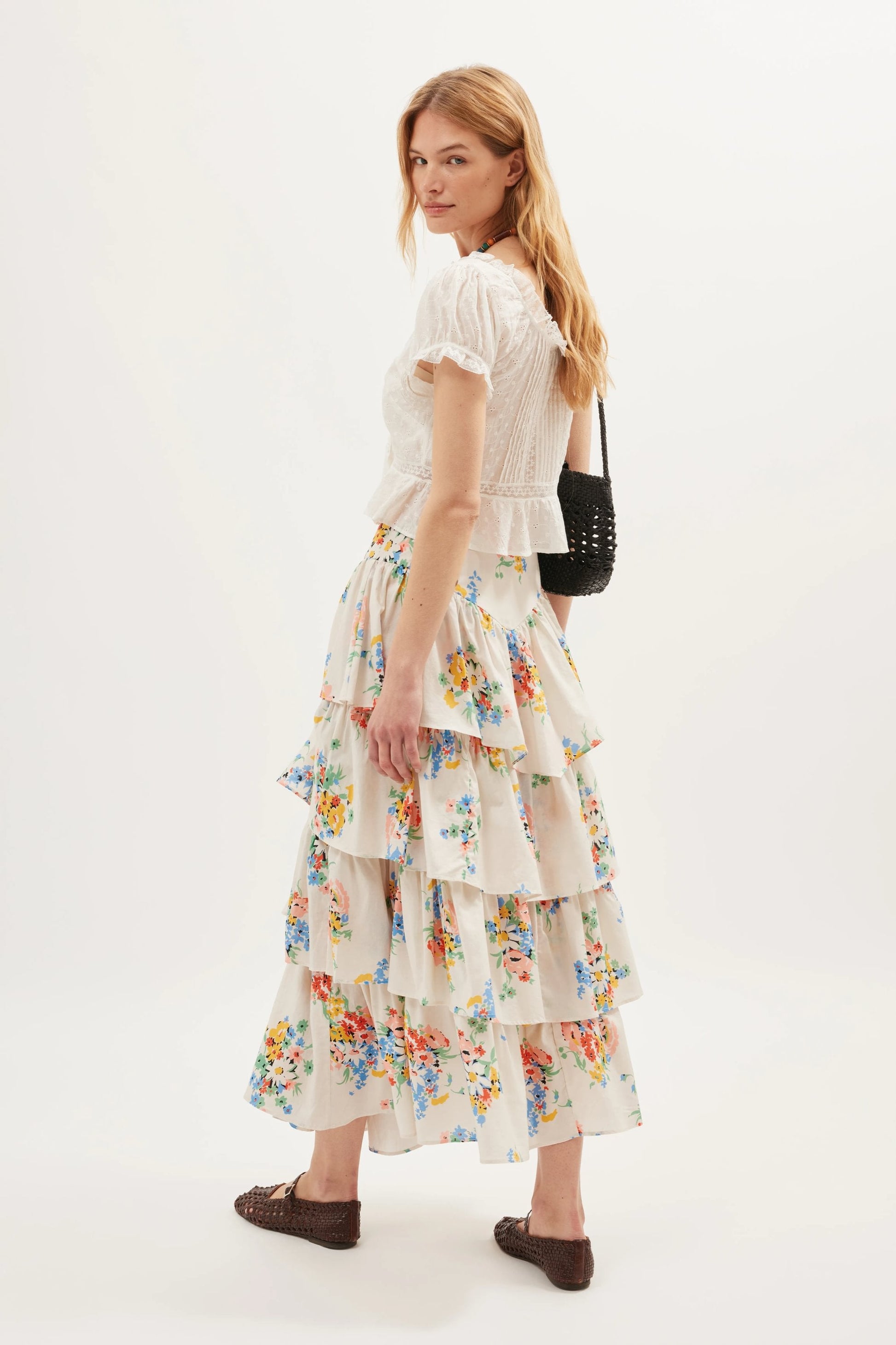 This tiered Taryn skirt is a new shape, inspired by existing RIXO samples we reworked. The Darcie print is the perfect vintage-inspired ditsy floral.