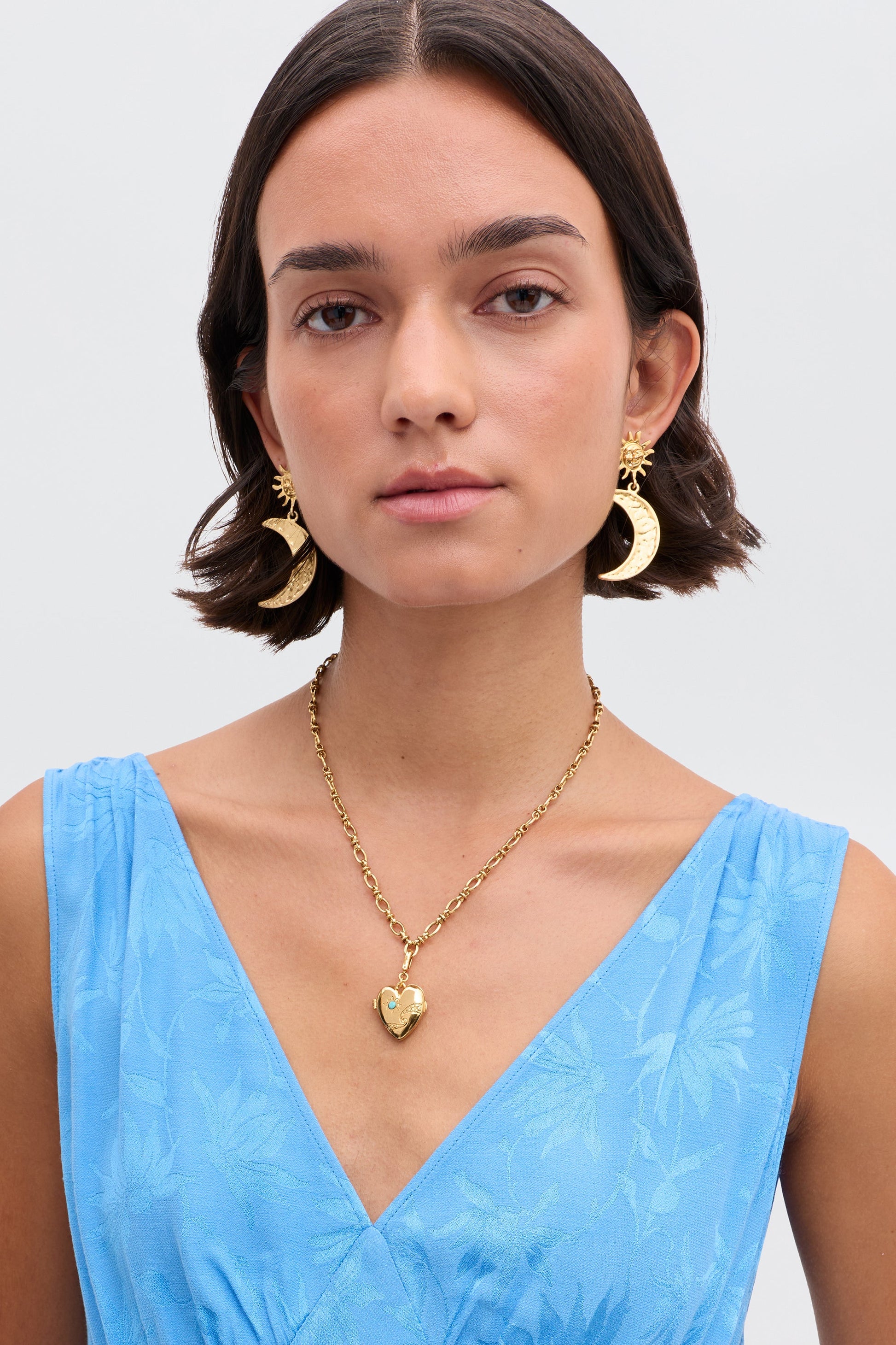 Our Verya Charm was inspired by one of our Co-Founders vintage finds. Engraved with a cosmic-inspired design and a star embellished with a blue gemstone, it's the sweetest locket to keep photos of those you love close.