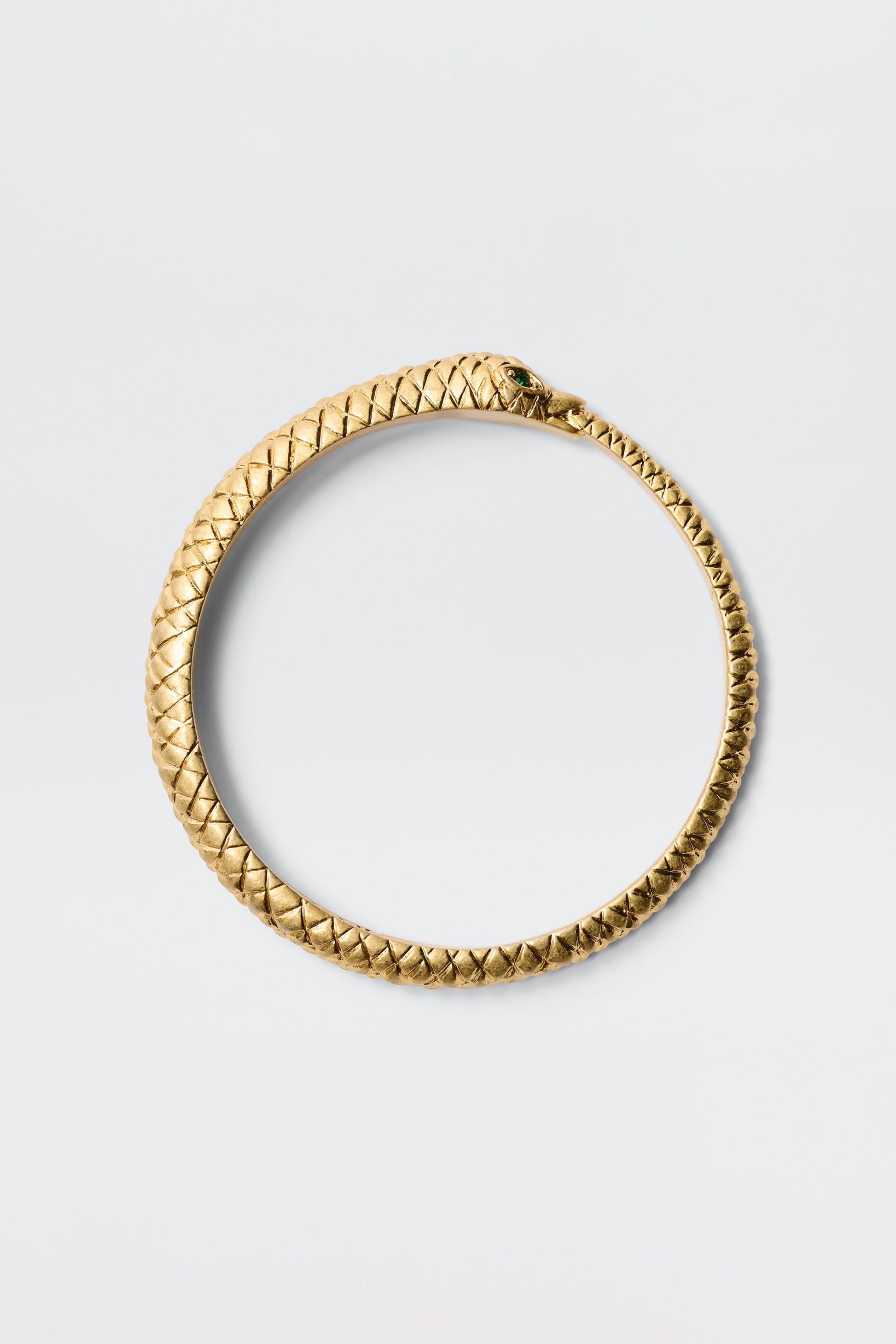 This Viera bangle is designed to be pushed up your arm, so the snake design coils around it. It's made from 18-karat gold-plated metal in an antique finish, with green resin stones for the eyes.